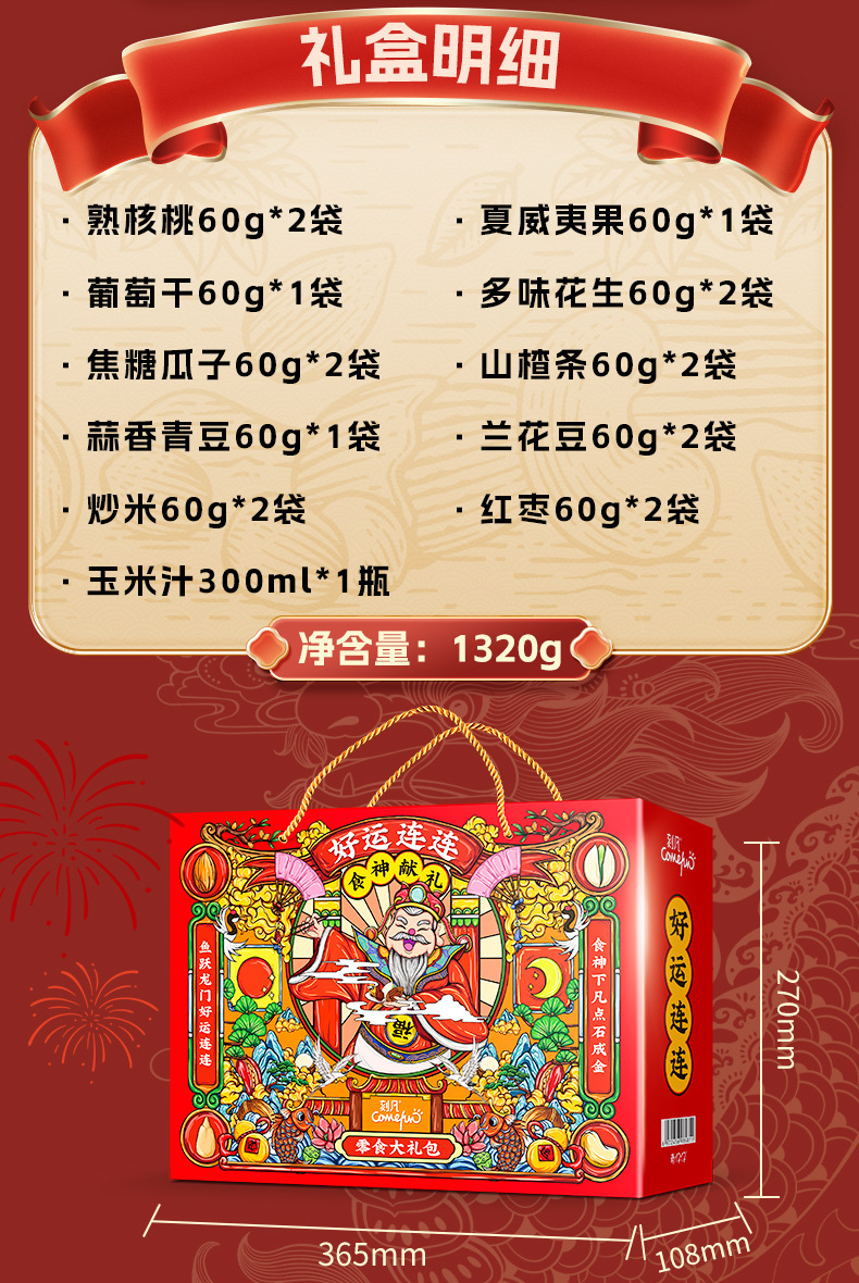 【十七包大容量,尽在国潮年礼!】刻凡年货坚果礼盒 好运连连1320g 蛇年国潮年货坚果礼盒 坚果炒货零食 每一袋零食都经过严格筛选和检验 确保品质卓越 让您放心享用-QQ