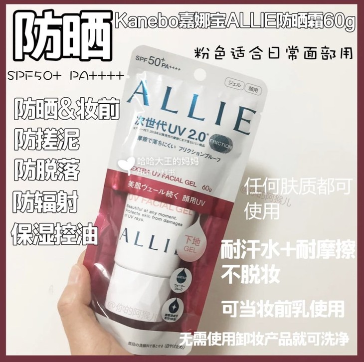 嘉娜宝ALLIE防晒霜#粉色60g/#绿色90g👍说起防晒,一生推当然是嘉娜宝防晒啦😘,它可是日本药妆店的断货王!这款防晒将物理防晒和化学防晒两者结合在了一起👏,全新升级版本,让防摩擦技术更上一层楼⬆,可以说是怎么蹭都蹭不掉的防晒了👯。💖#粉色控油款,喜欢清爽哑光感防晒的宝宝就不要错过啦,控油力强超适合夏天☀,推荐偏油肌肤/💚#绿色保湿款,干皮或者爱好自然光泽肌妹子的福音✨,推荐偏干肌肤。