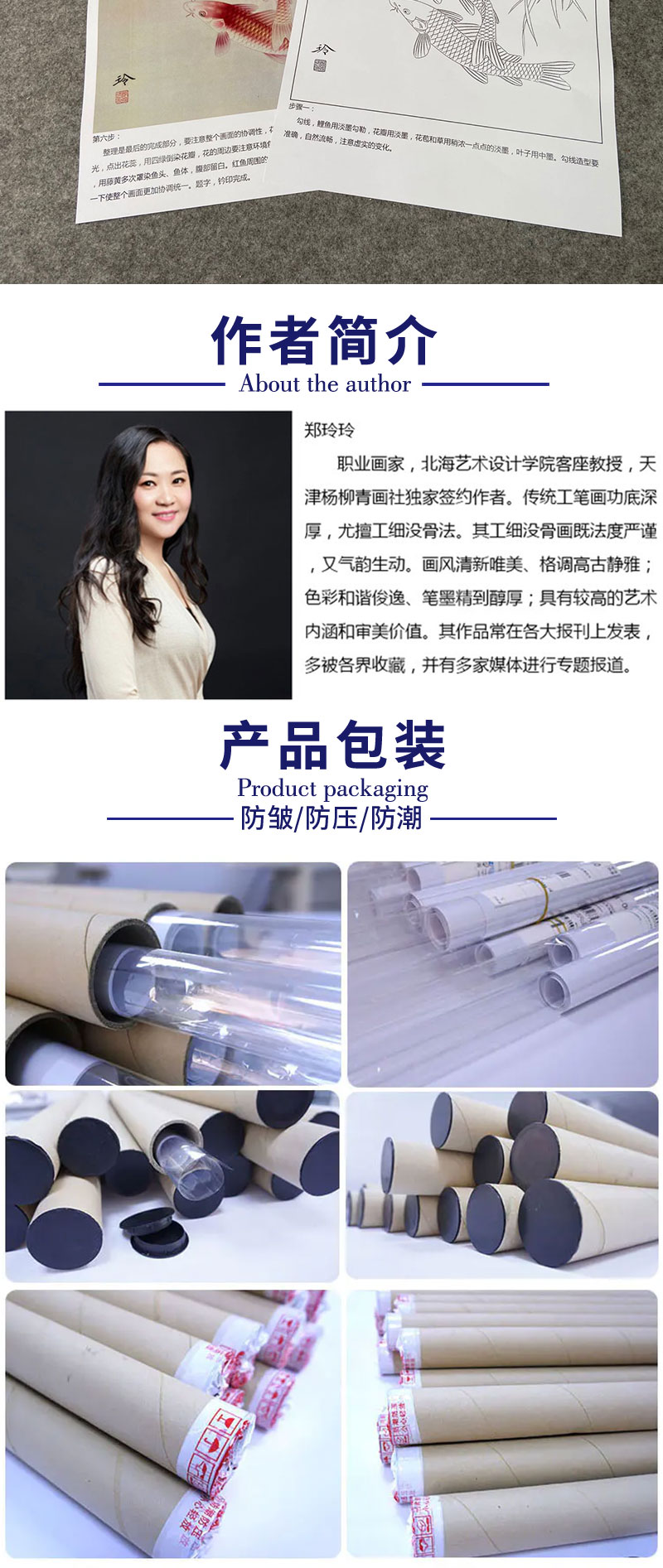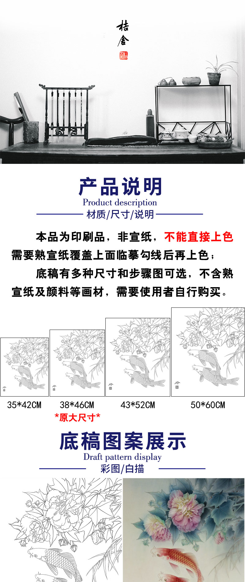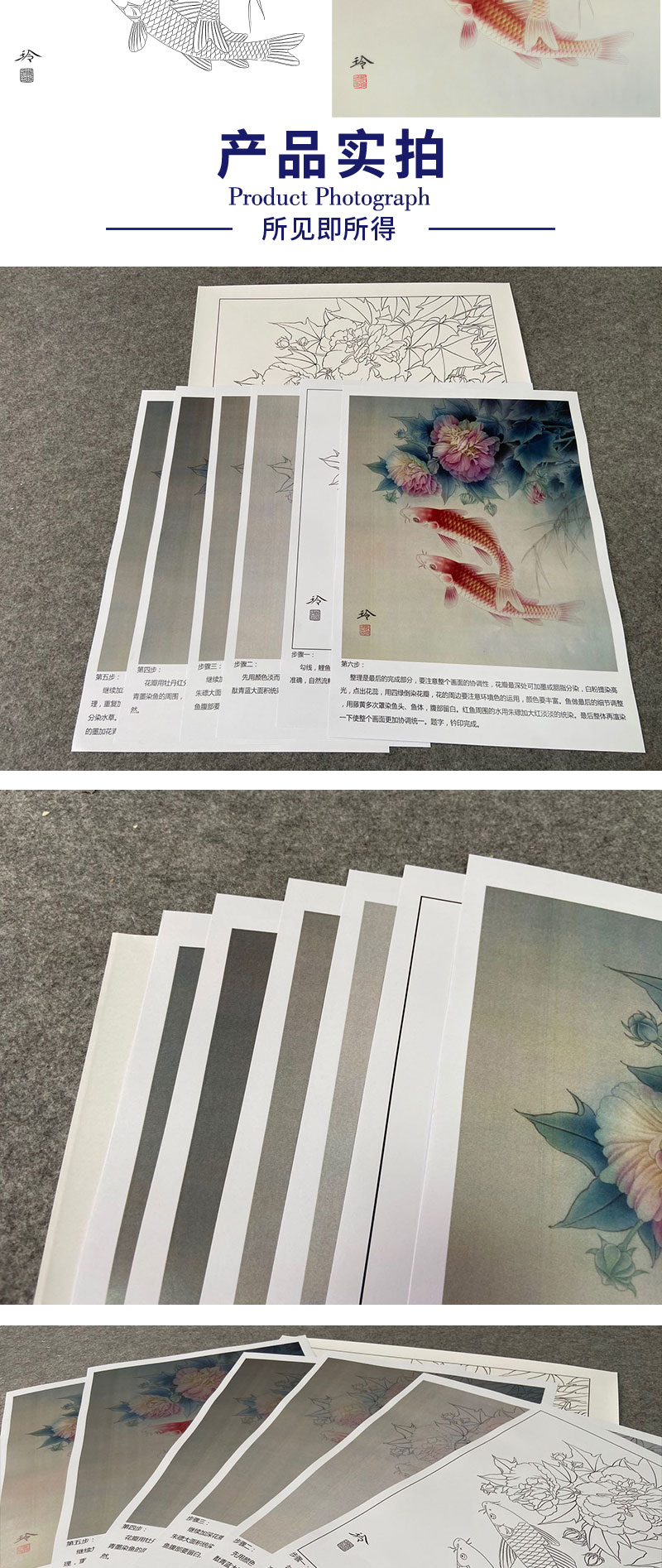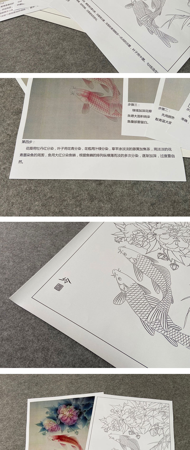 【有步骤、大彩图】郑玲玲工笔画白描稿《朝暮相逐》牡丹鲤鱼初学者临摹花鸟线稿ZL29