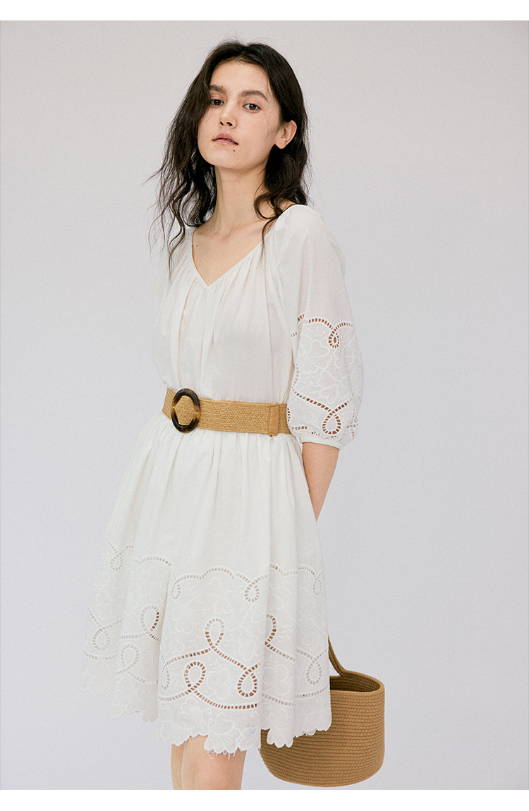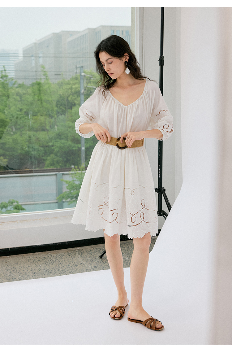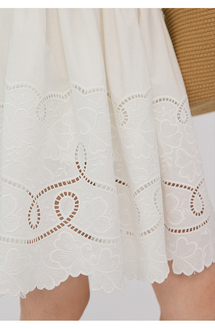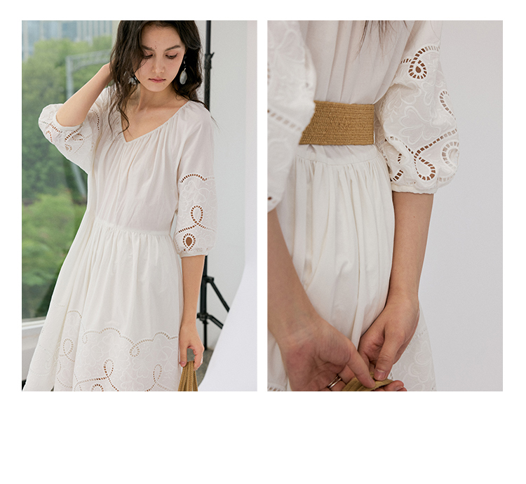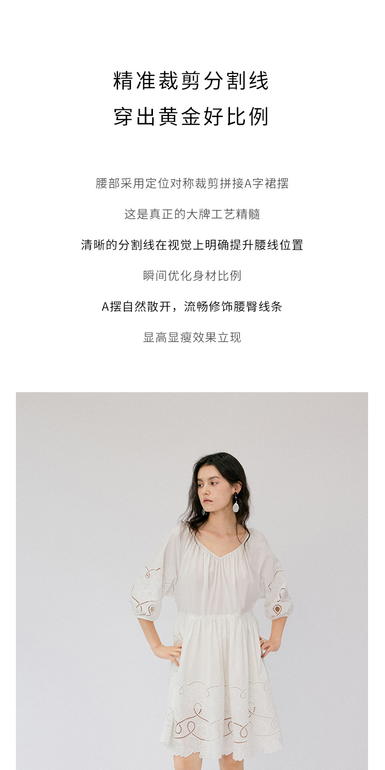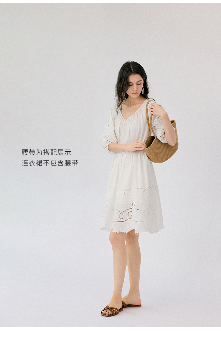 HeyDress白色刺绣连衣裙女夏季法式收腰重工马德拉绣花浪漫度假裙
