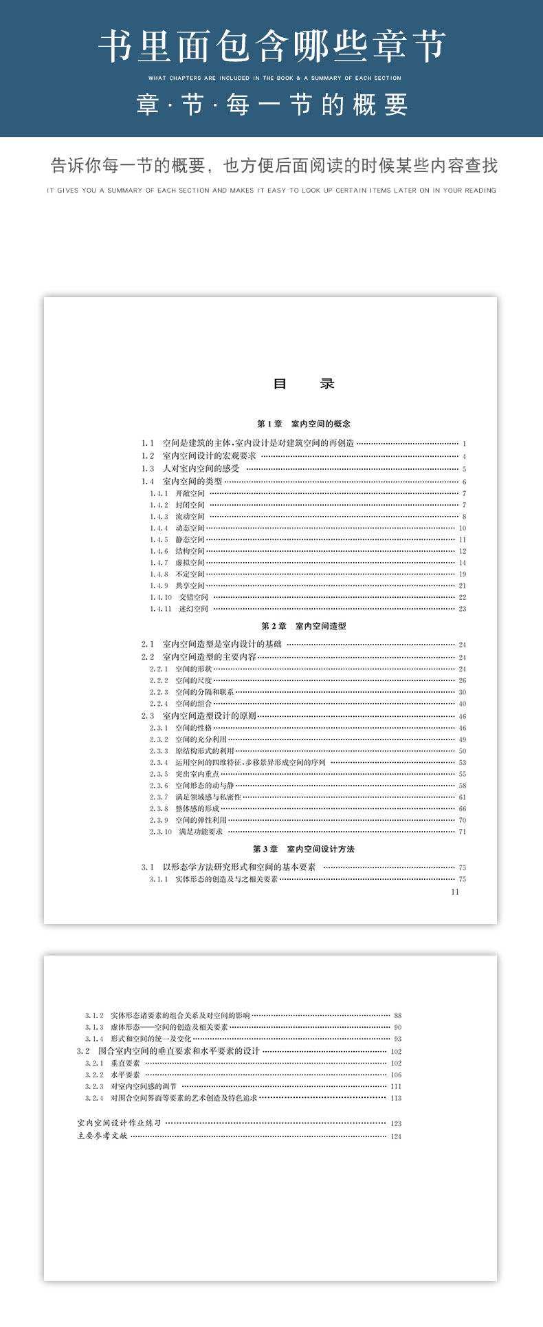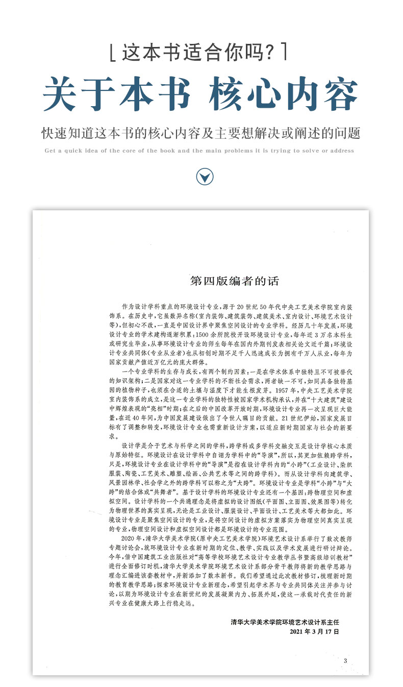 本书是在第三版的基础上修订的第四版。 本书从空间的角度系统地阐述了室内空间设计的基本概念、基本原则和设计方法。内容强调室内空间设计是对建筑空间的再创造和具体深化,空间是建筑的主体,是室内设计的重点表现对象。本书主要阐述空间的功能、比例、尺度、虚实的变化,以及这些变化给人带来的生理和心理感受。此外,还对空间的分隔与联系、空间的组织、空间与形状、色彩、采受。此外,还对空间的分隔与联系、空间的组织、空间与形状、色彩、采光、质感之间的相互关系等也作了介绍,并从设计原则和设计方法上作了进一步诠释。 本书可供高等院校环境艺术设计专业的教师、学生使用,同时也可供室内设计师、建筑师、景观设计师使用。