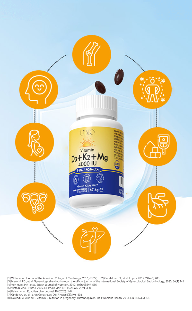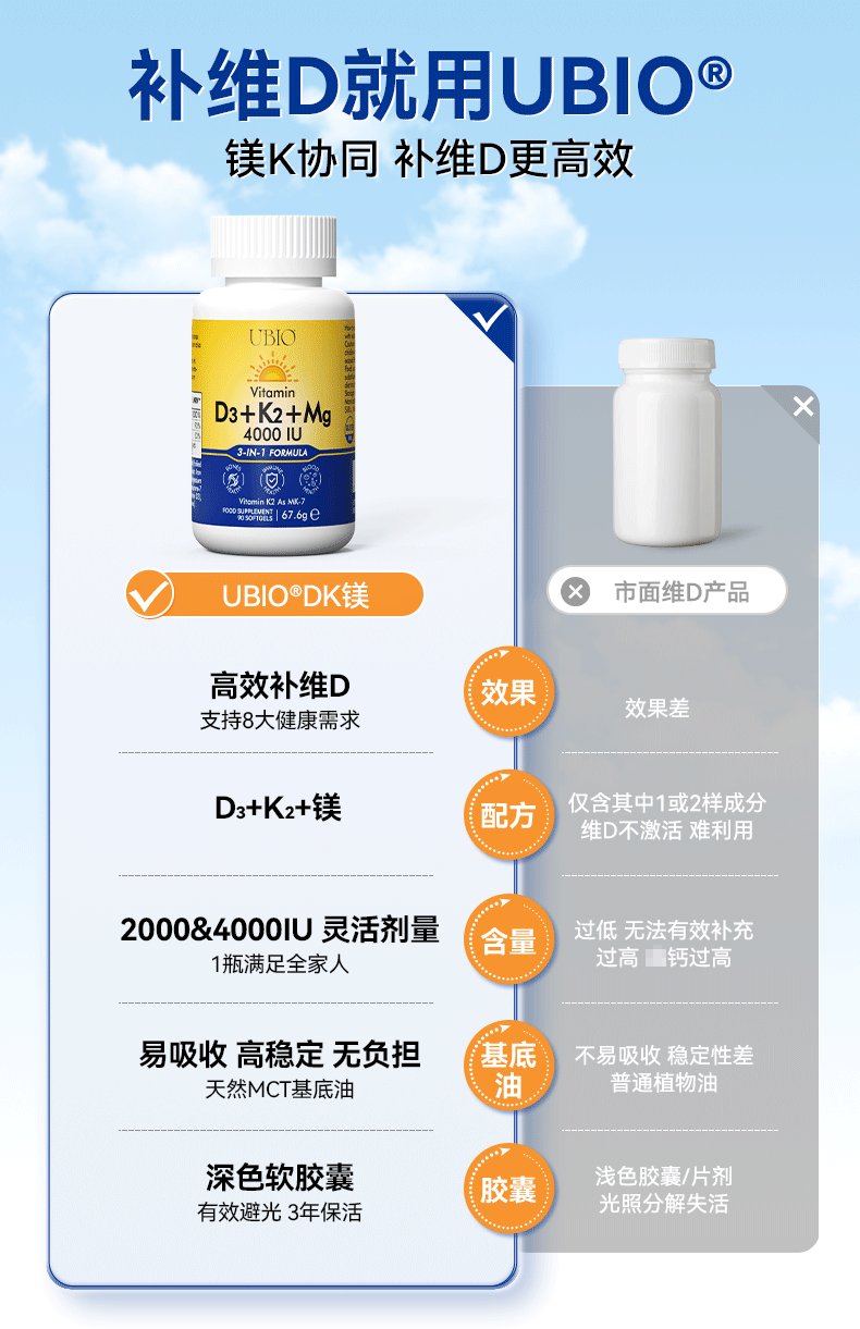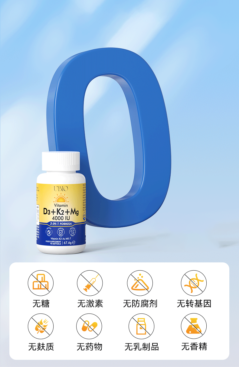 瘦龙专属UBIO优碧欧维生素D3K2镁阳光维生素三合一 90粒/瓶