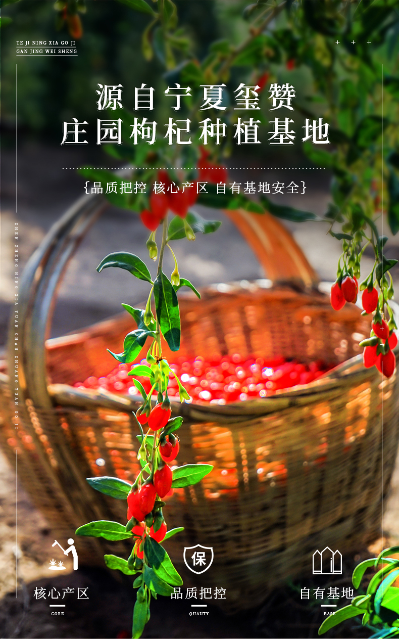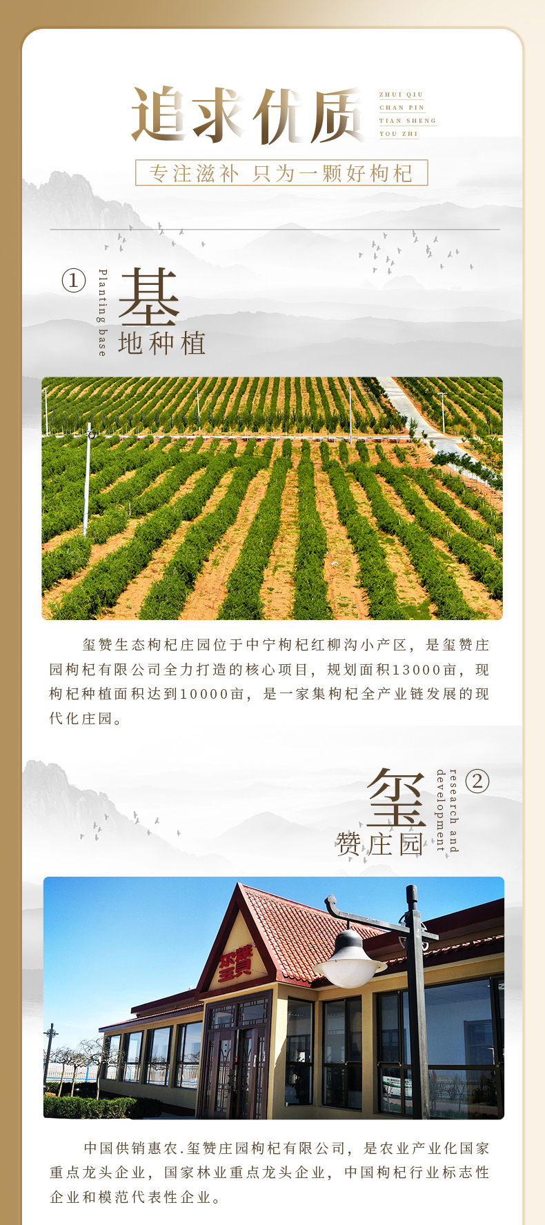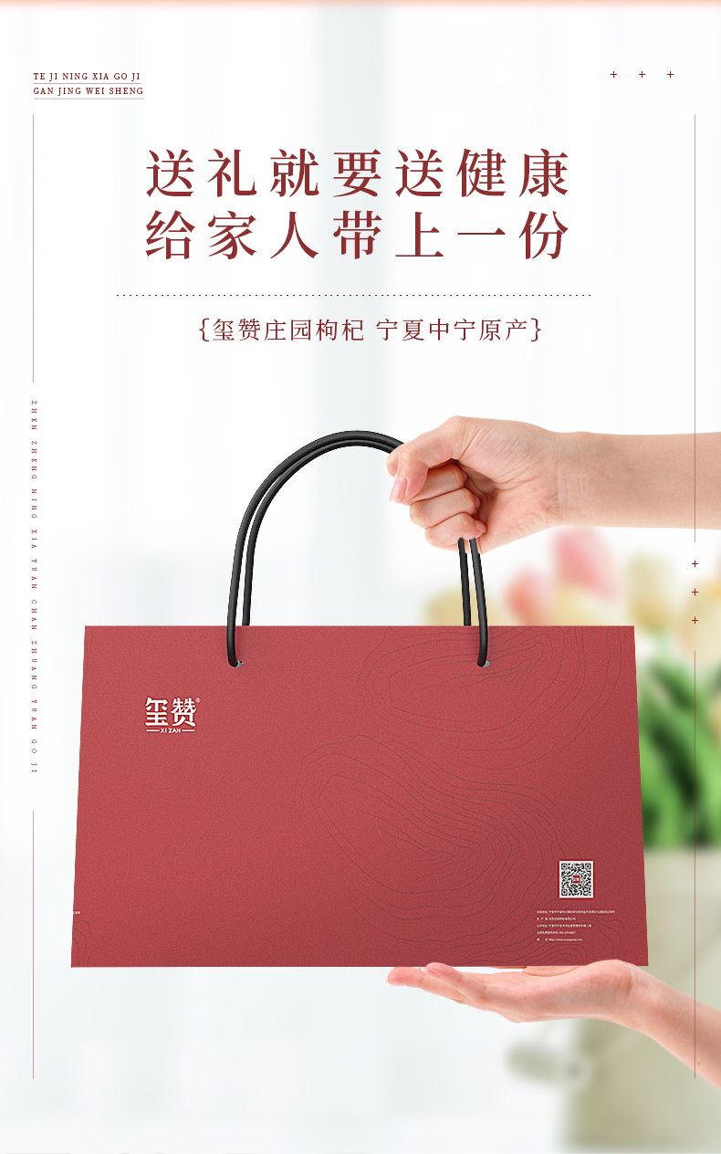 - 玺赞公司位于中国枸杞之乡—宁夏中宁县。在中宁枸杞红柳沟小产区建高标准枸杞种植基地一万三千亩—玺赞生态枸杞庄园,实现了研发、种植、加工、营销、文旅、生态“六位一体”的现代枸杞全产业链企业,本店是玺赞微店
