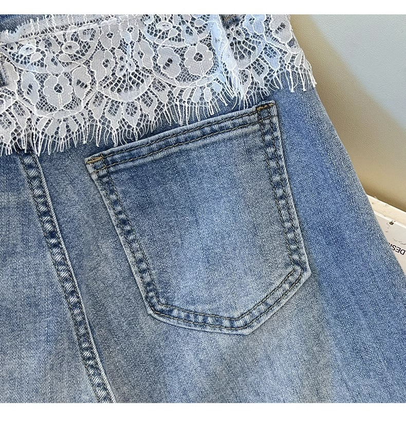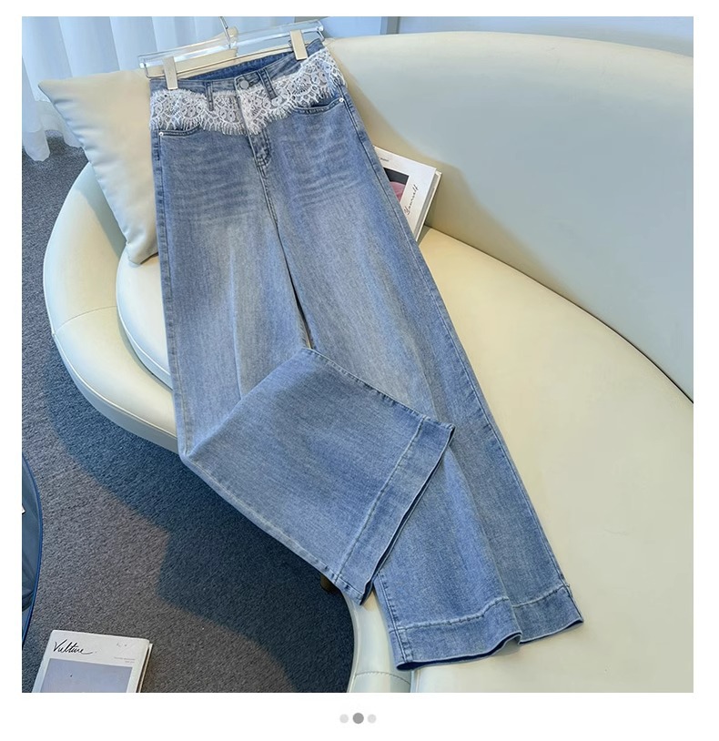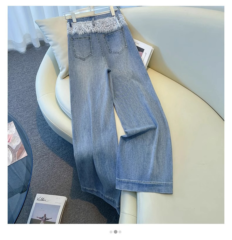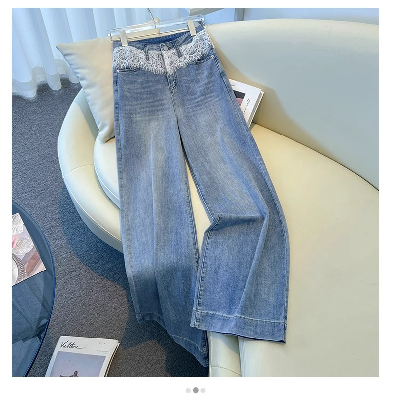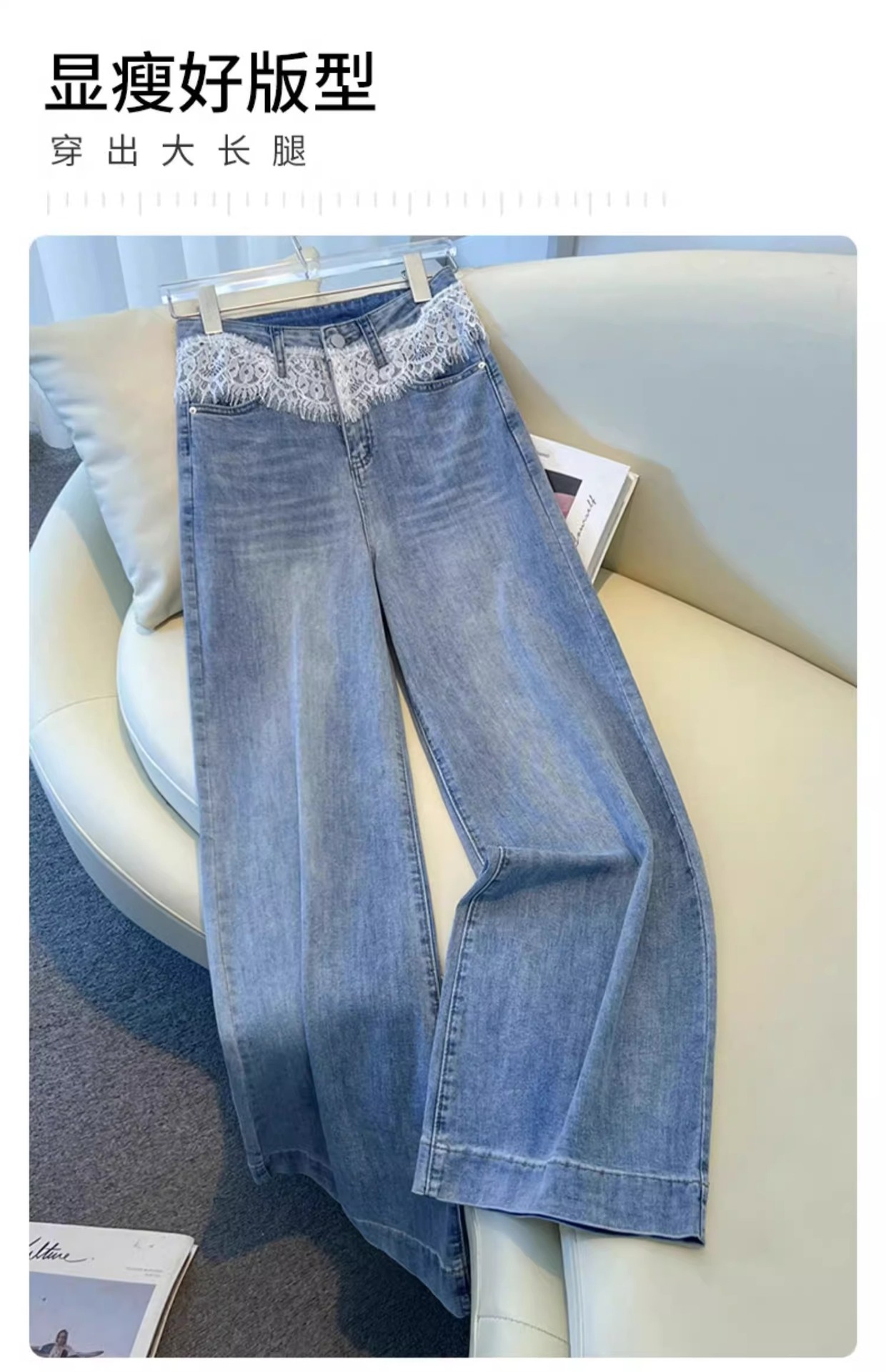 丁摩 蕾丝阔腿牛仔裤女春秋季新款高腰显瘦拖地裤垂感浅色直筒裤子5ZF-8073
