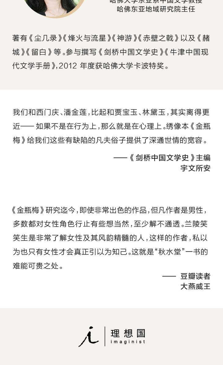 读到最后,“竟觉得《金瓶梅》实在比《红楼梦》更好”。其结构、细节上的苦心孤诣,为“秋水堂主人”一一辨析。“虽兰陵笑笑生复活,亦不能有此四百年眼光与刻度丈量自己之著作矣。”(高晓松语)