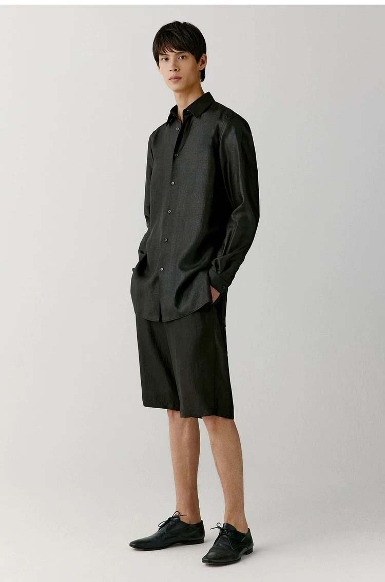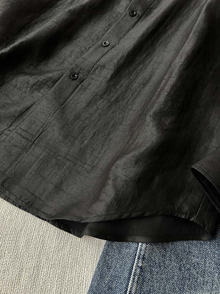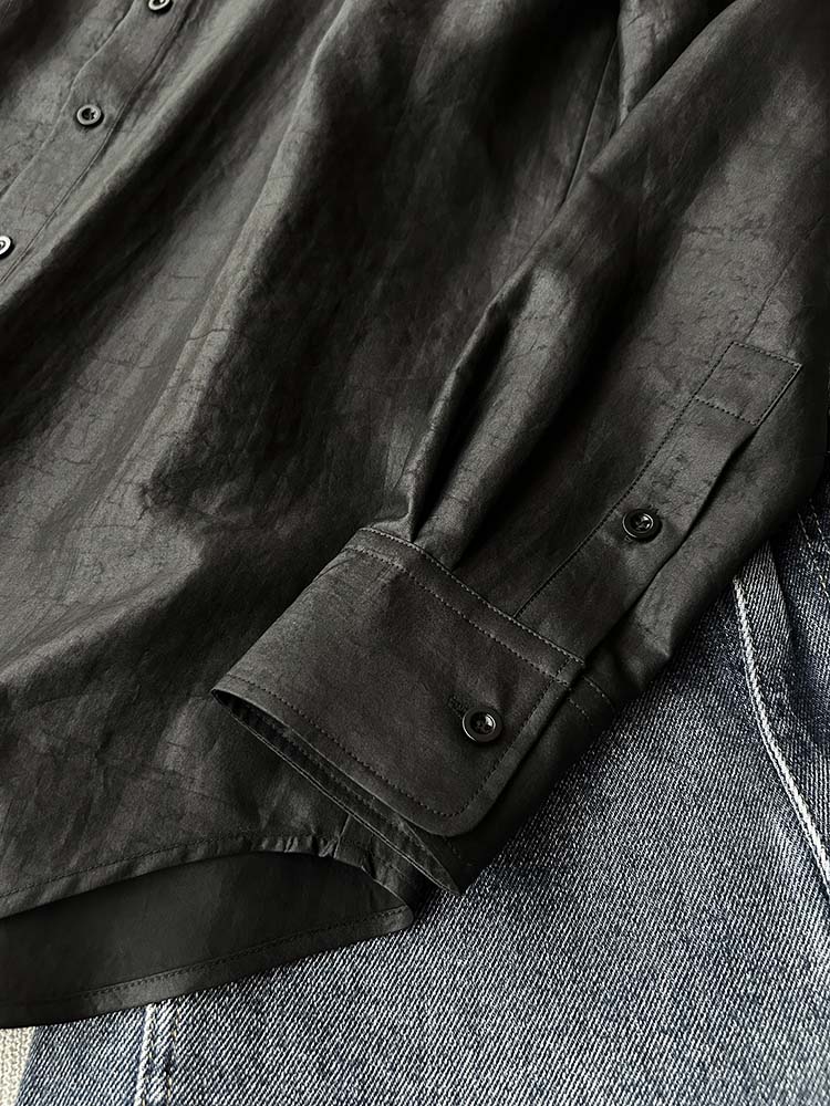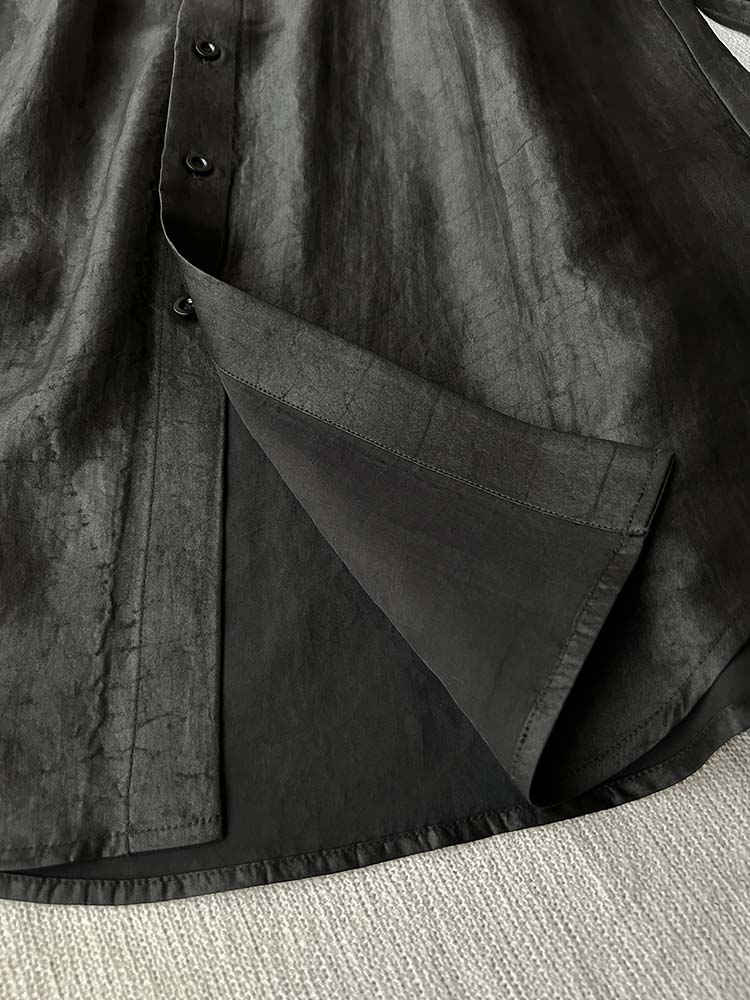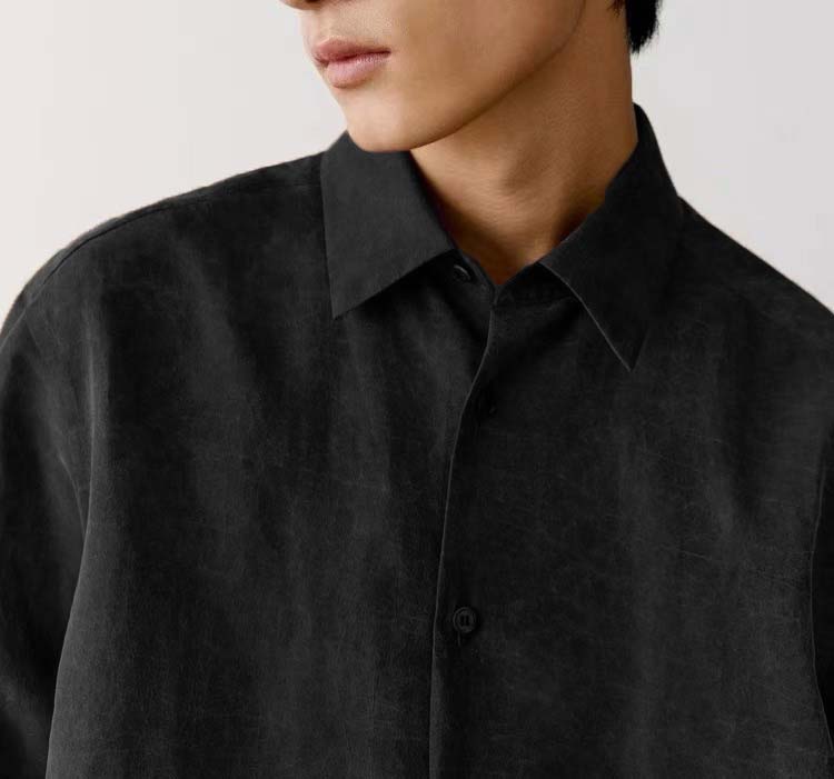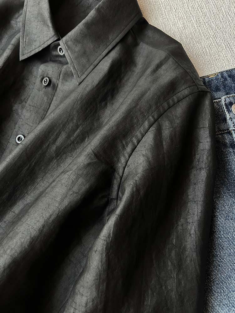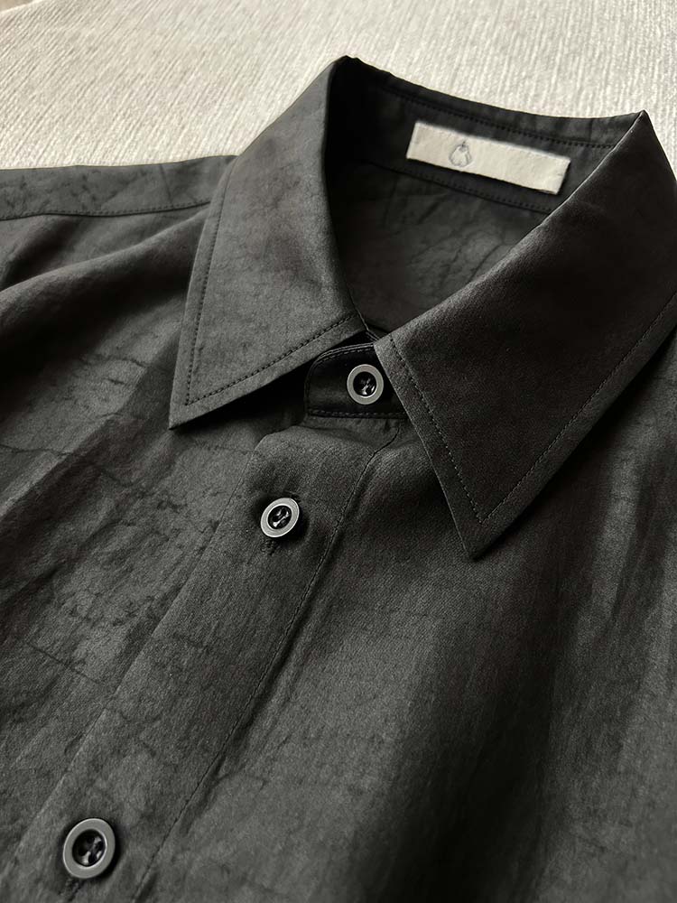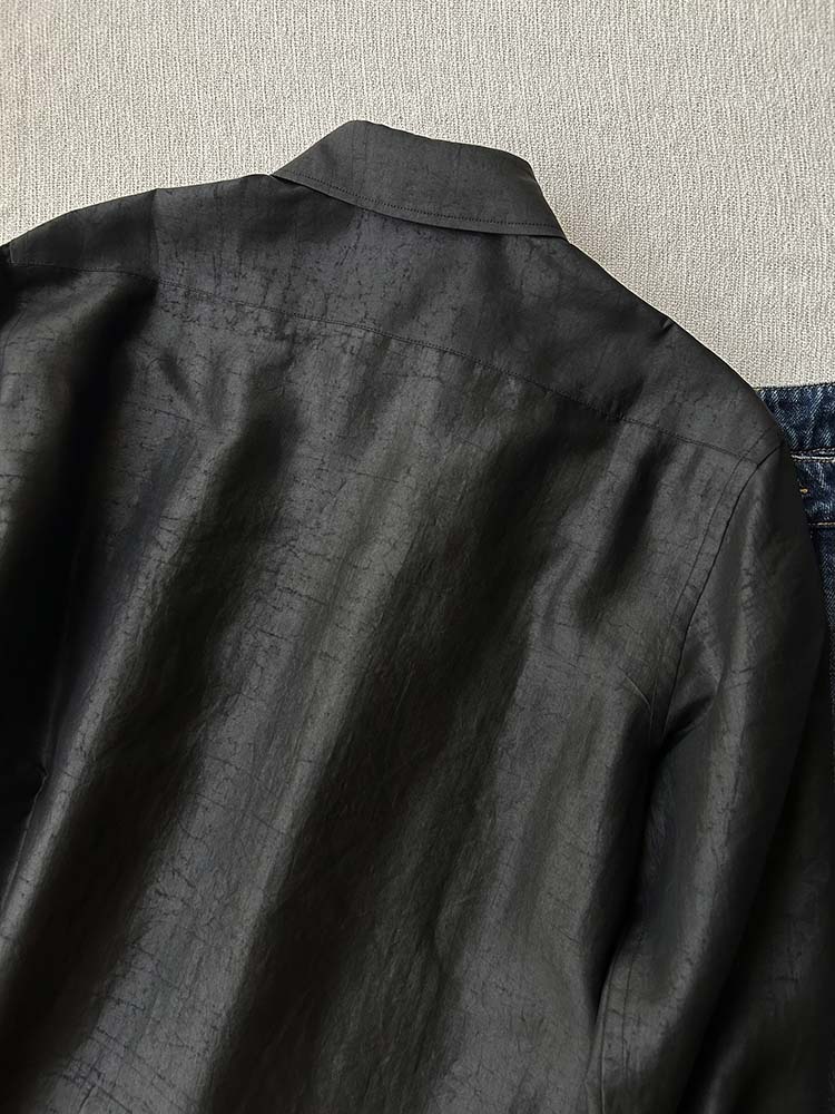 「100%桑蚕丝双黑龟纹香云纱小方领衬衫」