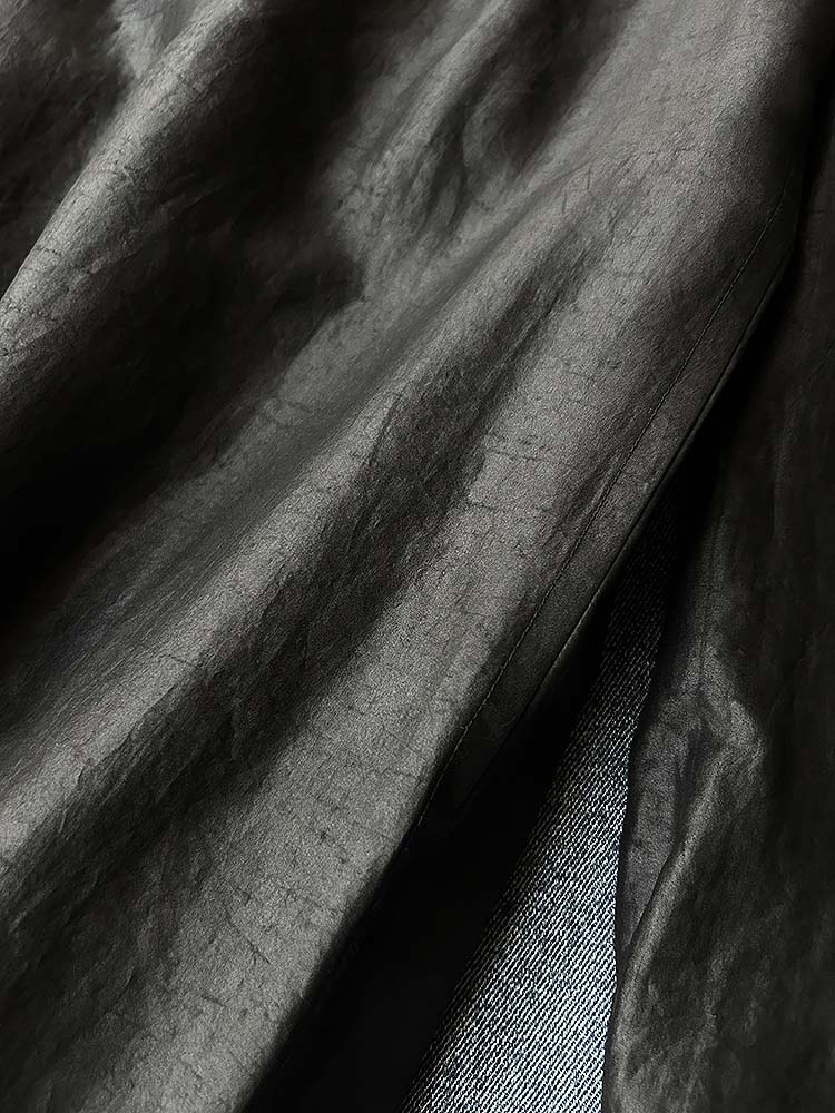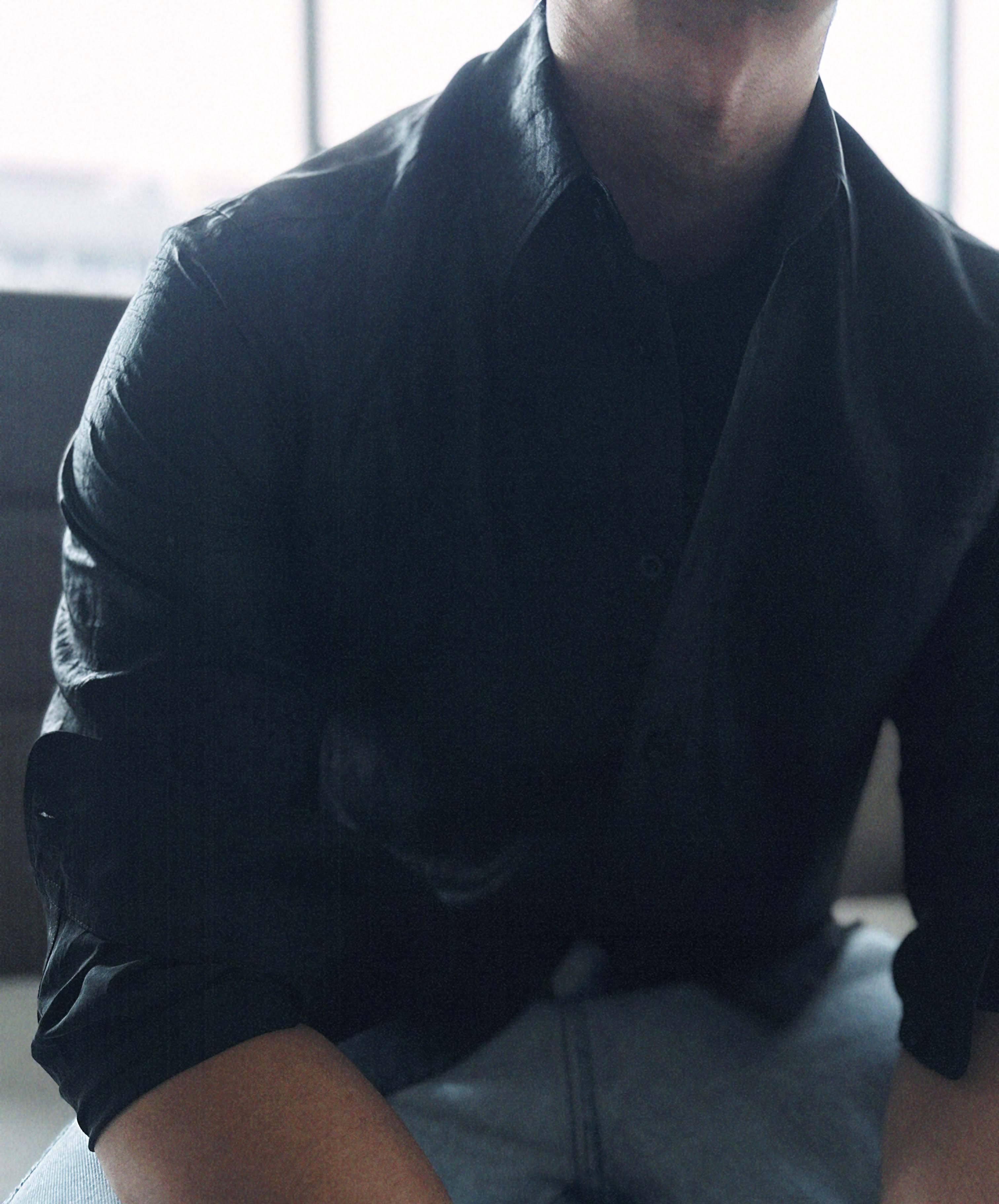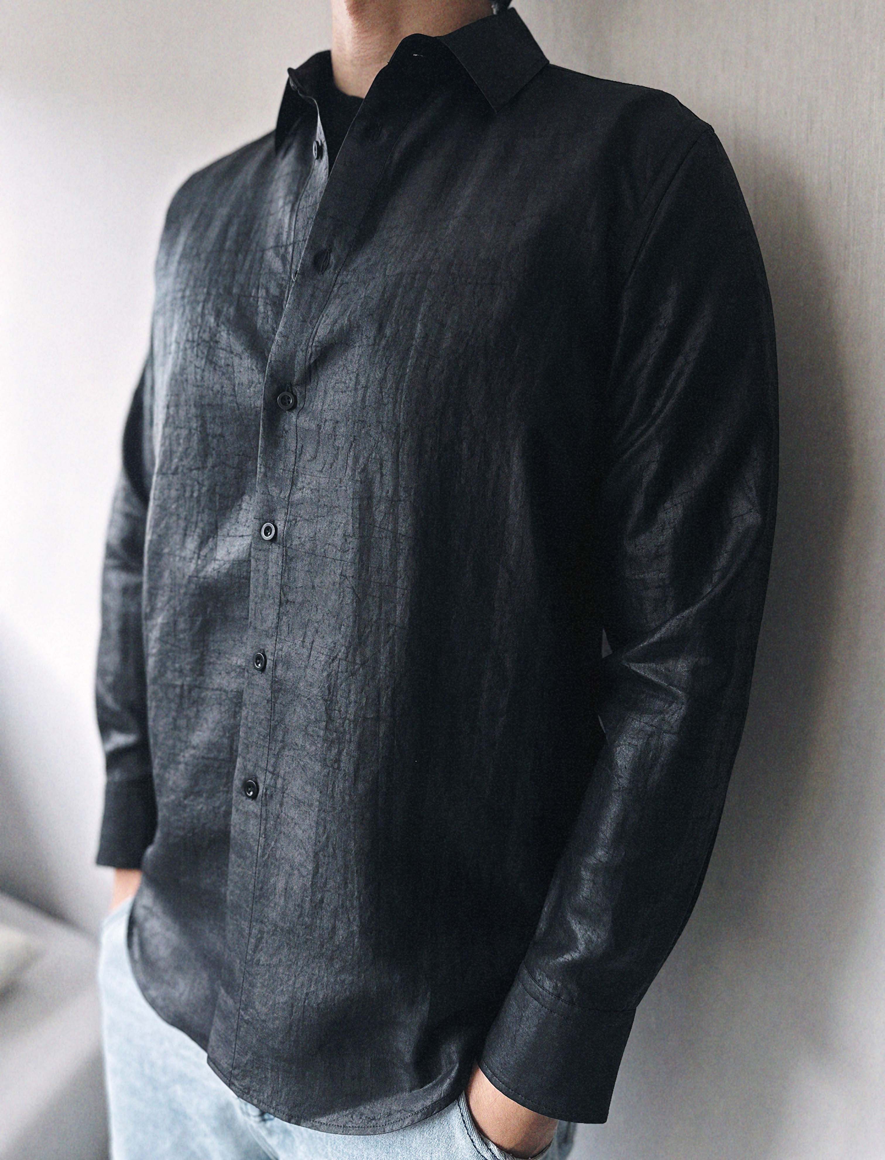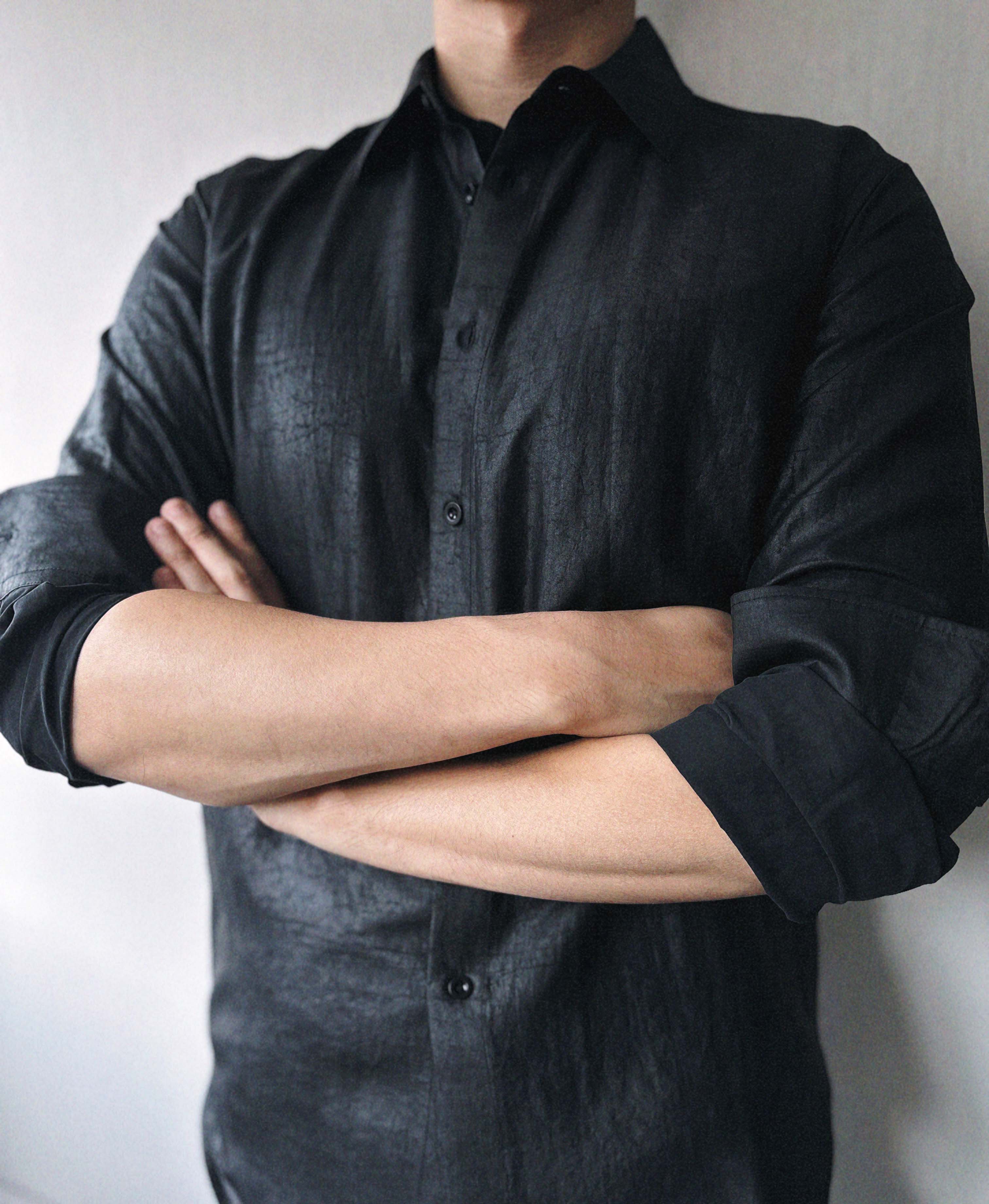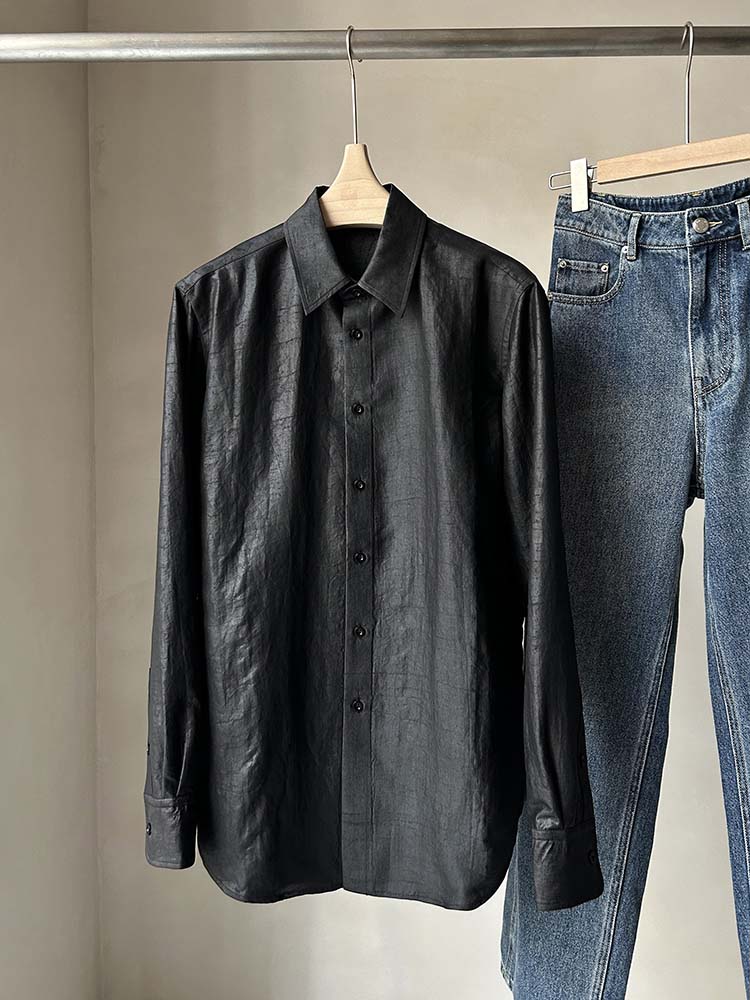 「100%桑蚕丝双黑龟纹香云纱小方领衬衫」