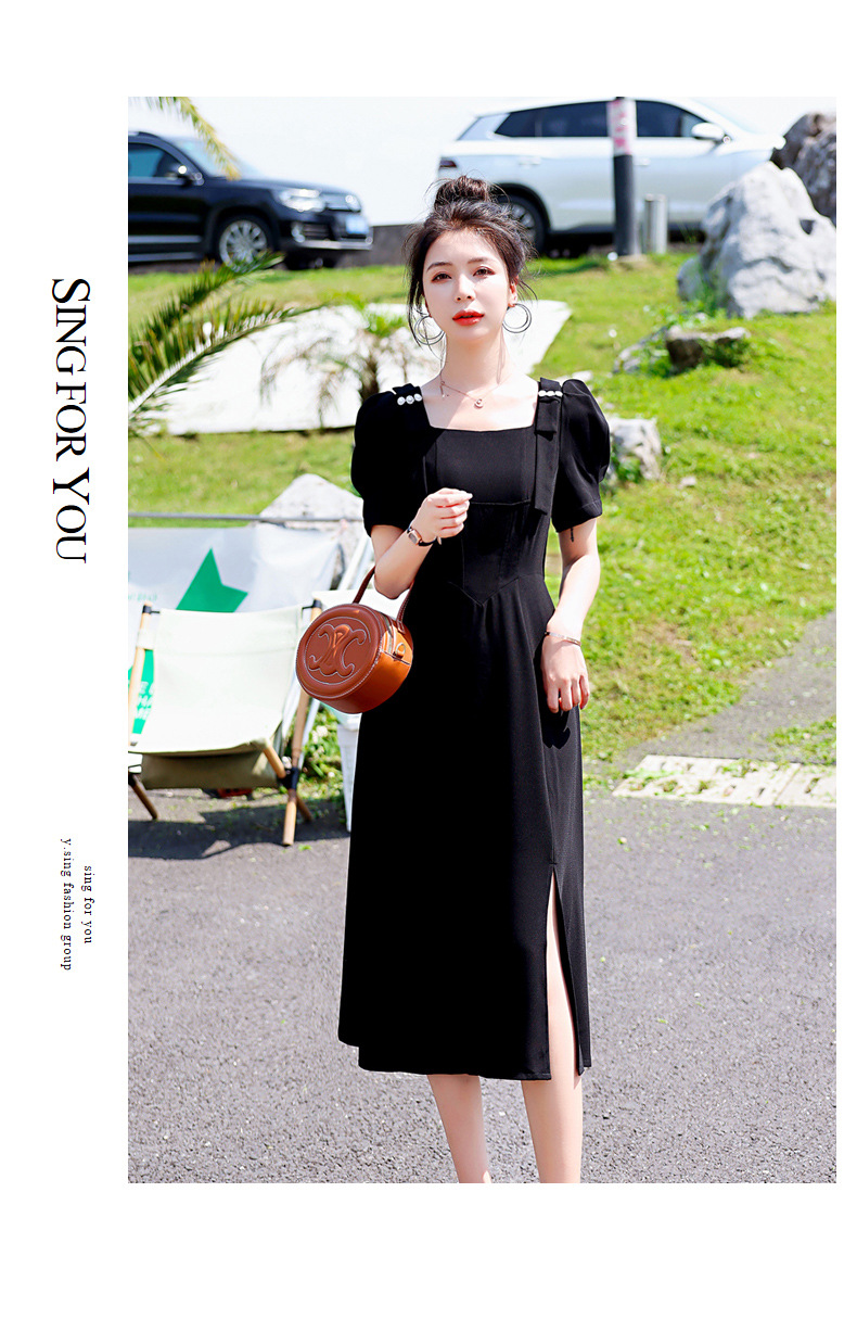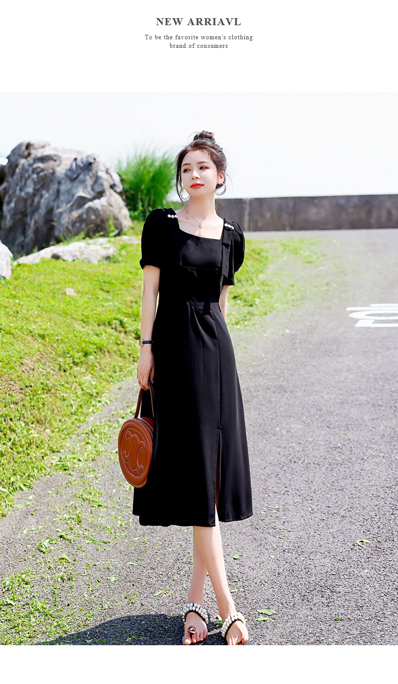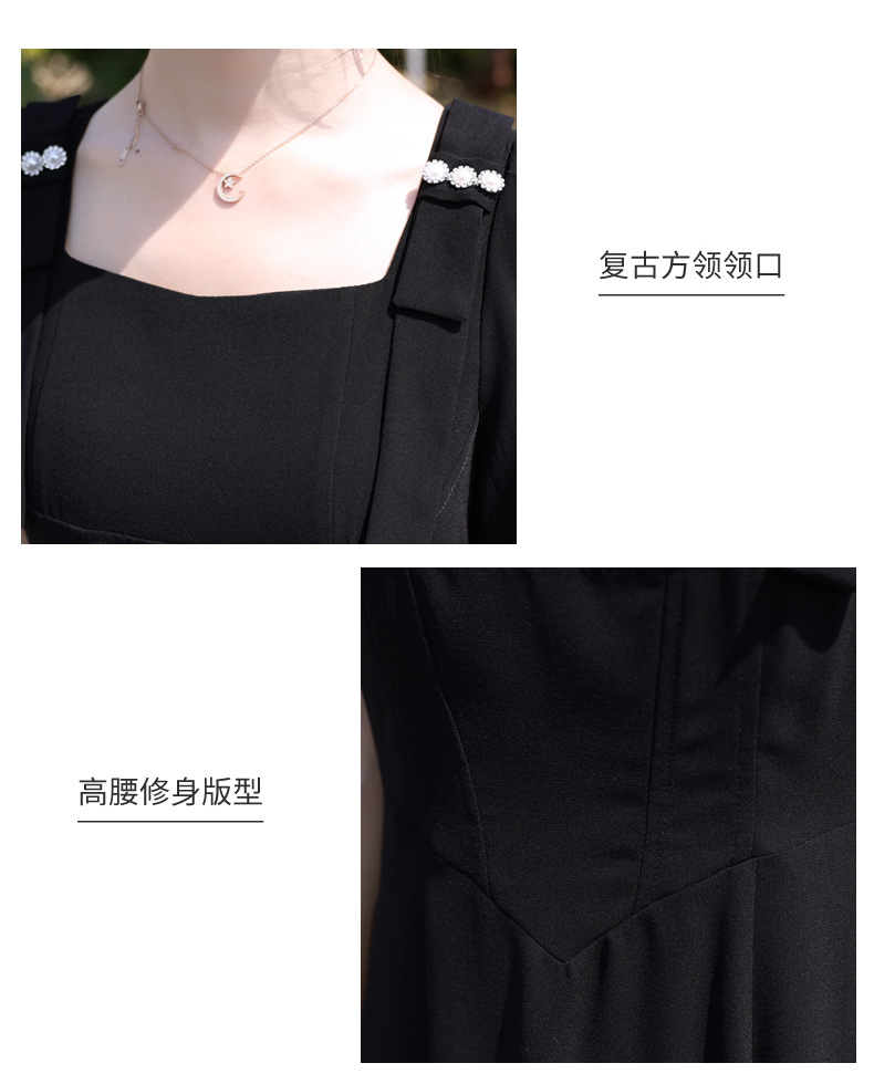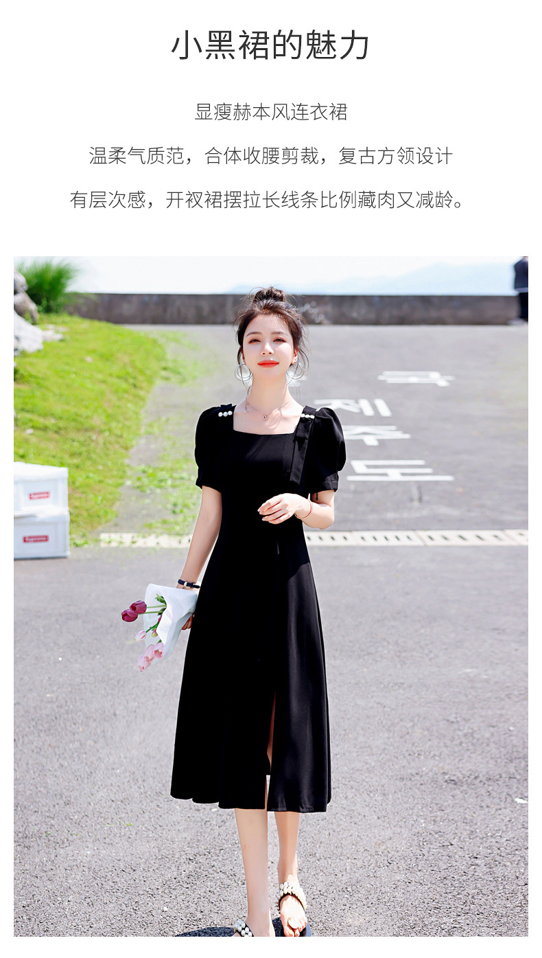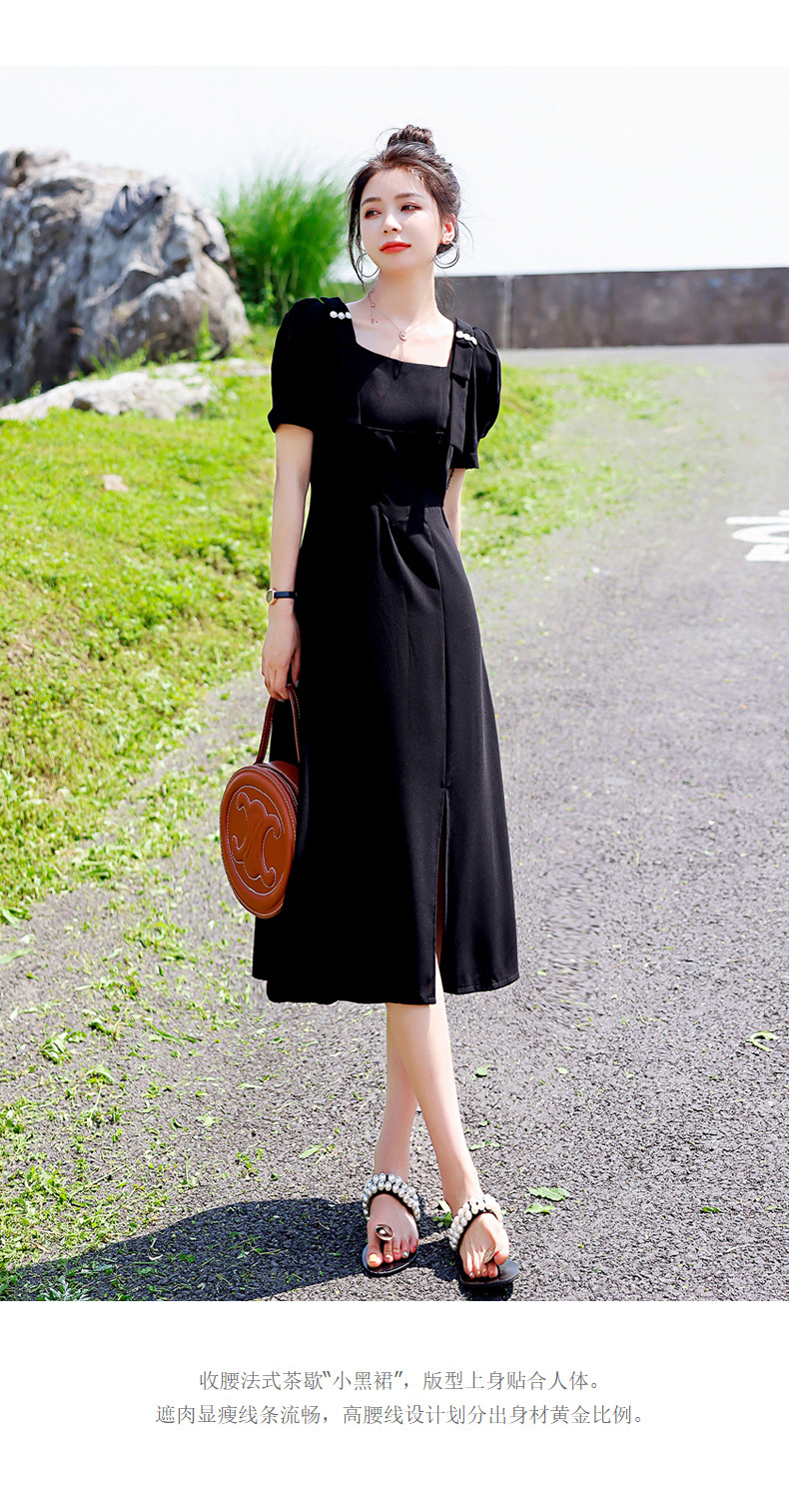 时尚收腰显瘦,法式开叉方领感气质黑色连衣裙HR-875