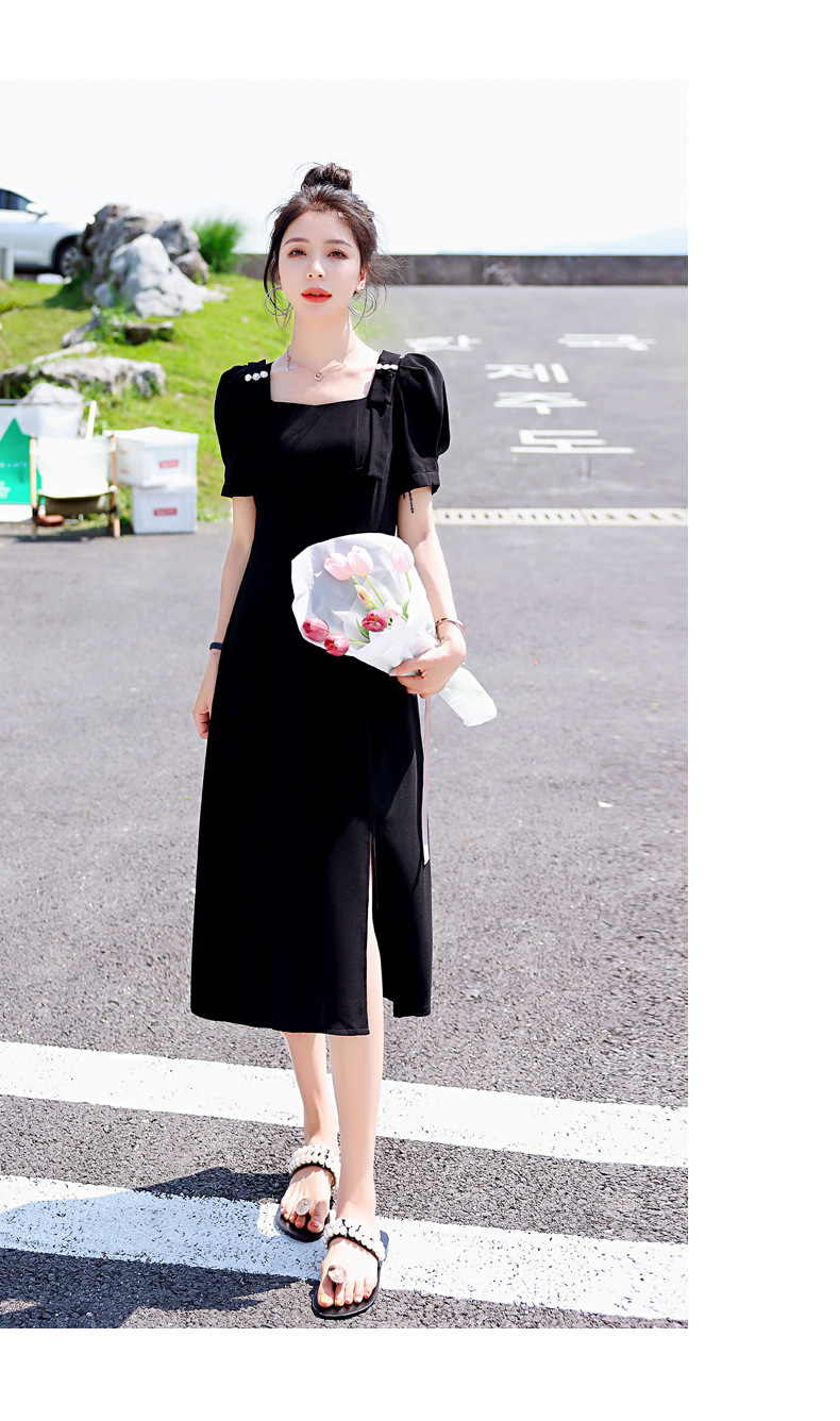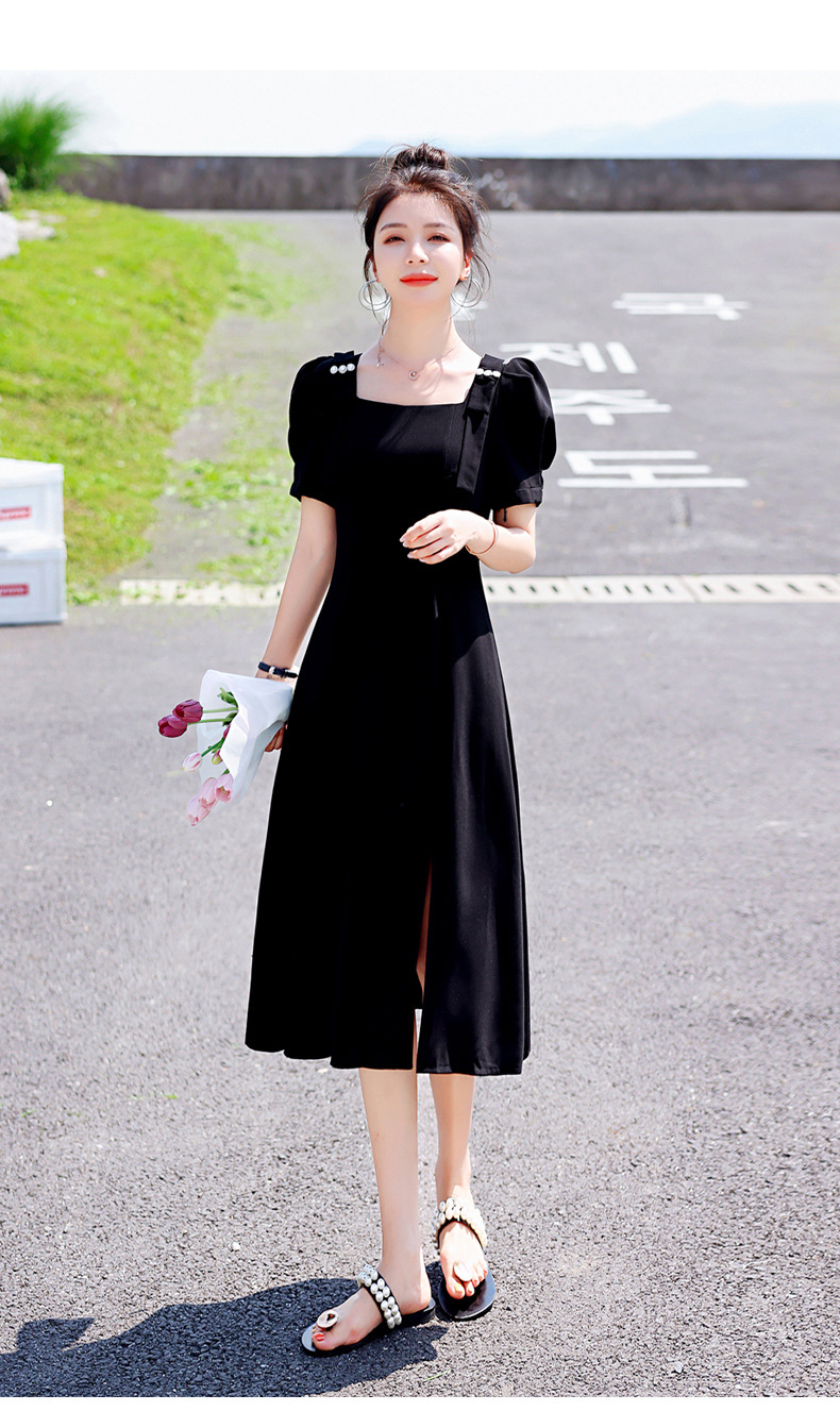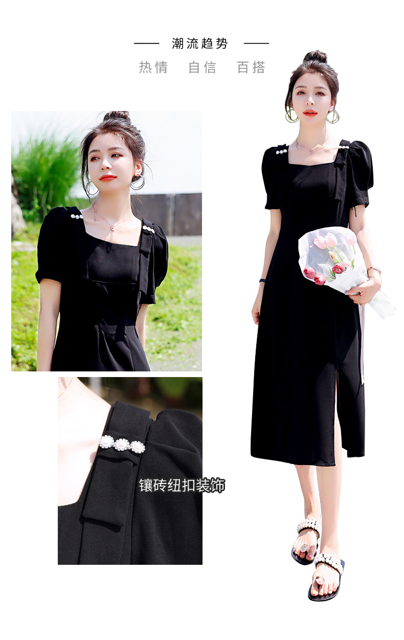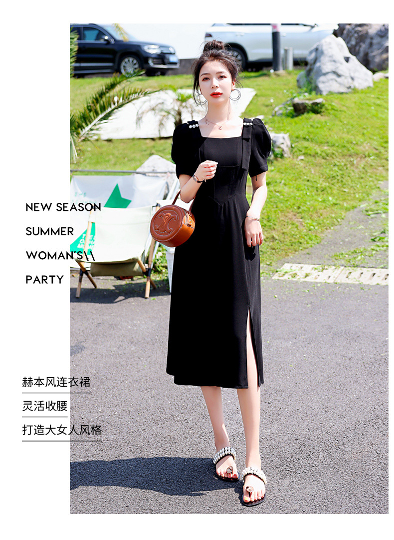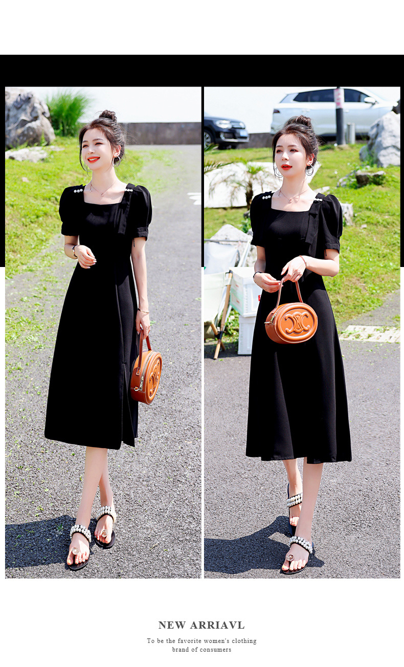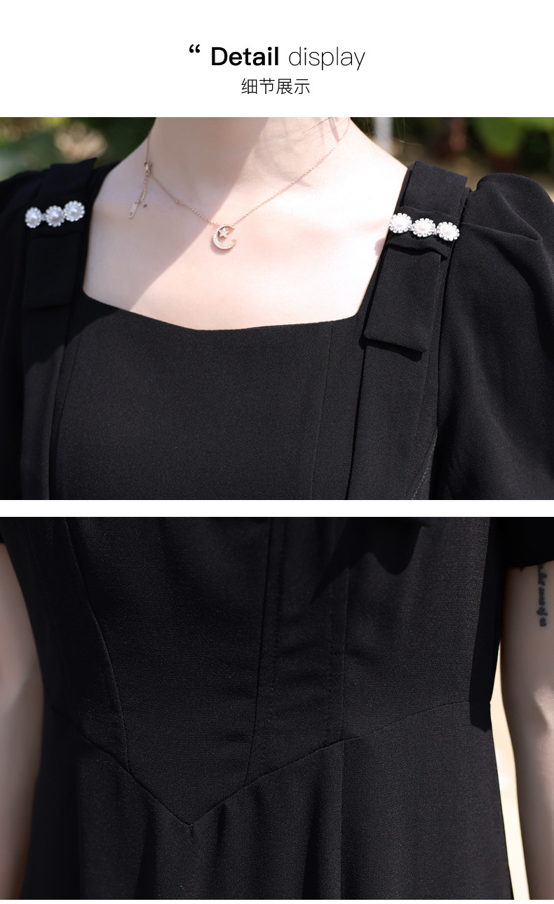 时尚收腰显瘦,法式开叉方领感气质黑色连衣裙HR-875