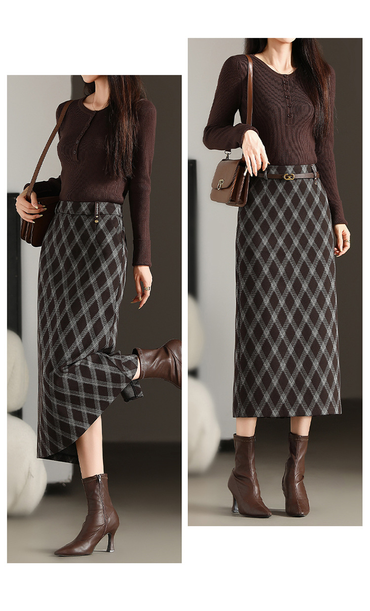 QYM M220-Y格子毛呢半身裙直筒裙中长款包臀一步裙 商品图1