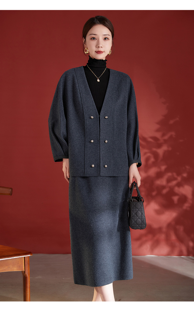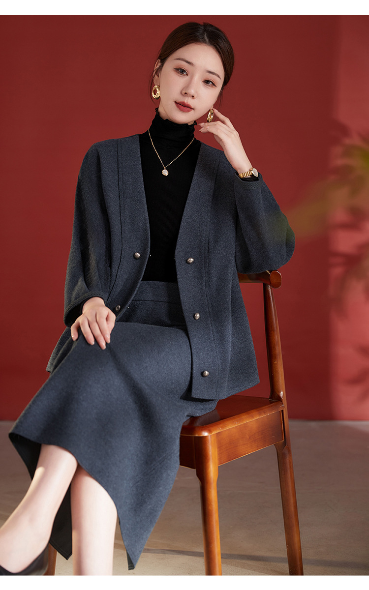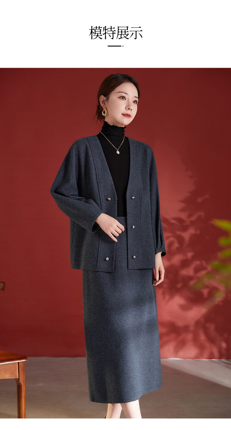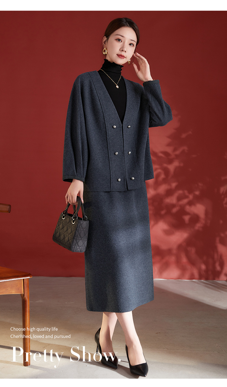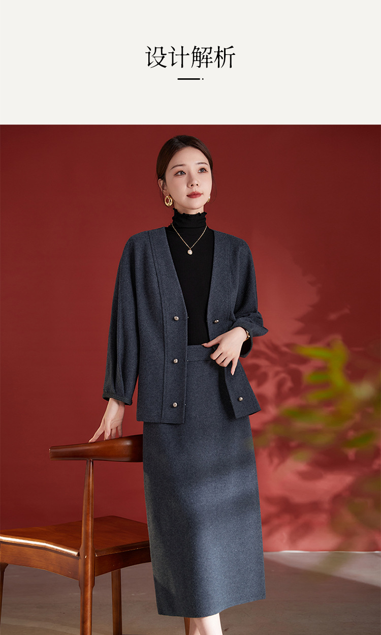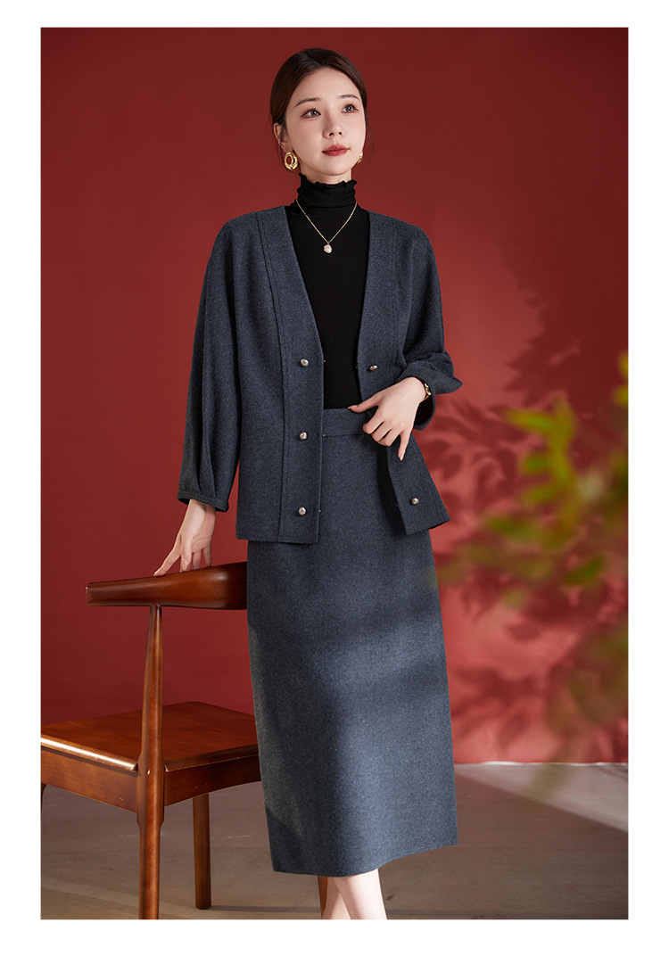绵羊毛混纺V领开衫外套,中长裙套装气质通勤毛呢两件套SM- 62498238