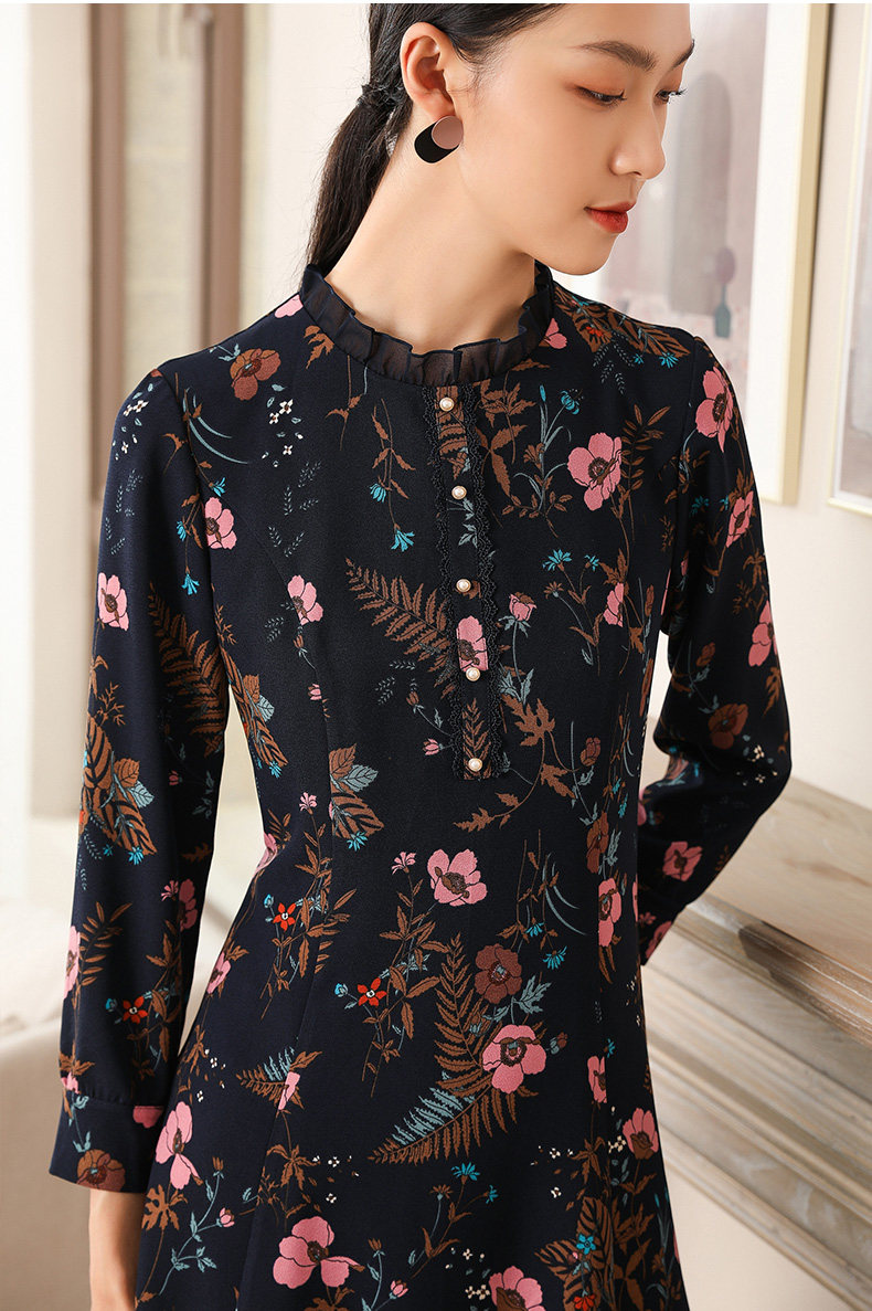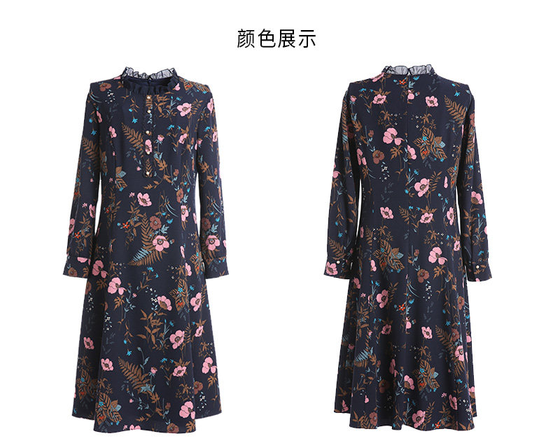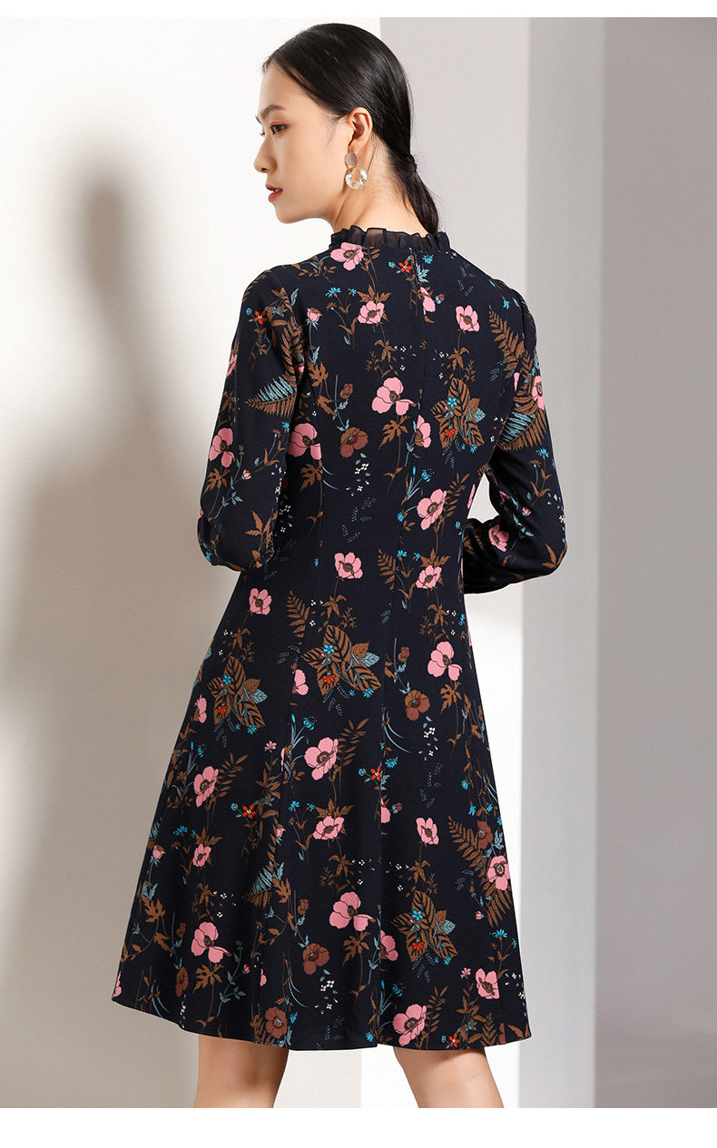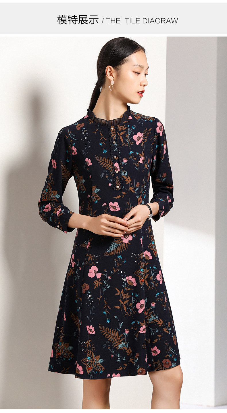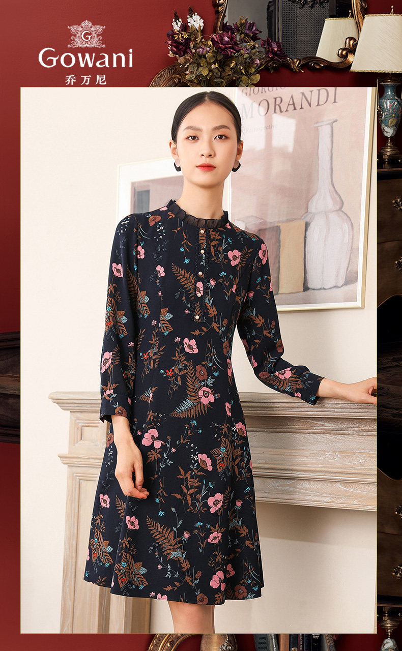 乔万尼秋装复古立领收腰显瘦气质印花长袖连衣裙女中长EN3E316