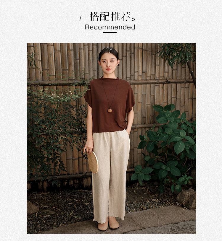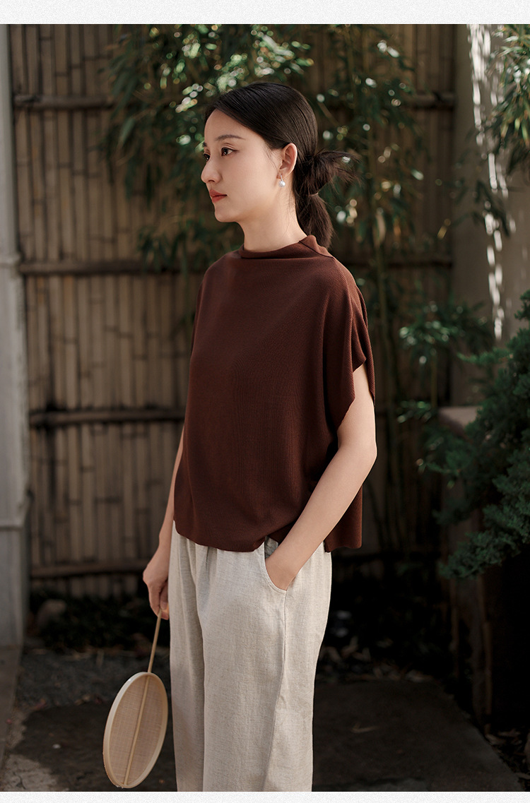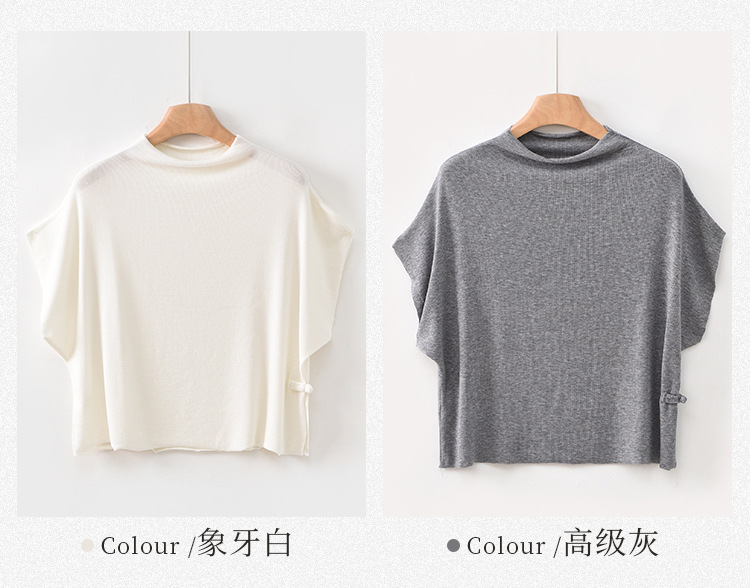雀说新款短袖t恤女半高领盘扣复古天丝羊毛蝙蝠袖上衣AL6513