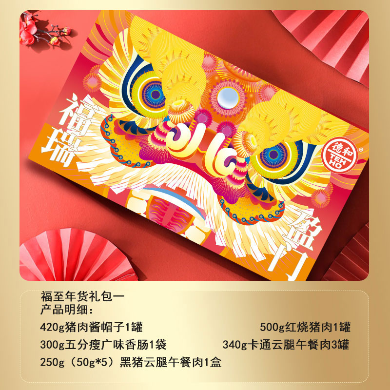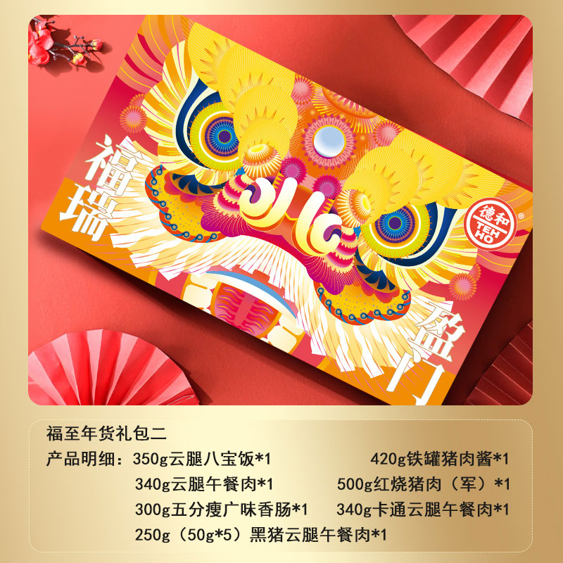 德和年货福至礼包 肉的组合礼包 五分瘦广味香肠 片装黑猪云腿午餐肉 红烧肉 卡通午餐肉 猪肉酱 #礼包