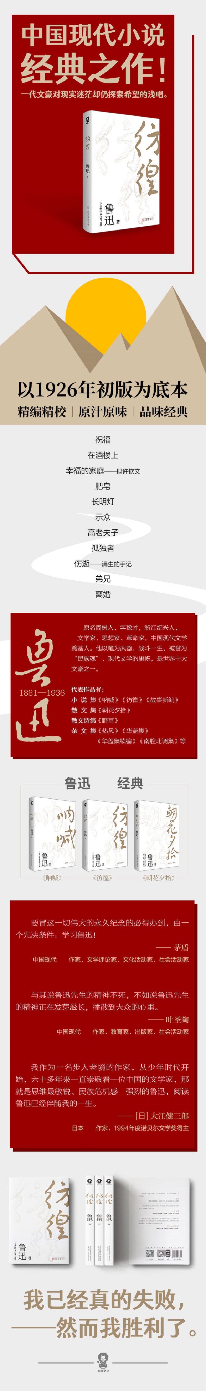 《彷徨》是鲁迅的第二部短篇小说结集,收录了1924至1925年间所作的短篇小说十一篇,包括《祝福》《在酒楼上》《幸福大家庭》《高老夫子》《兄弟》《伤逝》等。作品以“表现得深切”、“格式的特别”开创了小说现代化的特征。当时正值五四落潮,新文化运动阵营内部出现分化,鲁迅先生的心境已经产生了变化,处境也是“两间余一卒,荷戟独彷徨”。他不再呐喊,转而关注在封建势力重压之下的农民与知识分子,哀其不幸,怒其不争,在深广的历史图景之中,寄寓他对人生、对前途的执着探索。他的作品堪称中国社会发展和变革的一面镜子,不失为现代文学的典范。