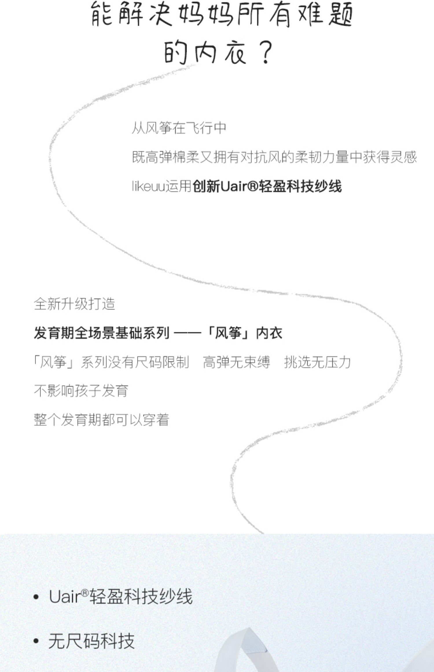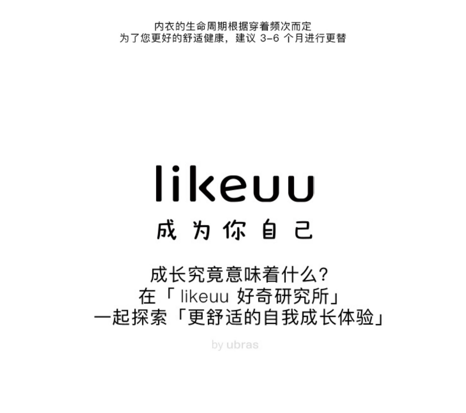 - likeuu是专注于为6~15岁的青少年创造柔软、无束缚的成长体验,以好奇心为灵感的成长发育期贴身衣物品牌。likeuu的产品覆盖内衣、内裤、保暖衣、家居服、运动等品类。
