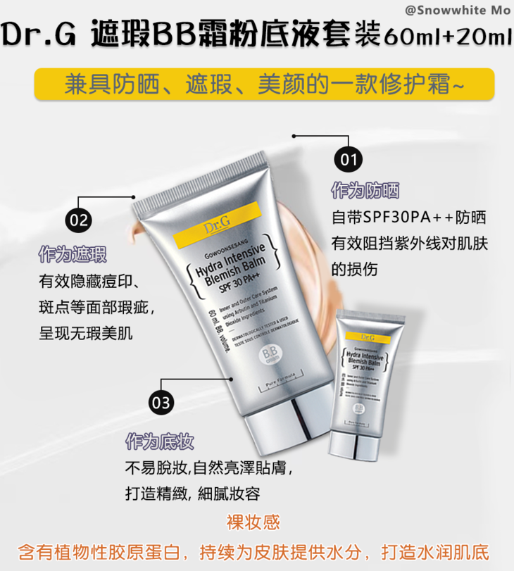 👑Dr.G 遮瑕BB霜粉底液60ml+20ml 👍兼具防晒、遮瑕、美颜的一款修护霜~ 🌳含有植物性胶原蛋白,持续为皮肤提供水分,打造水润肌底 🔆舒缓、防晒双重呵护,SPF30/PA++防晒指数,由内而外打造明亮肤色的双重功效BB霜 🥚质地轻薄,易推开,不卡粉,轻若无妆感~裸妆之选!!!