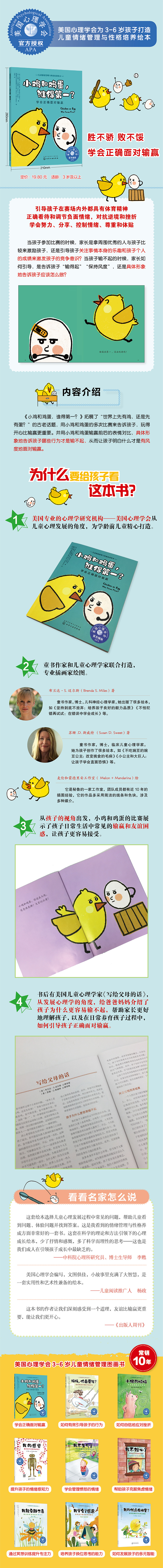 1.专业性——美国心理学会儿童心理学家精心策划,专业插画家绘图,心理学背景和翻译水平兼备的妈妈们担任翻译。书后附有“写给父母的话”,从儿童发展心理学的角度剖析孩子的种种表现,帮助家长理解孩子,指导孩子克服种种情绪障碍,陪伴孩子健康快乐成长。