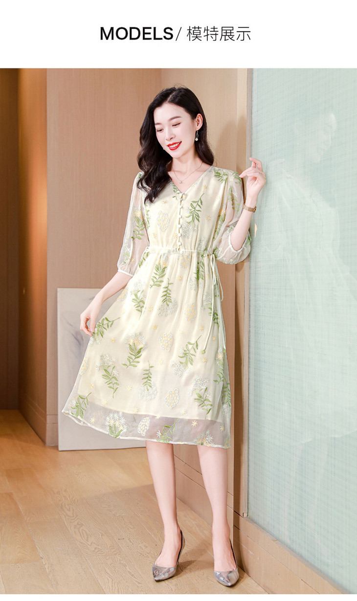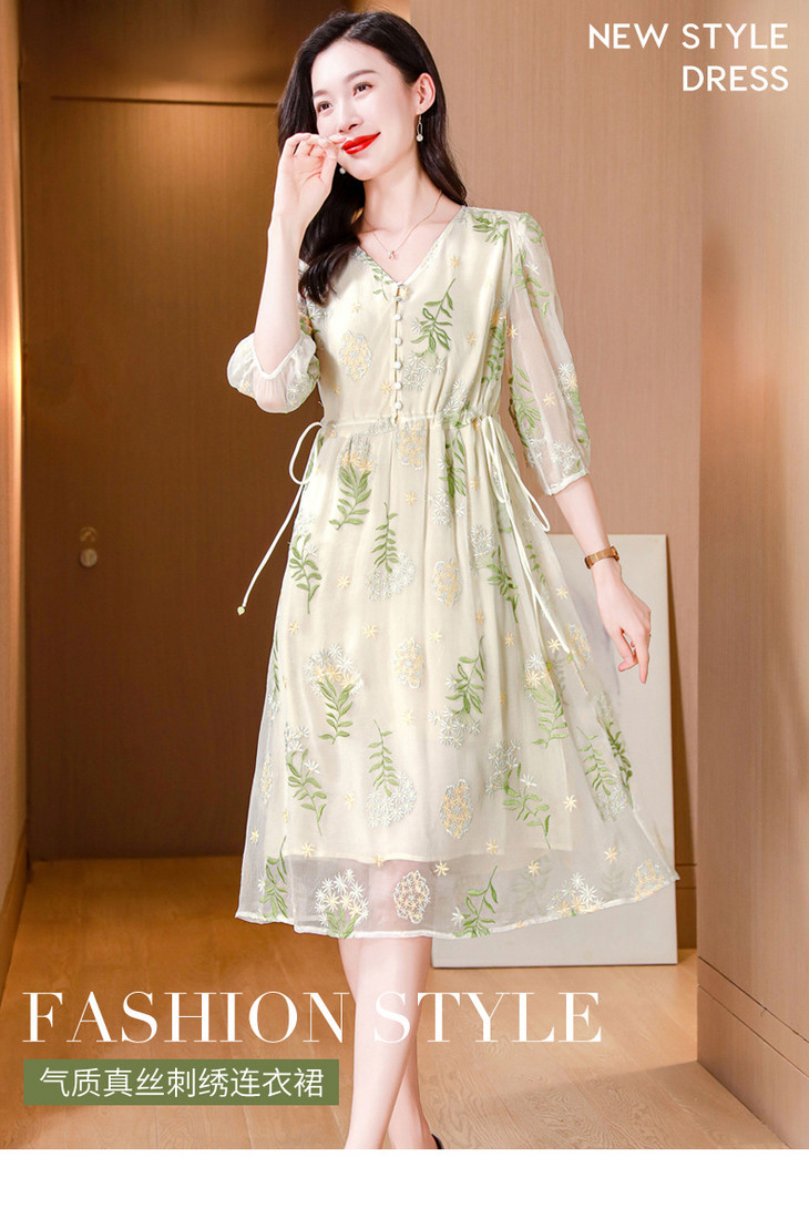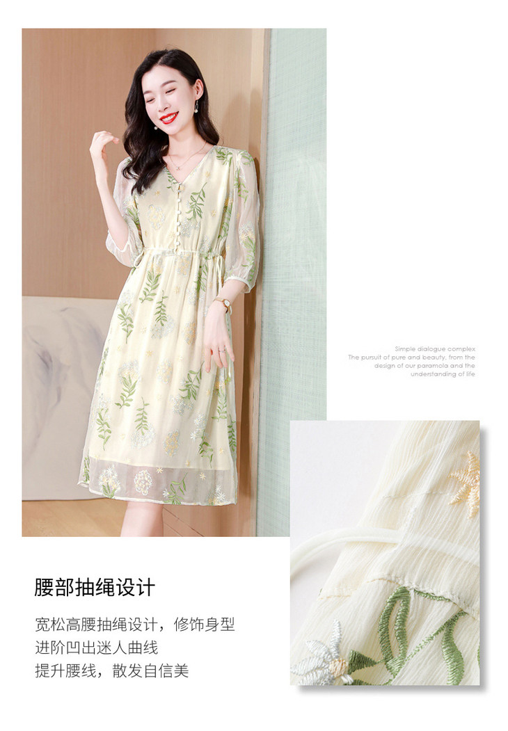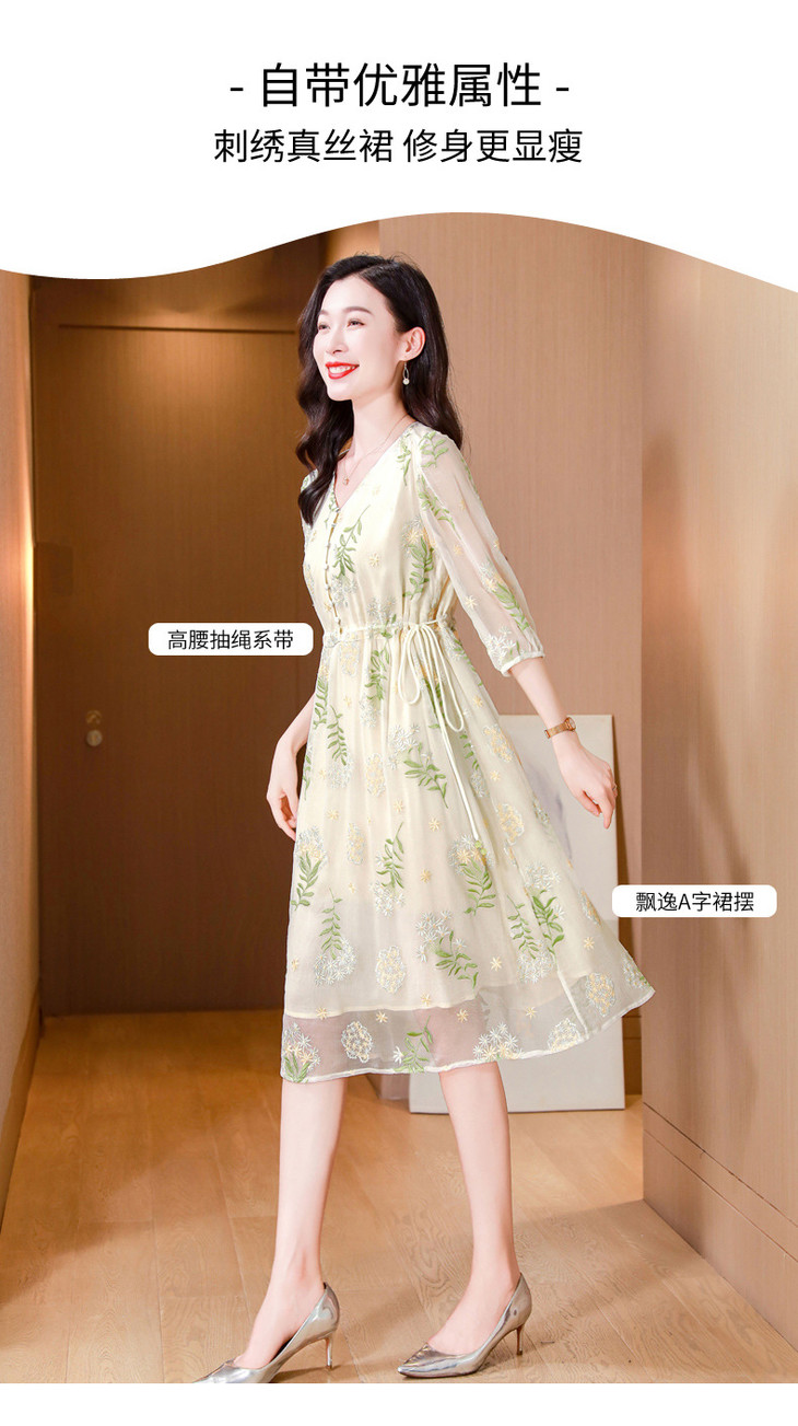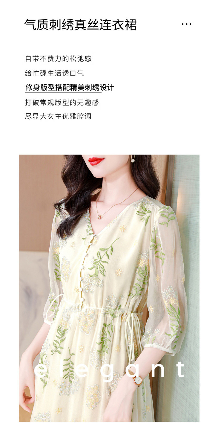 ASE2024夏季V领五分袖气质优雅真丝连衣裙