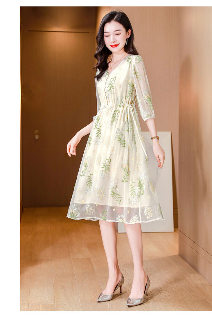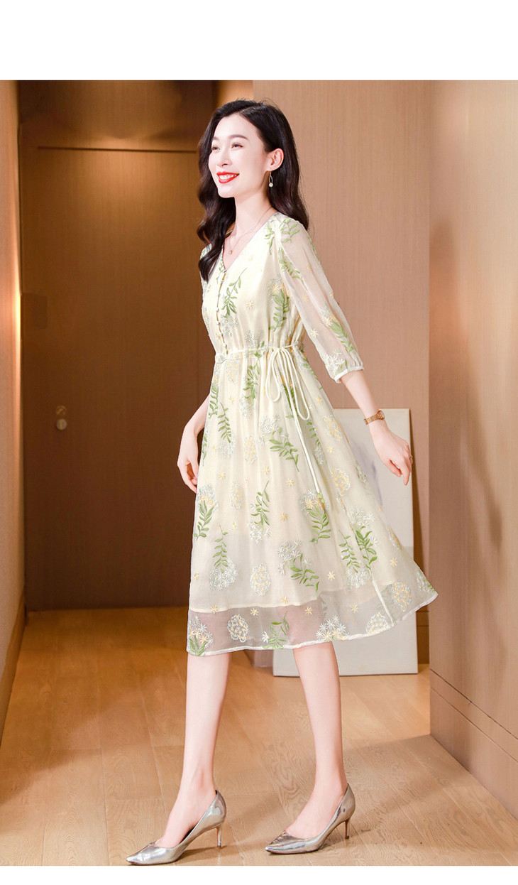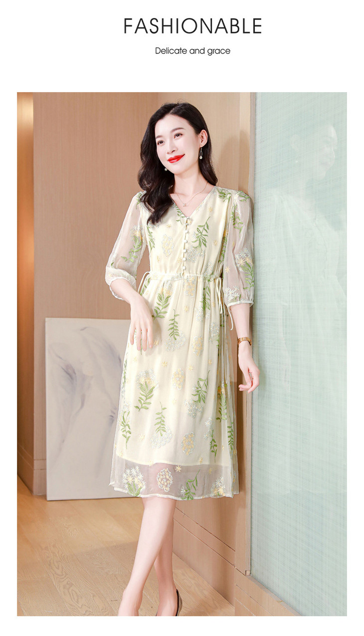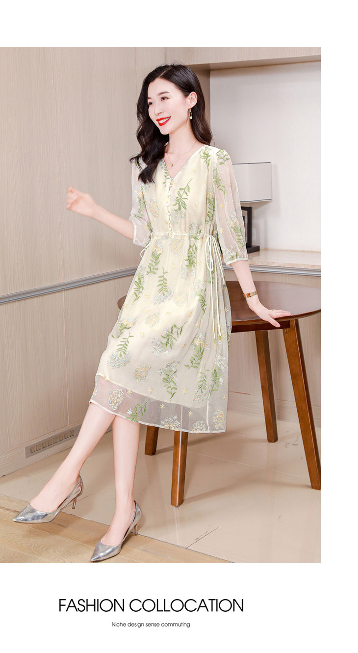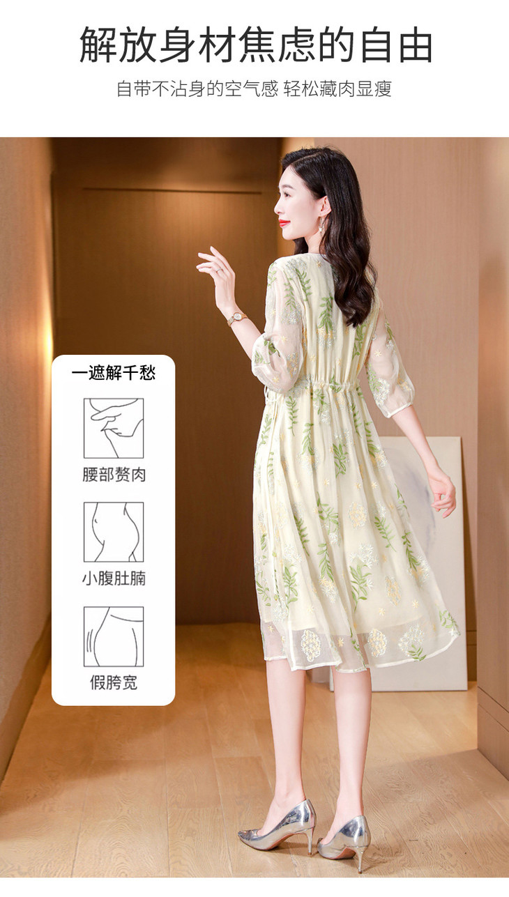 ASE2024夏季V领五分袖气质优雅真丝连衣裙