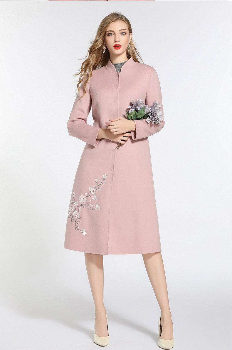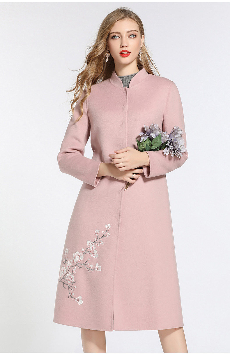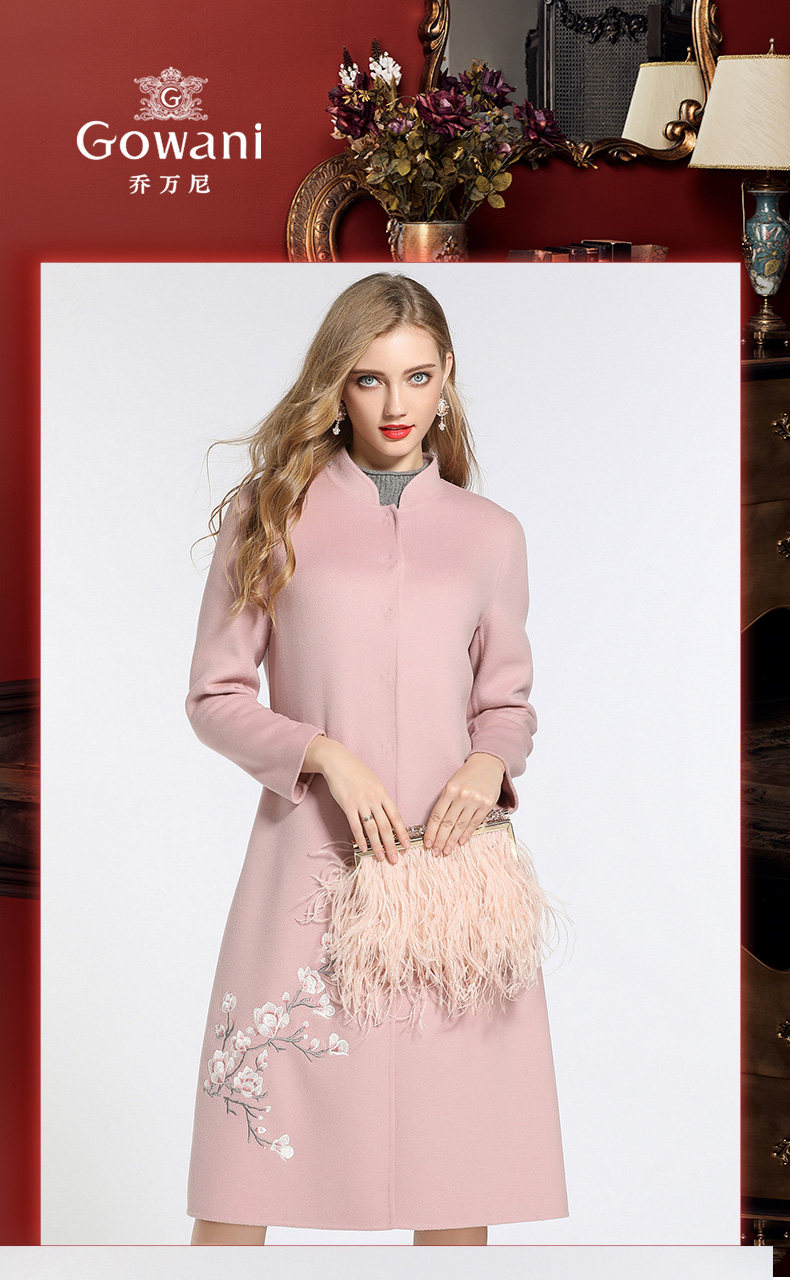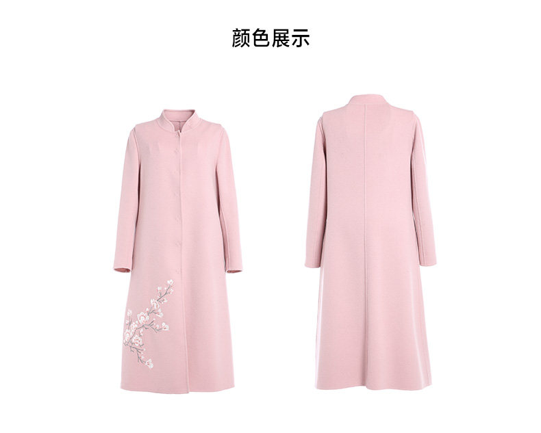 【100%绵羊毛】乔万尼羊毛双面呢大衣女流行外套粉色绣花修身过膝长款呢子冬EB4A028