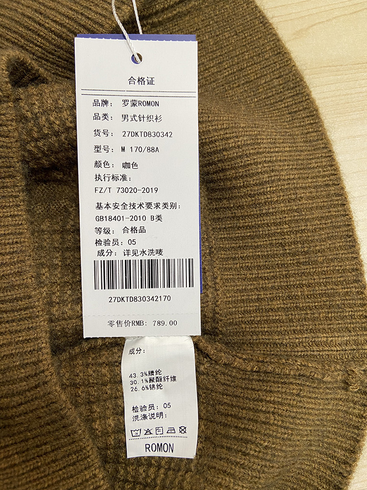 面料:43.3%腈纶 30.1%聚酯纤维 26.6%锦纶