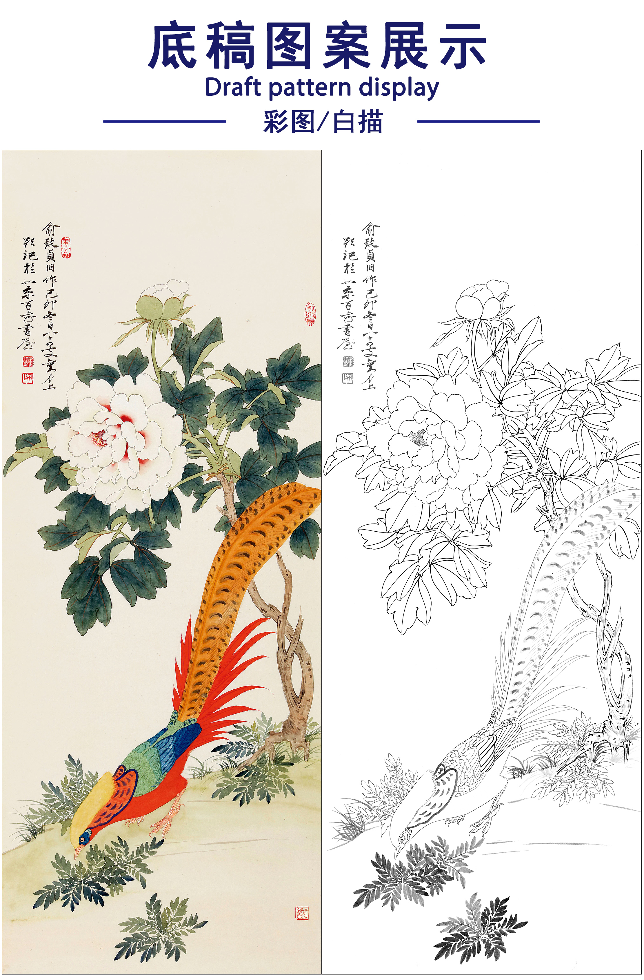 俞致贞花鸟工笔画白描底稿《牡丹锦鸡》临摹勾线高清打印稿ZZ64