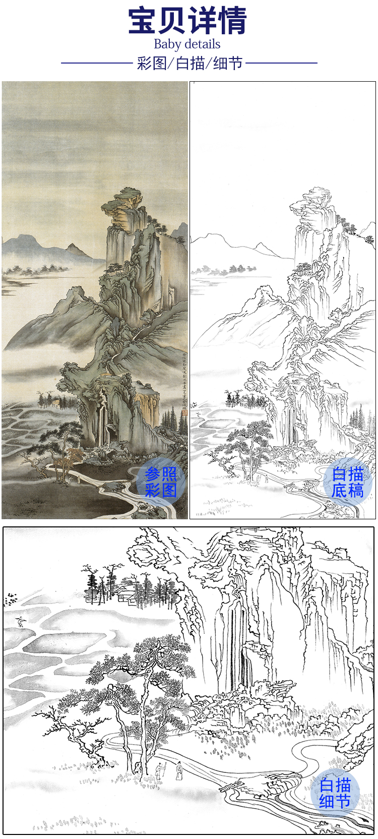 竖幅工笔画山水白描底稿-金城-临刘永年山水-多种白描尺寸可选-JS06