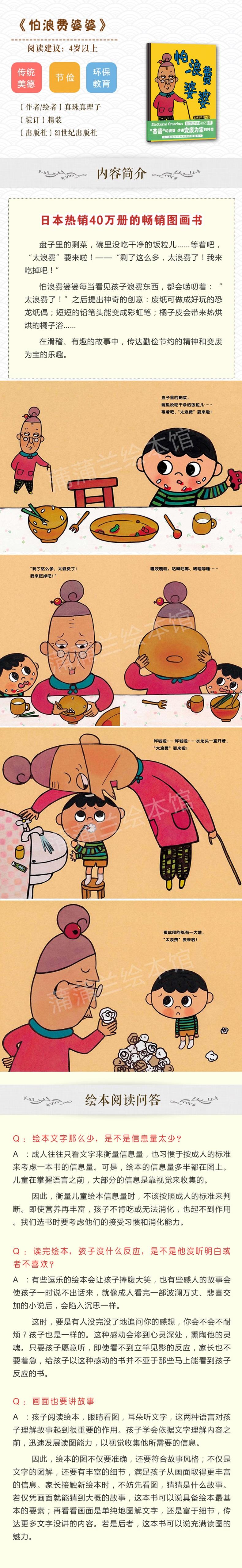 《怕浪费婆婆》讲述了:读了书名,你肯定就已猜到,怕浪费婆婆一定是位特别爱惜东西、注意节俭的老人。的确,如果看见有人浪费,她可绝不允许。而且她总有各种办法处理那些没有被好好利用的东西,不管是吃剩的饭菜,还是揉皱的纸团……