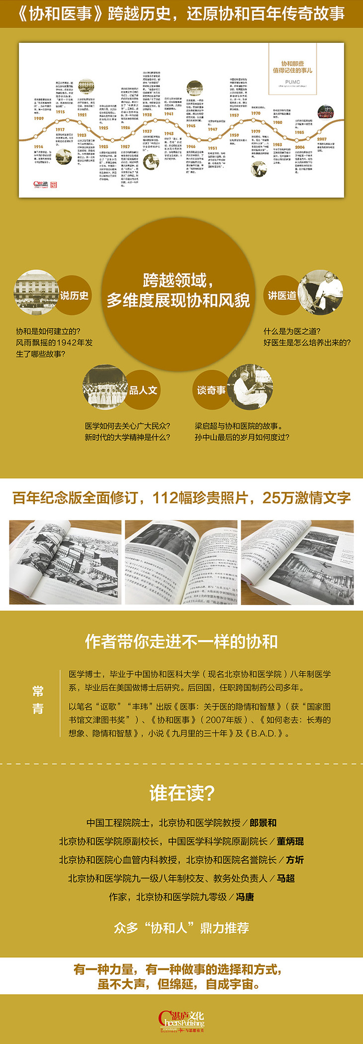 l 一段故事,一个理想,和沸腾的生活。《协和医事》全面修订,112幅珍贵老照片,25万激情文字,回顾协和百年传奇故事,洞察新时代医学之道。