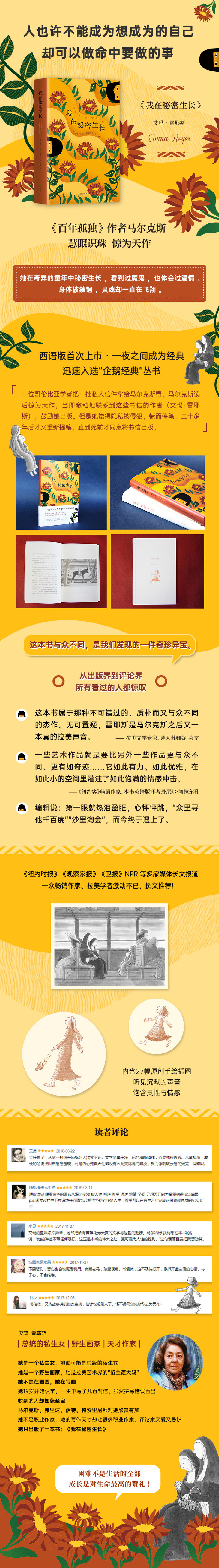 《我在秘密生长》内容简介:艾玛·雷耶斯是一位拉美画家,一生中写过几封信,有幸收到的人都如获至宝,其中一位就是哥伦比亚学者赫曼·阿西涅加斯。对好友文笔大感叹服的阿西涅加斯不惜打破守密誓约,私下把这些讲述童年往事的信件给《年孤独》作者加西亚·马尔克斯看。马尔克斯读后惊为天作,写信鼓励她要把书信集结成书,并继续创作。然而,她觉得隐私被侵犯,愤而拒绝,停笔二十多年,直到死前才同意出版。