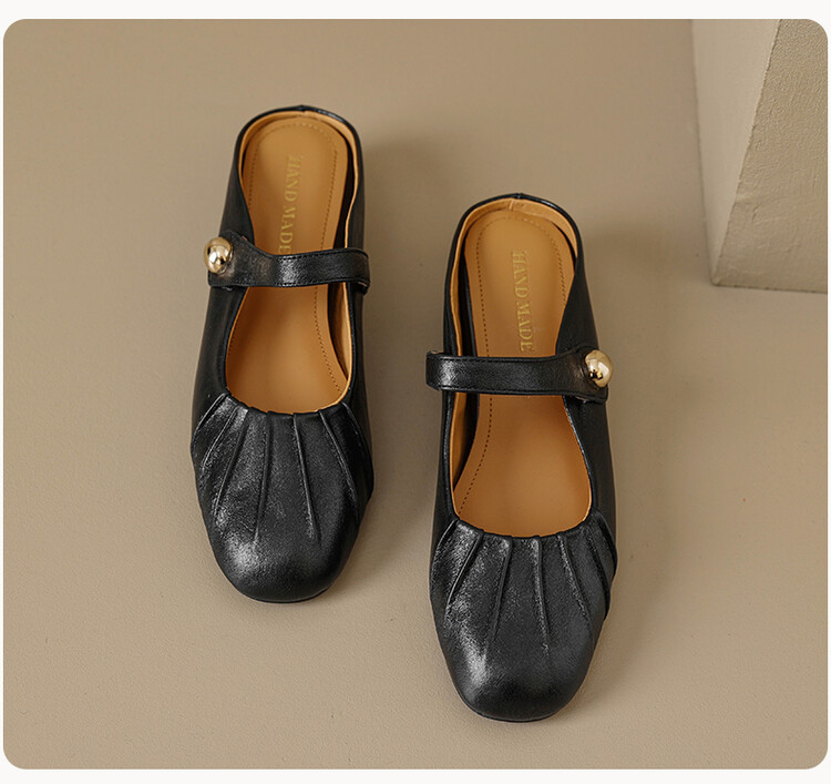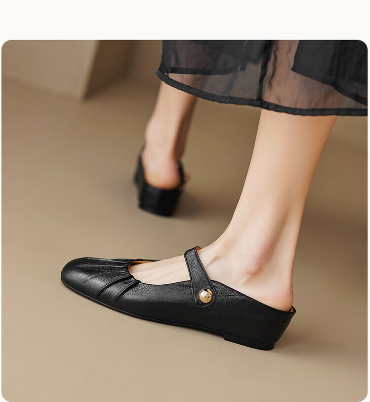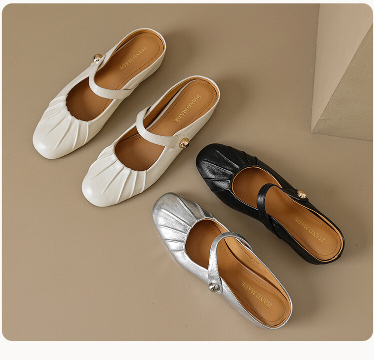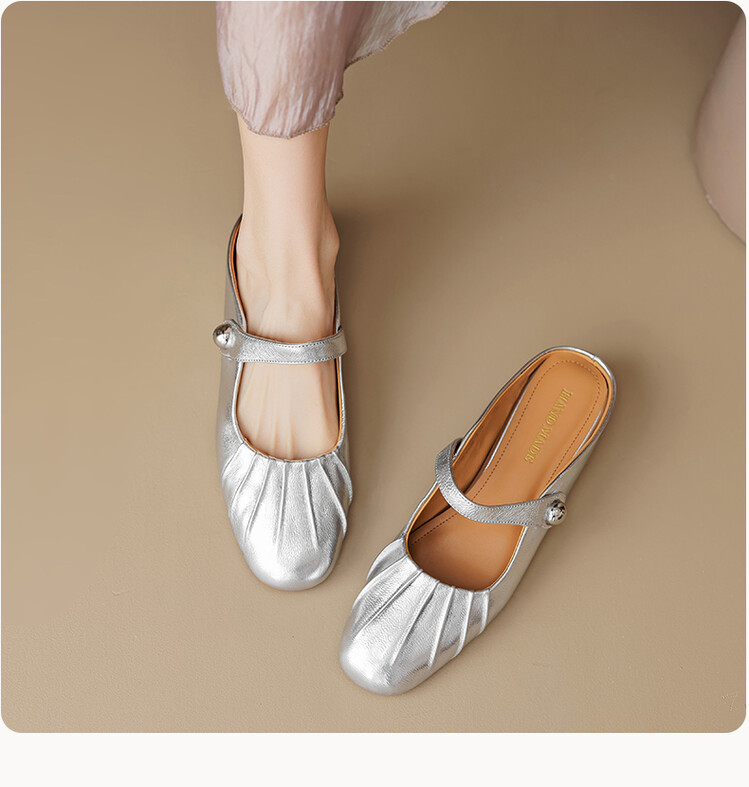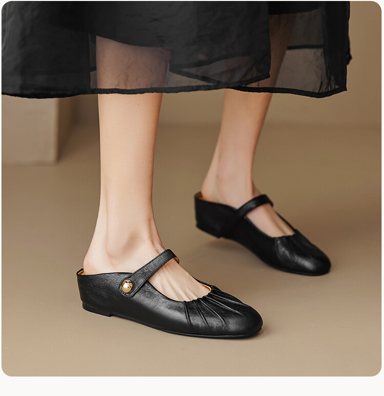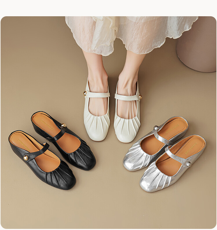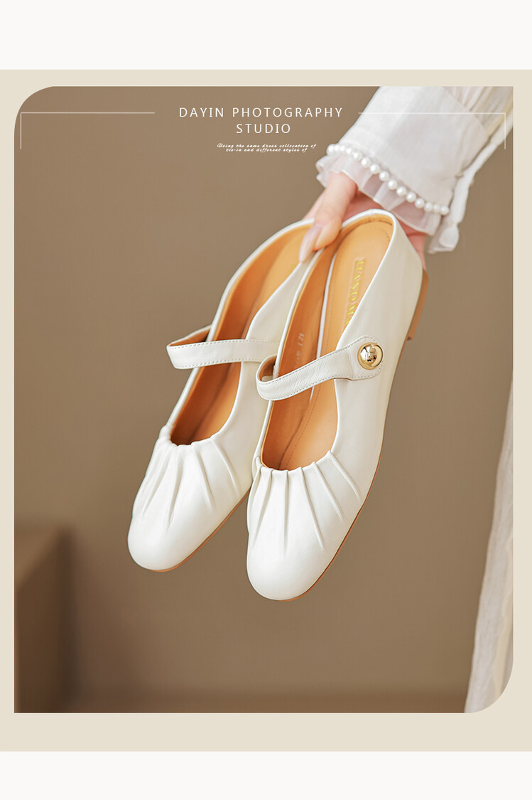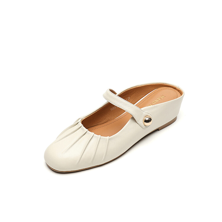 【预售5天】夏软面羊皮平底内增高3.5cm玛丽珍凉鞋女折皱纹法式一字带拖鞋OFSM&6900