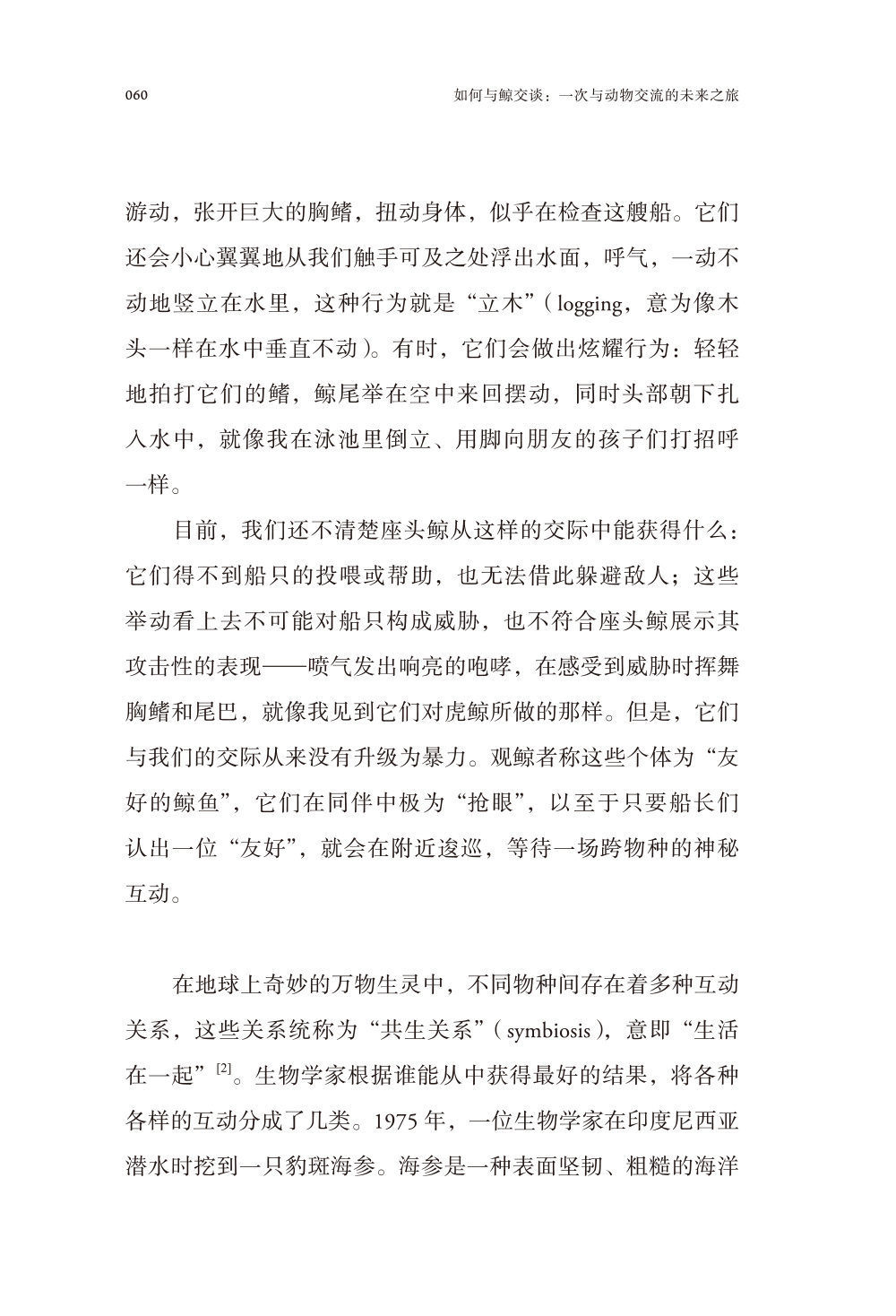 2.书中集合了生物学、解剖学、语言学领域的诸多研究成果,包括动物语言研究、动物行为研究、鲸鱼构造解剖、鲸鱼叫声研究等。读者可以跟随作者一起探访多位专家学者,近距离认识鲸鱼、海豚等鲸类动物惊人的高智商隐秘。