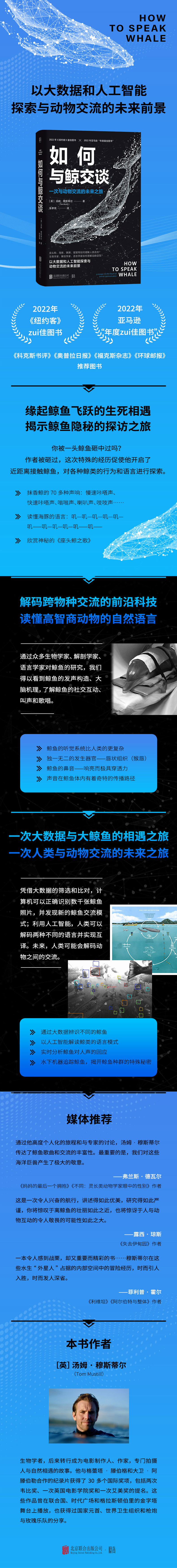 作为自然主义者和野生动物电影制片人,穆斯蒂尔开始调查世界各地的人类与鲸鱼的互动,探索利用“水下耳朵”、机器鱼、人工智能(AI)等来发现动物对话模式、解码动物语言的研究。这是一项令人兴奋的调查,从17世纪的显微镜和列文虎克,到19世纪的捕鲸业、20世纪的鲸鱼解剖,再到21世纪最前沿的大数据,本书研究了世界各地的科学家和科技公司对各种动物交流所做的各种解码实验,例如,“鲸类翻译计划”“鲸鱼来电”“动物语言实验”“理解海豚语”“镜像自我识别”“回放实验”等,将我们带到了解码动物交流的前沿。他发现,当大数据与大野兽开始结合,生物学正在发生一场认知革命,颠覆了我们对这些神秘生物的大部分了解。作者用亲身经历和扣人心弦的探索,展示了过去、现在和未来的科学家是如何尝试与动物交流,尤其是如何更好地了解鲸类动物的。