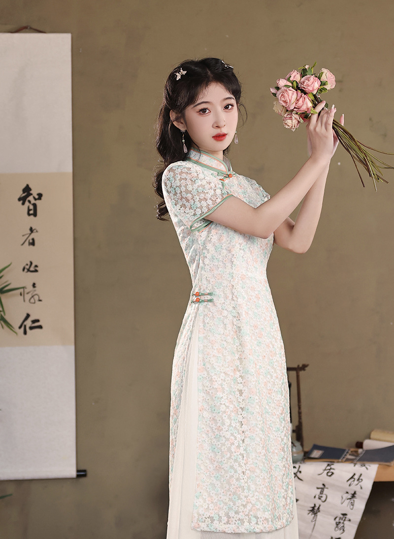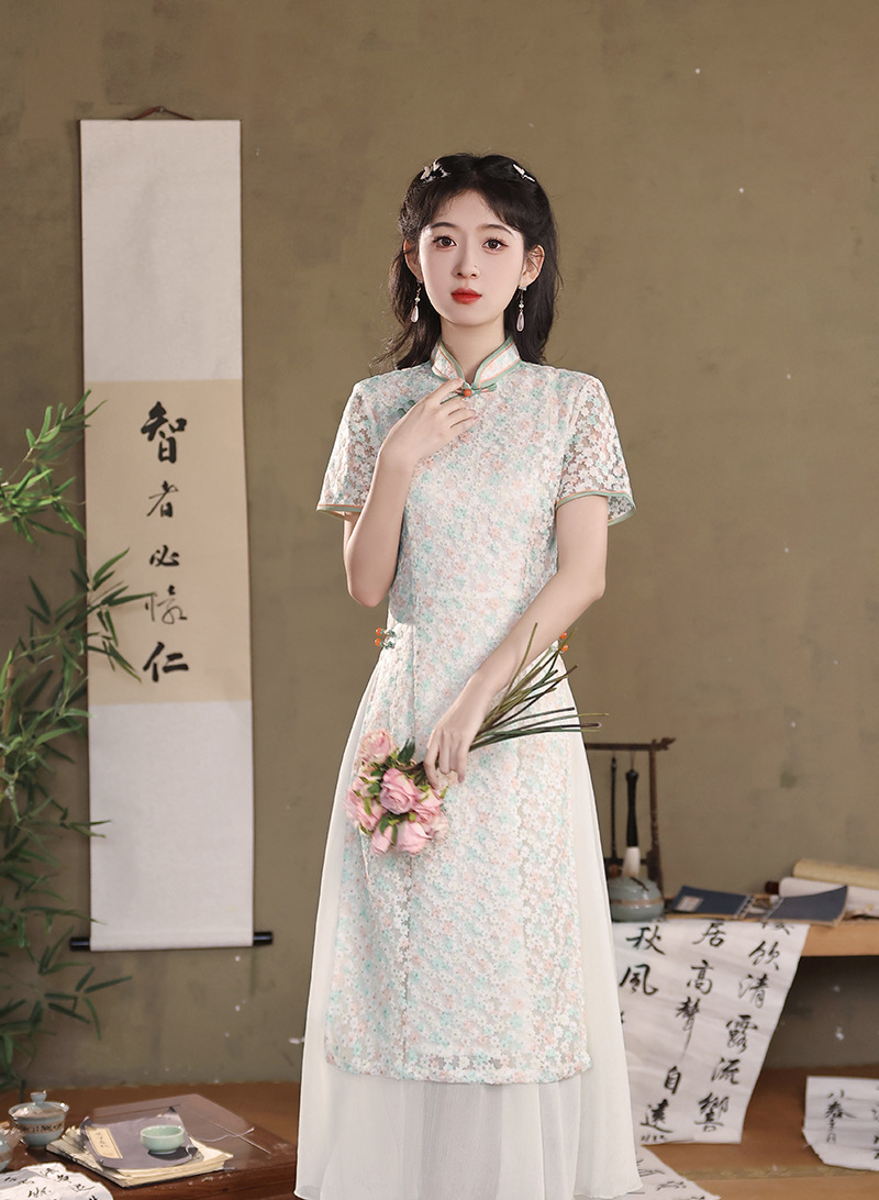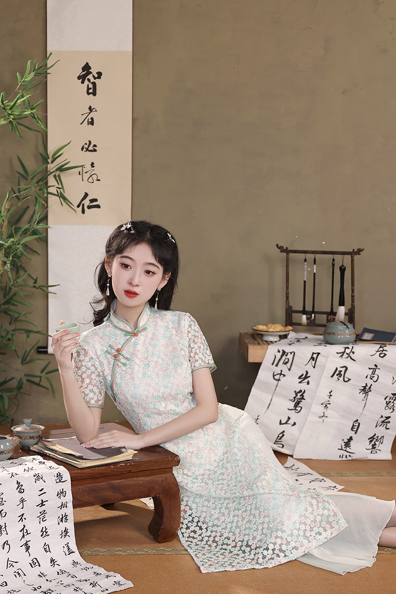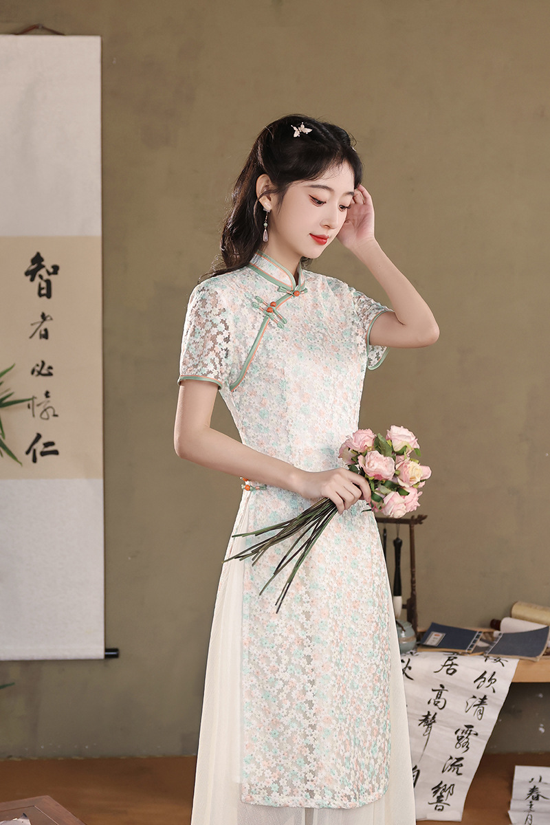气质蕾丝修身日常,长款奥黛旗袍XL-24103