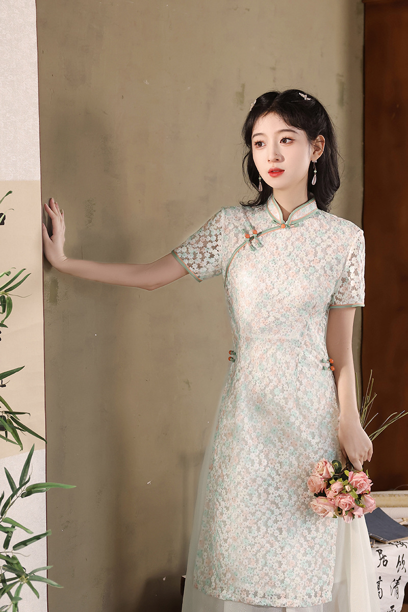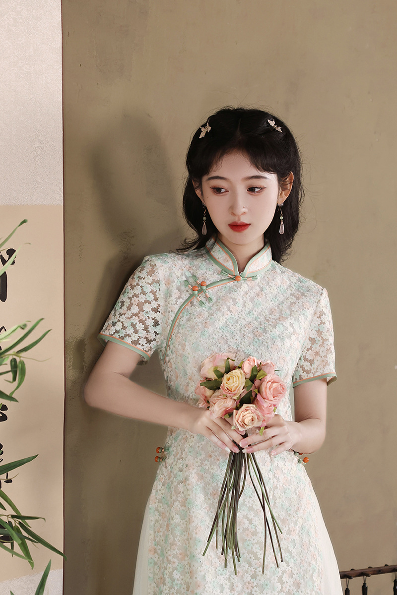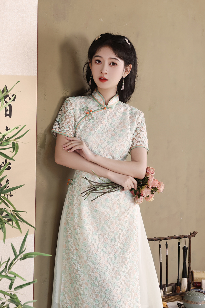 气质蕾丝修身日常,长款奥黛旗袍XL-24103