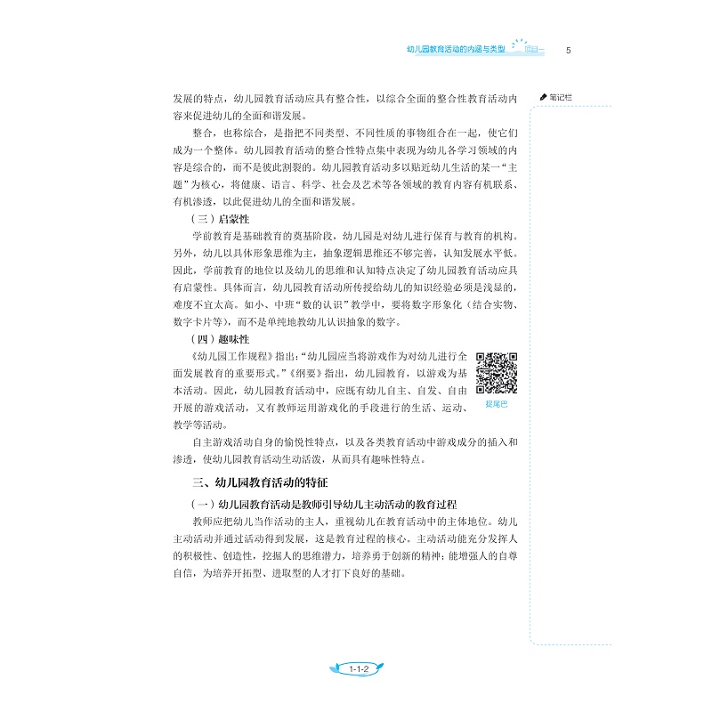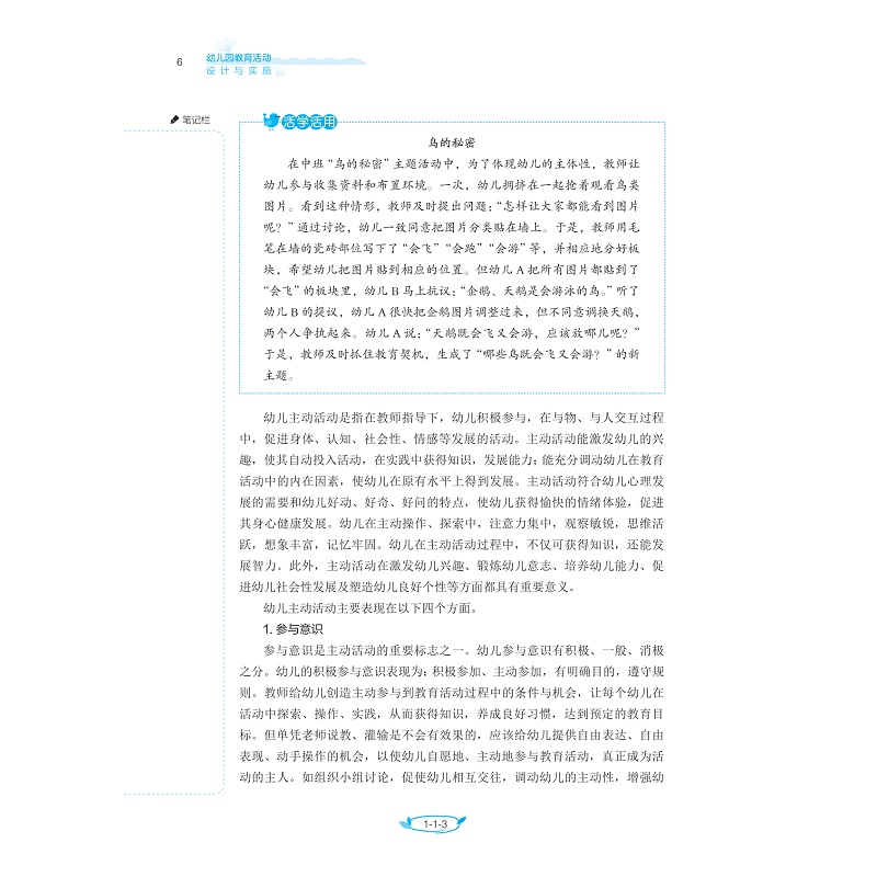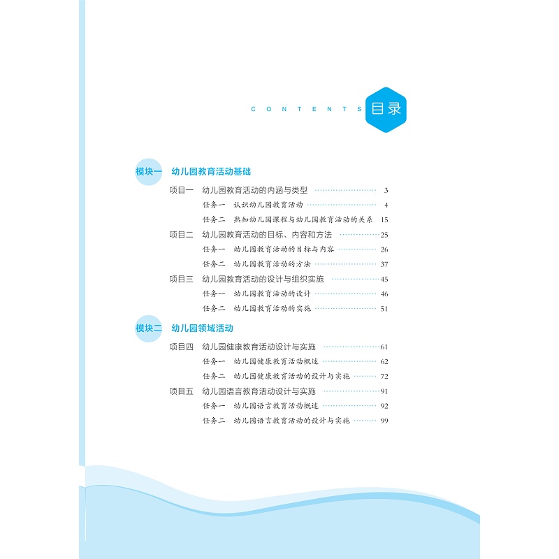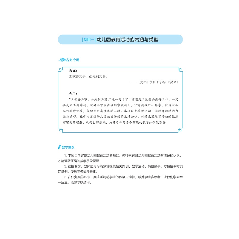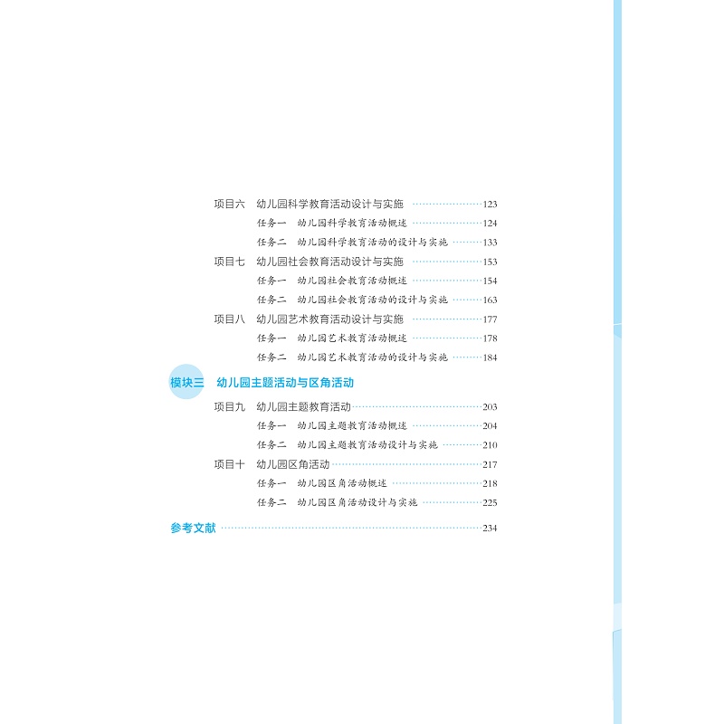 《幼儿园教育活动设计与实施》为学前教育专业的核心课程,能够设计出优秀的教育活动案例并加以实施,是幼儿教师必须具备的技能之一。本教材在内容的编写上,严格按照《幼儿园教师专业标准(试行)》《教师教育课程标准(试行)》《3-6 岁儿童学习与发展指南》的精神和要求编写,既保证了学科的系统性、完整性,又体现了知识的科学性、先进性,同时注重技能训练的实用性。本教材在幼儿园教育活动设计原理的基础上,以幼儿园教育活动的设计与实施为着眼点,理论与实践相辅相成,有机整合幼儿园教学案例,充分明晰幼儿园教育活动的设计、组织、实施以及评价的要点,每个任务通过“知识学习→案例讨论→应用实践”等环节的递进式学习,可以有效提高学生评析及设计教学活动的能力。