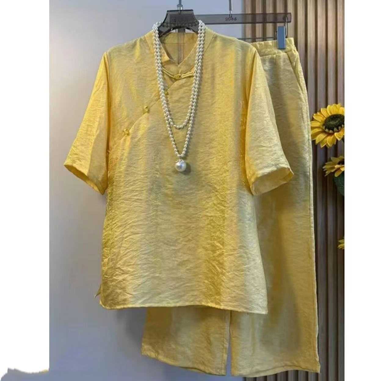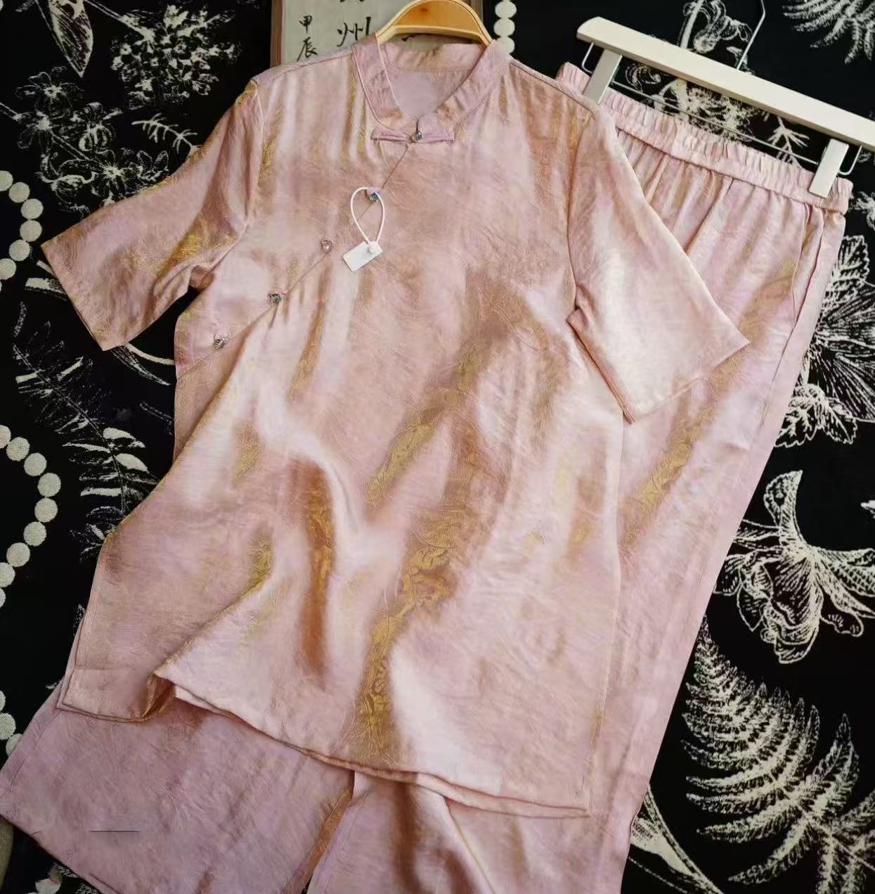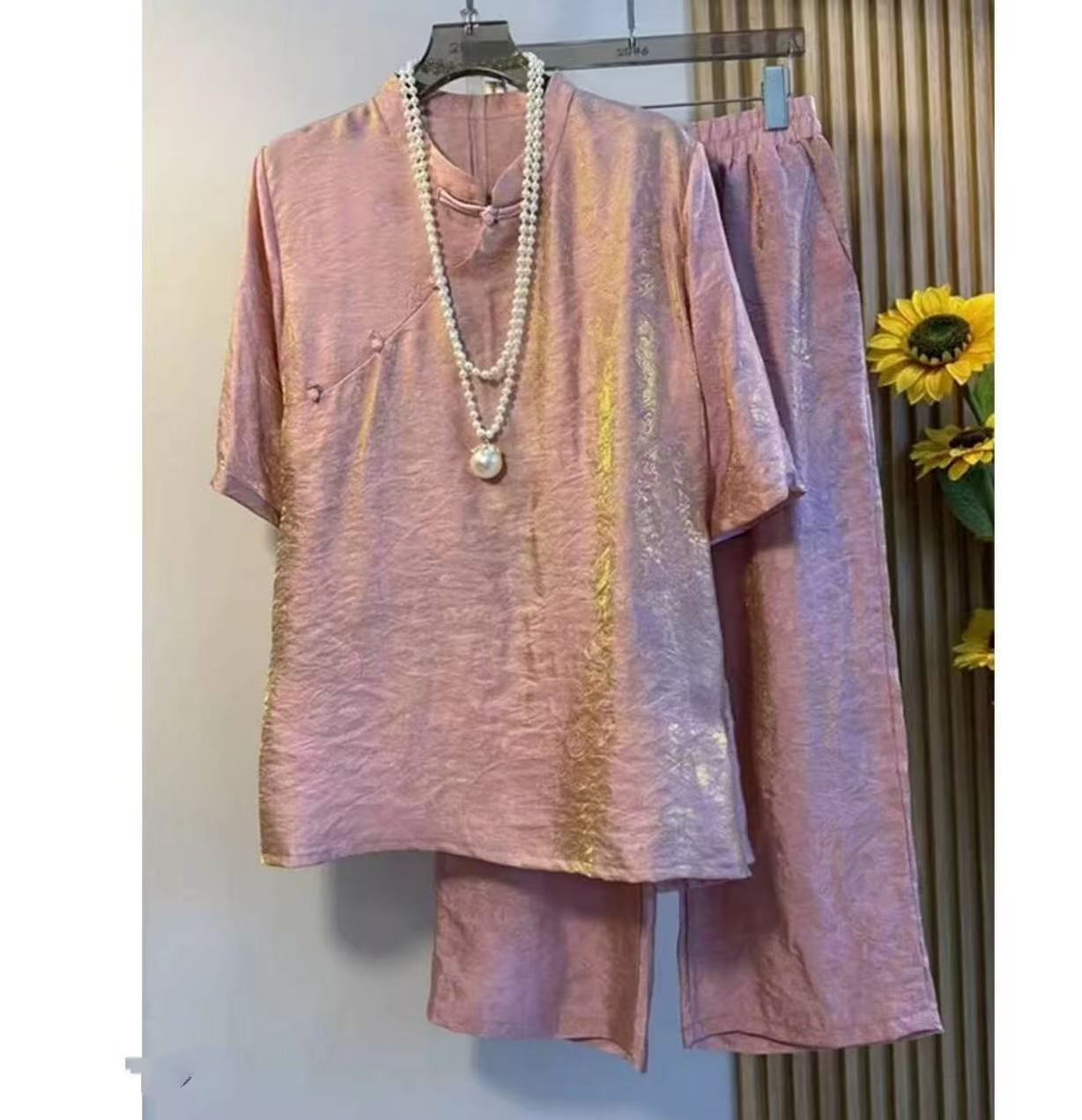丁摩 【套装】新中式国风浮光锦盘扣旗袍套装轻奢上衣裤子一整套5ZF-154