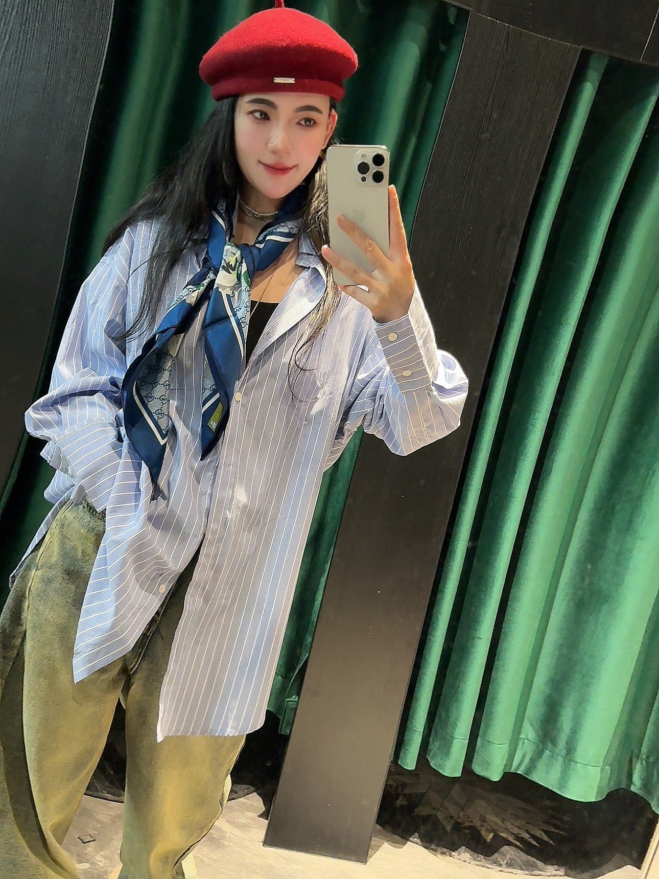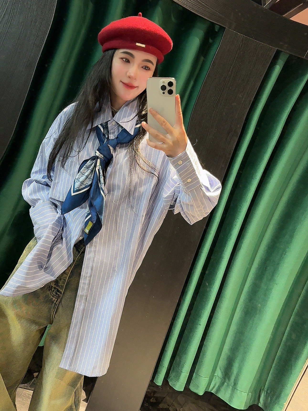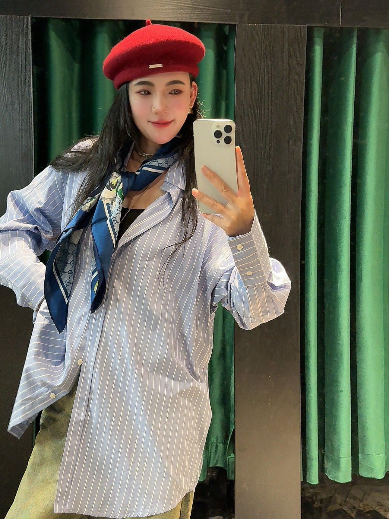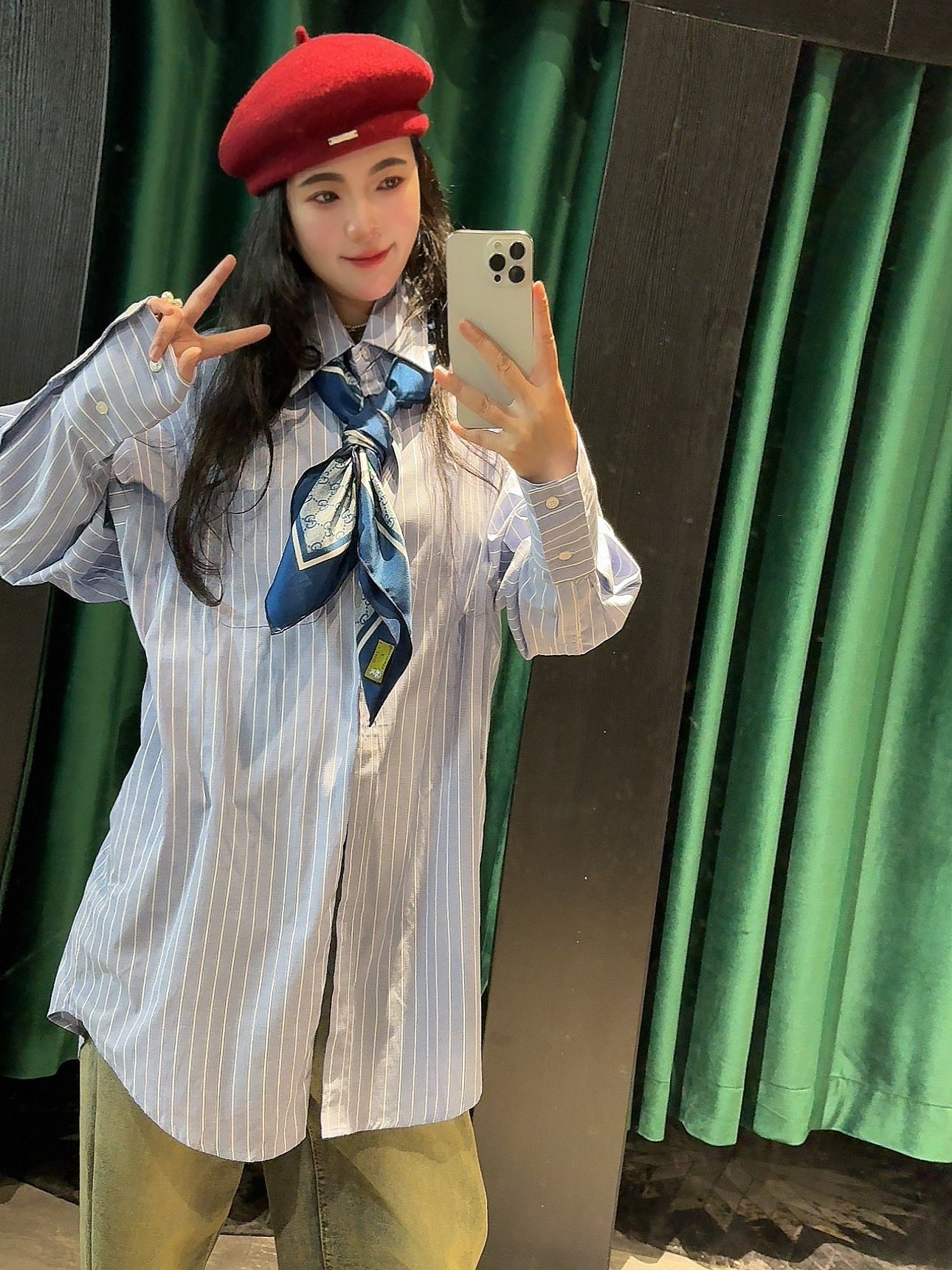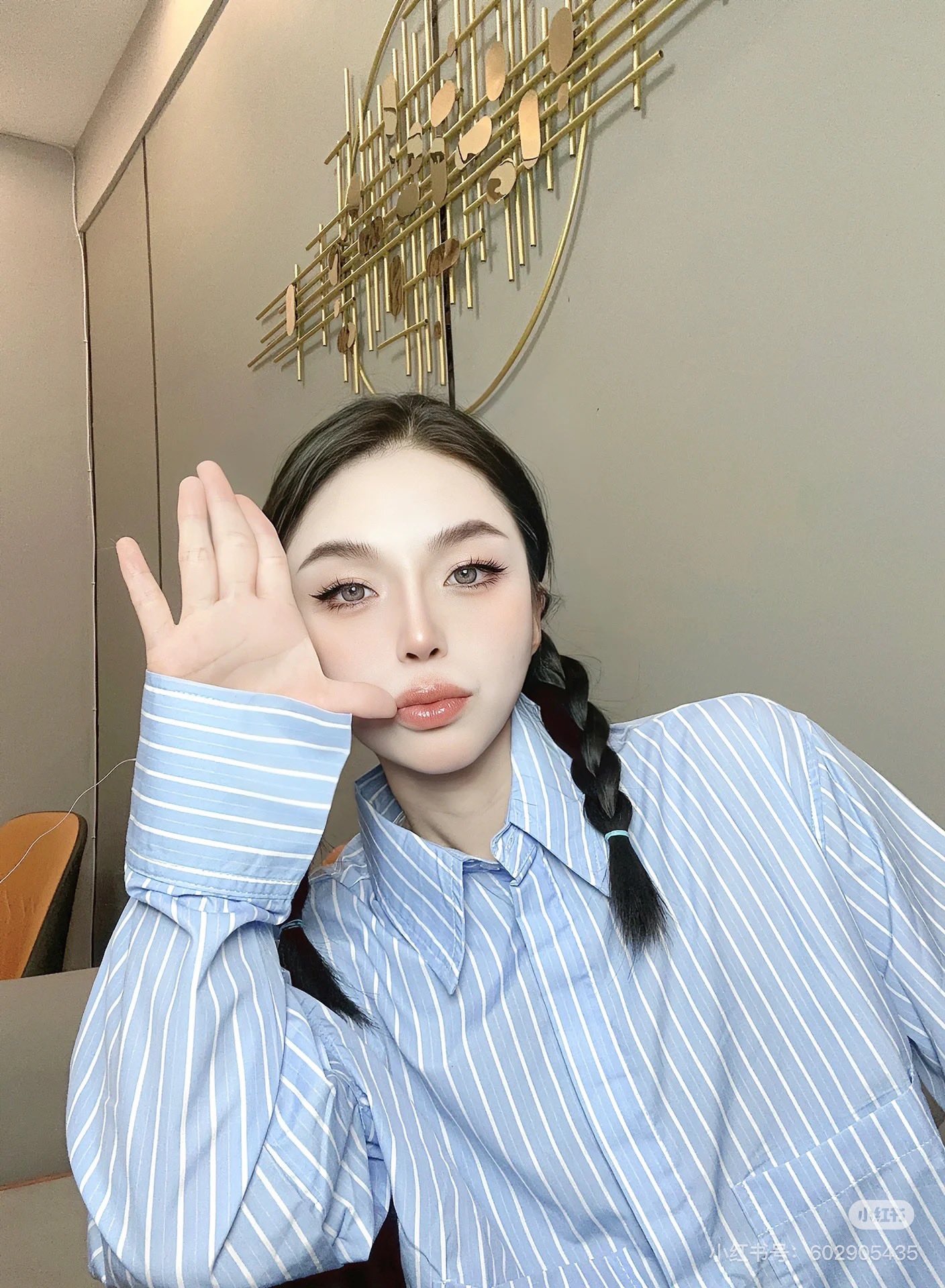 真的显白我宣布蓝色条纹才是最韩的颜色!!这个条纹衬衫我真的超喜欢,有轮廓的版型贼显瘦!上身超级无敌巨巨巨显白啊啊啊这么多年zui满意的一件了!!