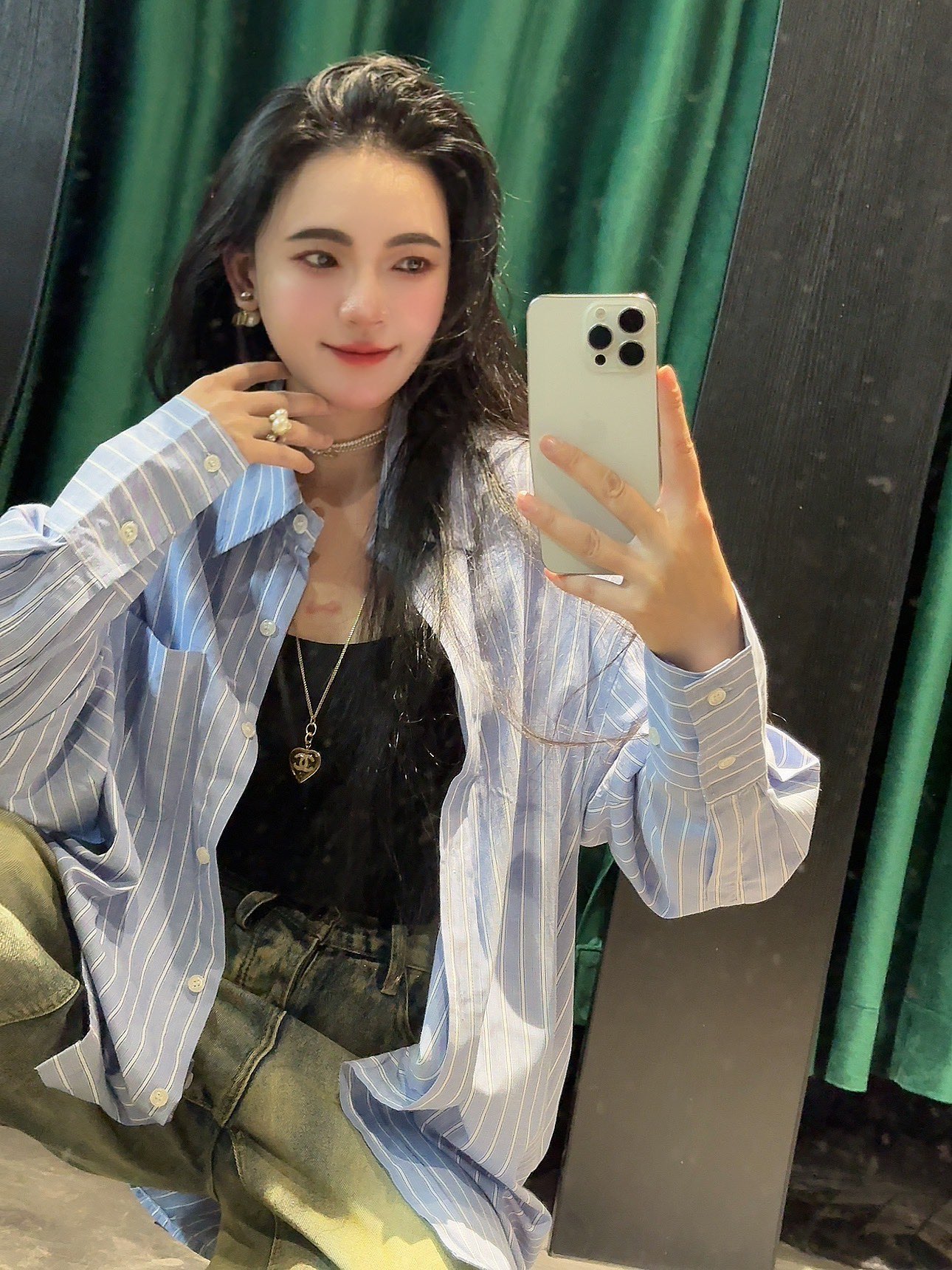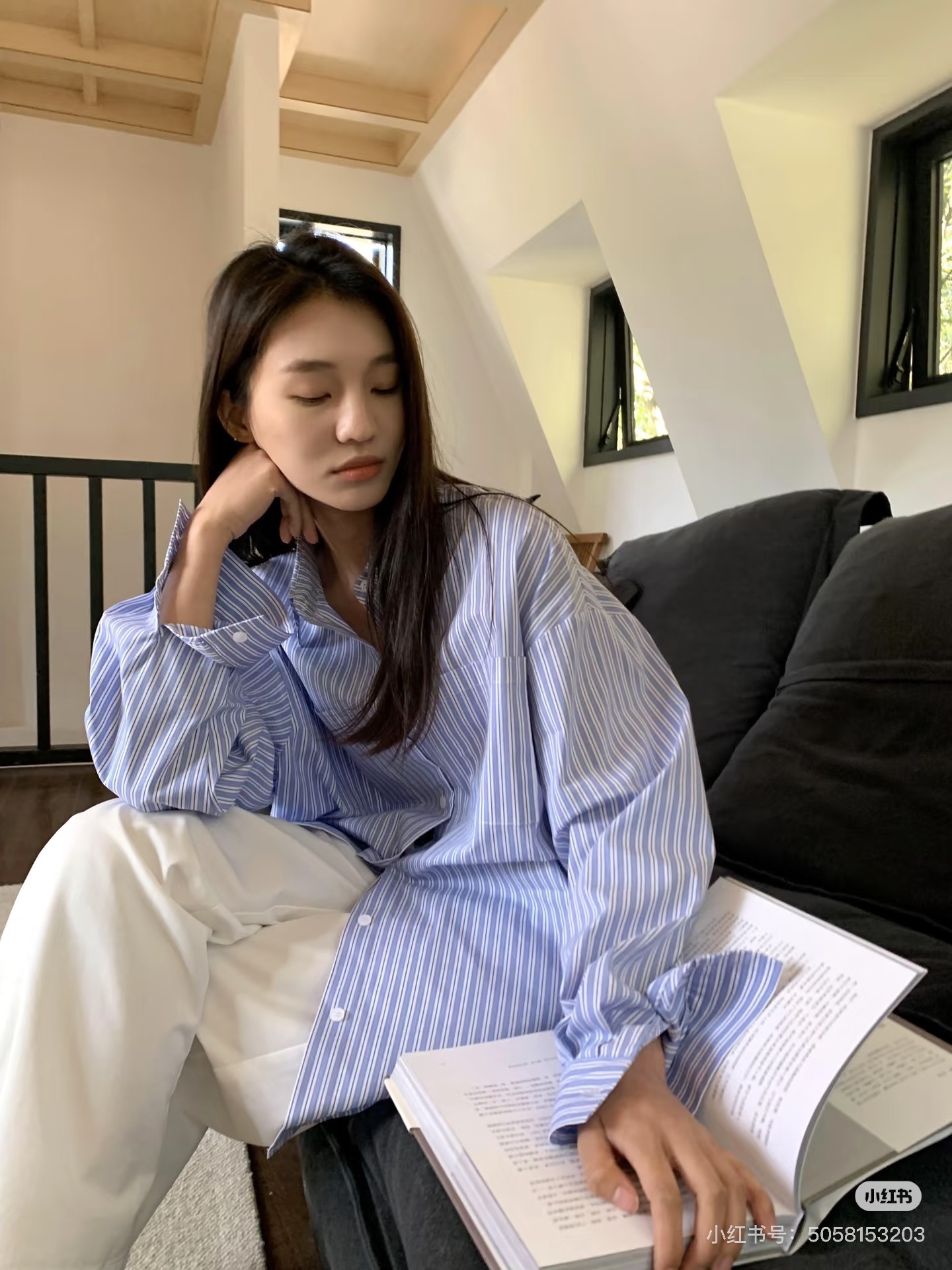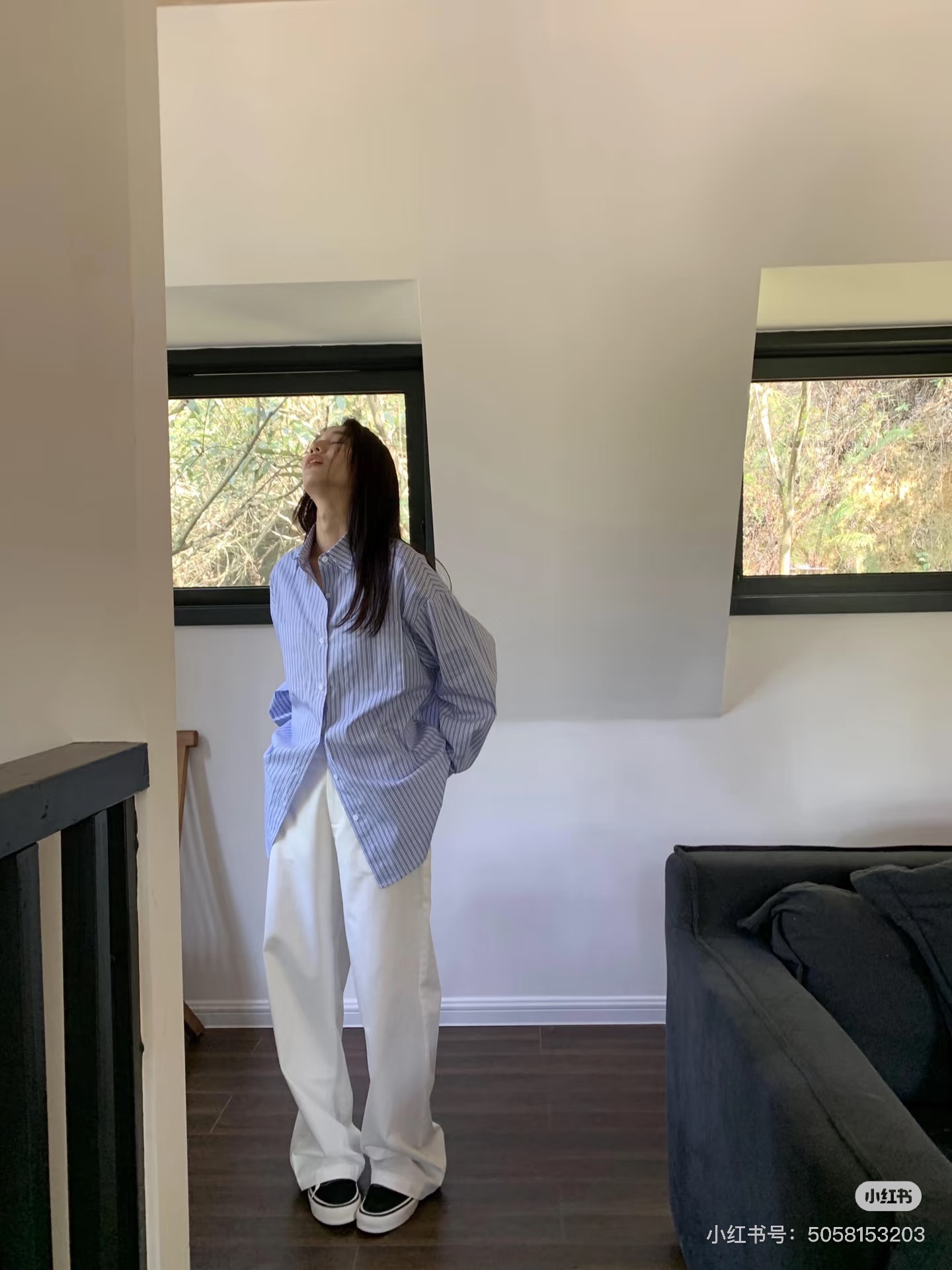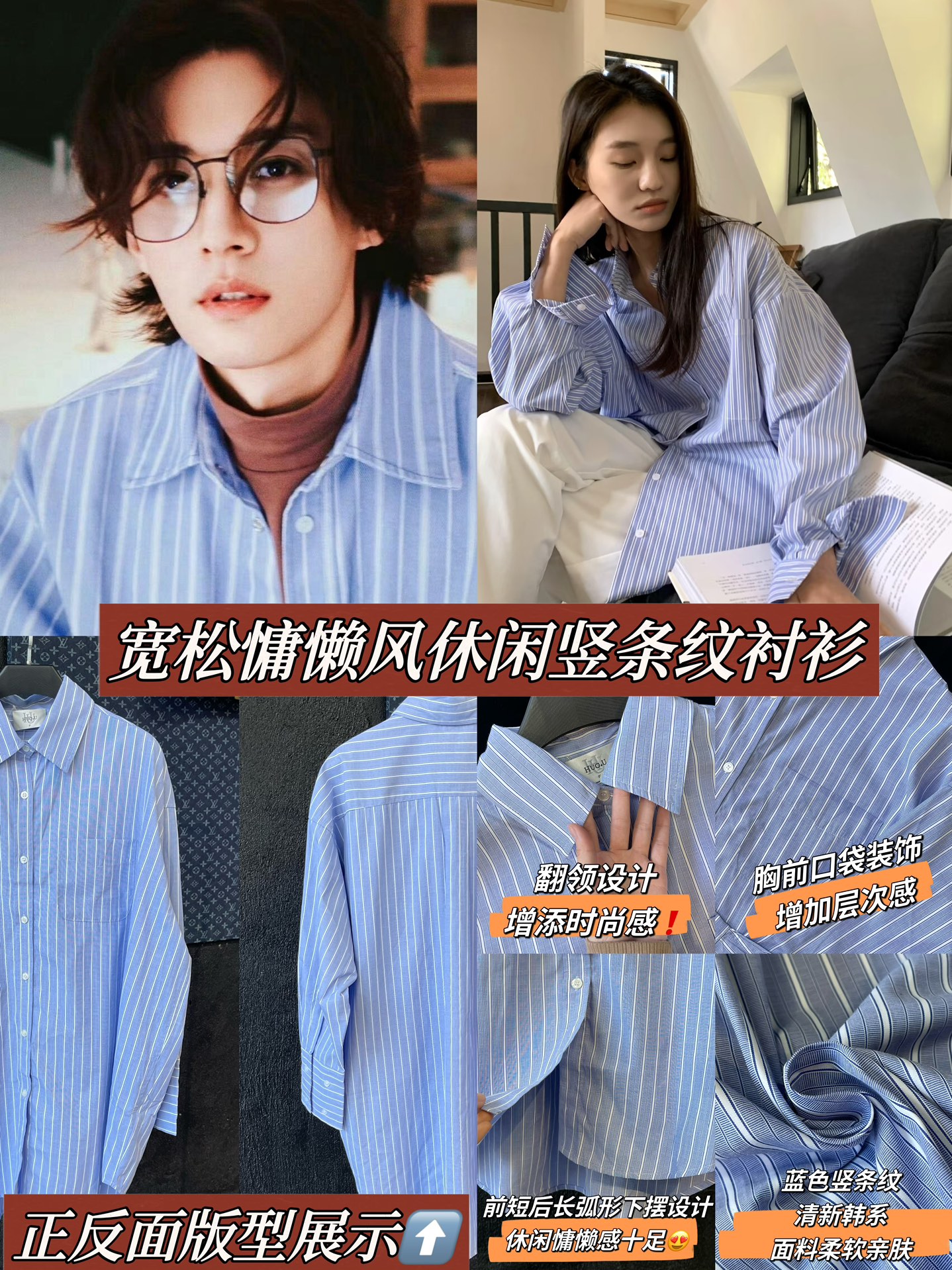 宽松慵懒风休闲竖条纹衬衫,蓝色条纹衬衫就是初秋的本命战衣!韩里韩气的蓝色条纹衬衫!干净的蓝白条纹,既不单调也不会太过张扬,宽松舒适的廓形不挑身材,单穿叠穿内搭都好看日常简约又百搭,面料不扎不易皱上身显气质显白,这件真的穿不腻!
