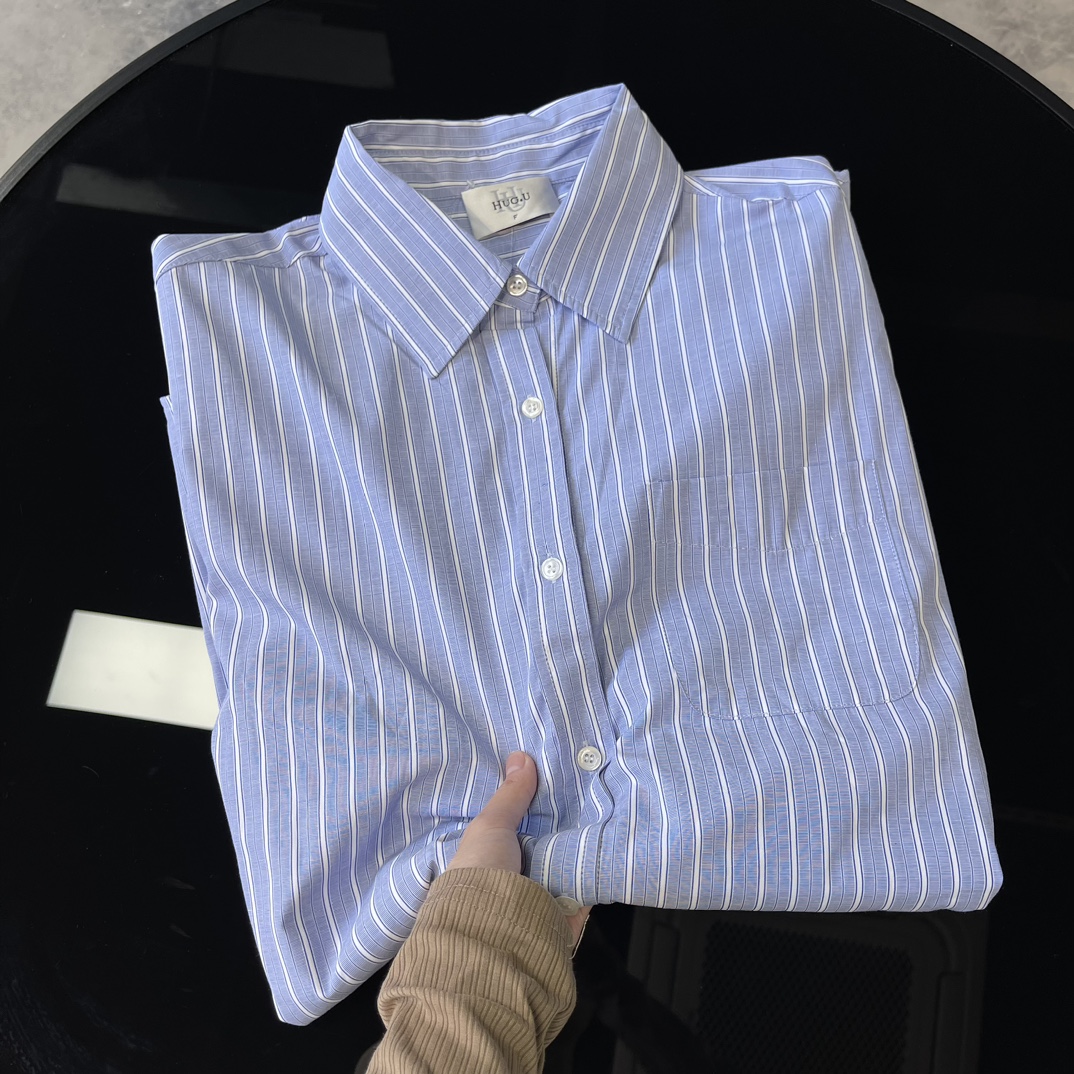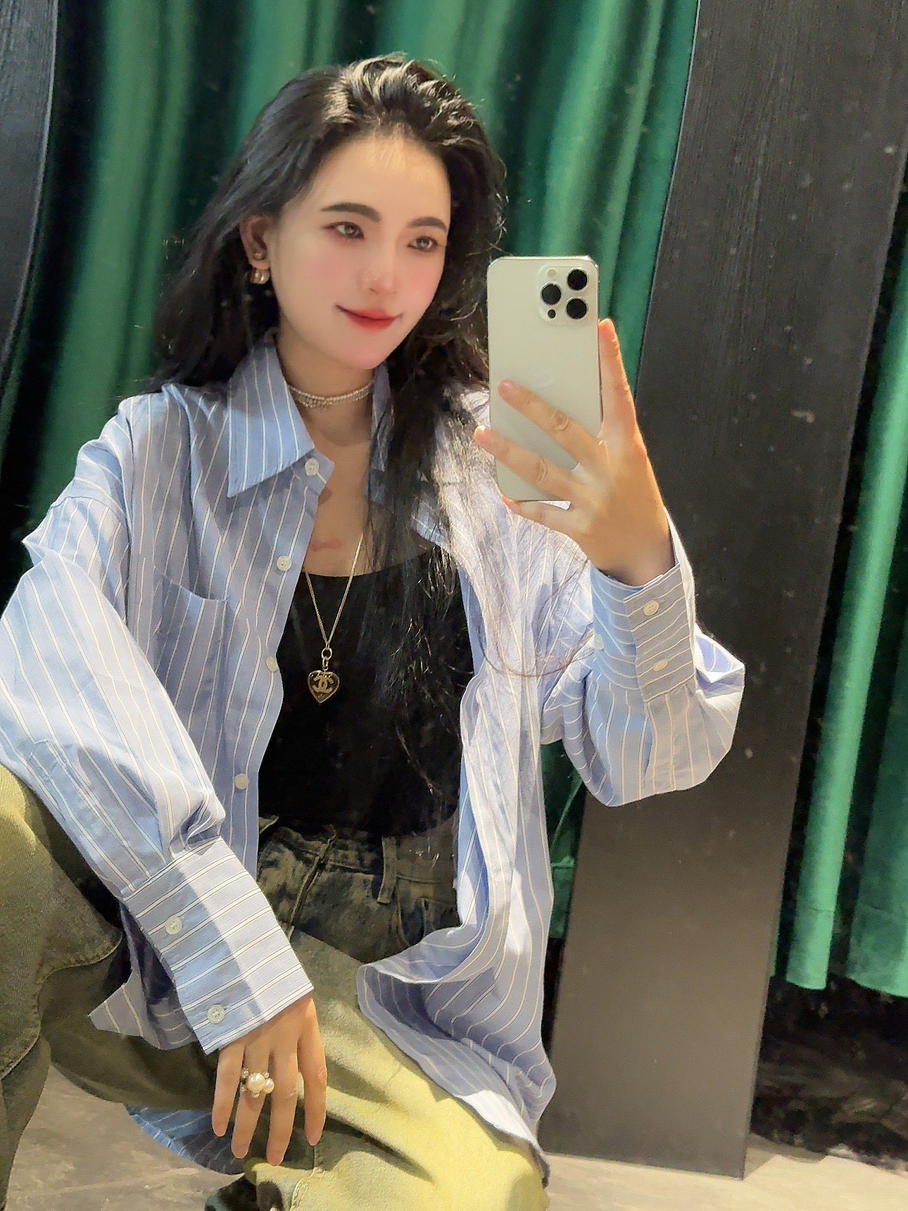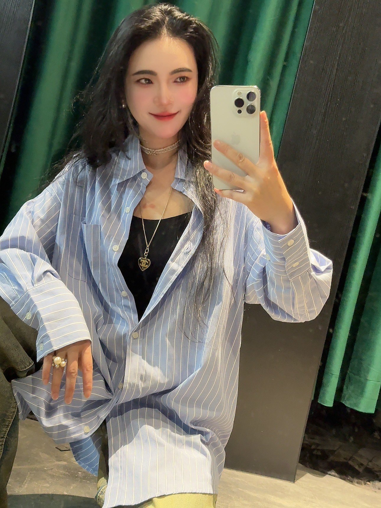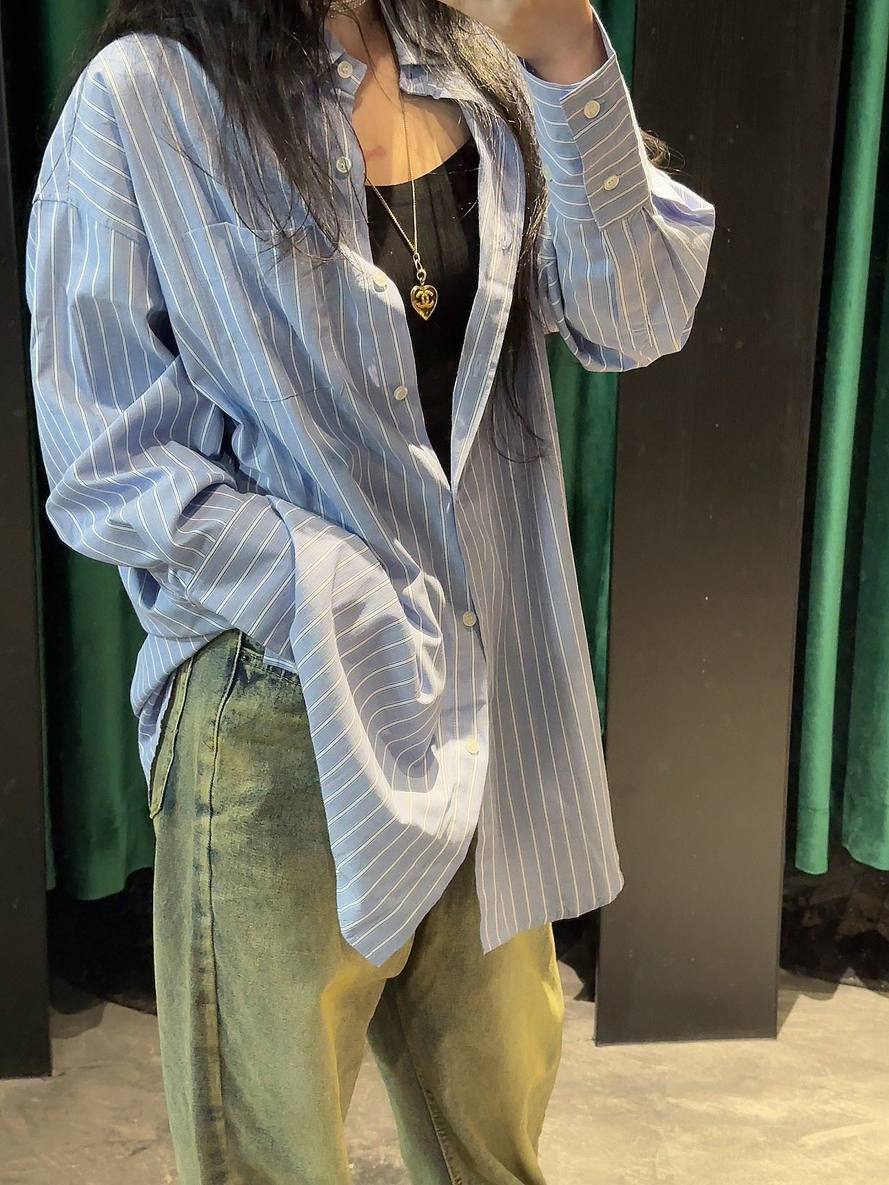 宽松慵懒风休闲竖条纹衬衫,蓝色条纹衬衫就是初秋的本命战衣!韩里韩气的蓝色条纹衬衫!干净的蓝白条纹,既不单调也不会太过张扬,宽松舒适的廓形不挑身材,单穿叠穿内搭都好看日常简约又百搭,面料不扎不易皱上身显气质显白,这件真的穿不腻!
