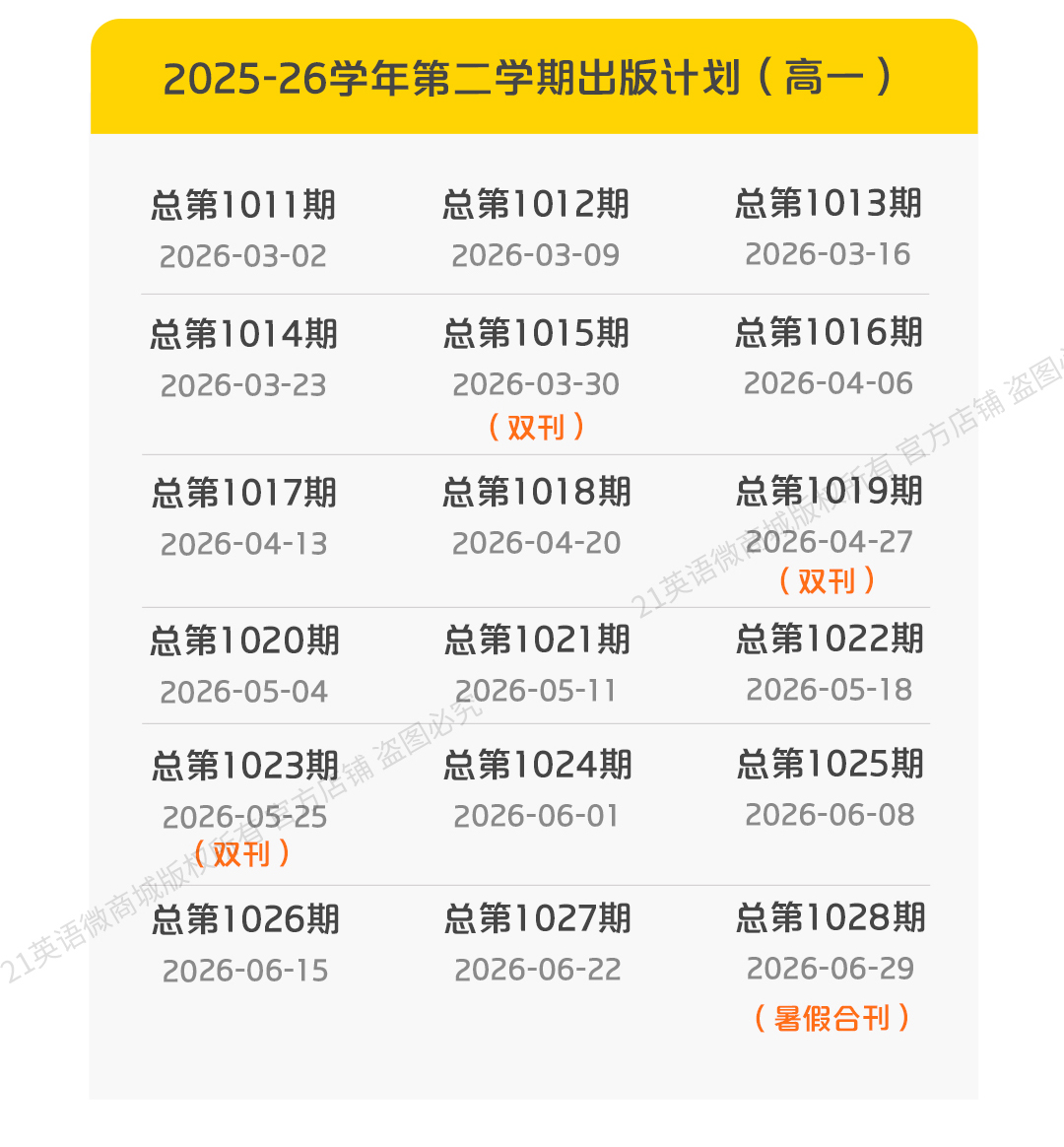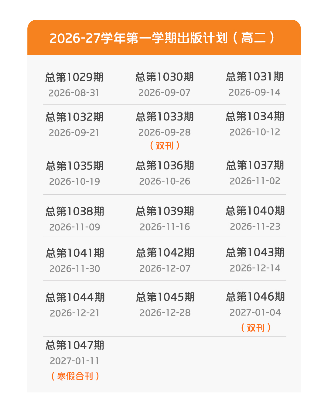 本学年出版计划共包含7期合刊。其中5期为双刊,定价6.4元,出版日期分别为3月30日、4月27日、5月25日、9月28日、27年1月4日;1期为暑假合刊,定价16元,出版日期为2026年6月29日;1期为寒假合刊,定价16元,出版日期为2027年1月11日。