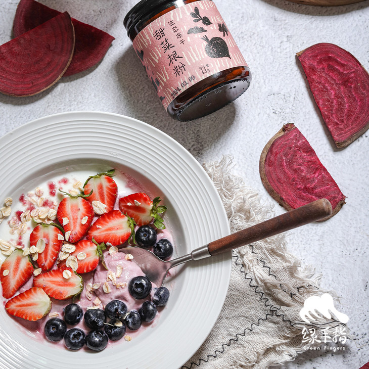 【超级食物辅助】甜菜根粉可以搭配奇亚籽、洋车前子壳、蓝莓粉等超级食物一同食用,也可加水共同放入料理机搅拌,做成混合蔬果汁。