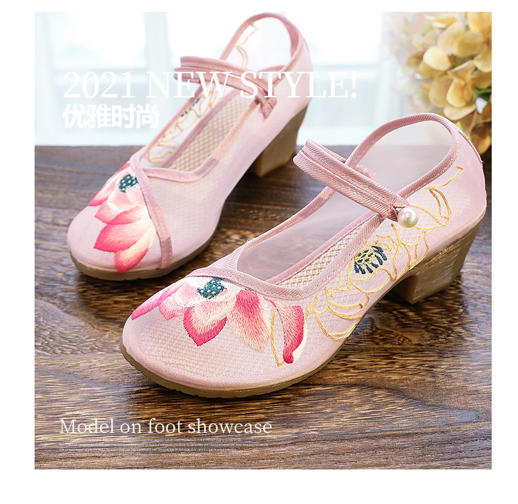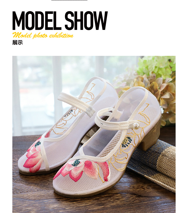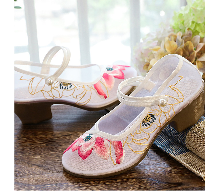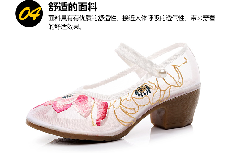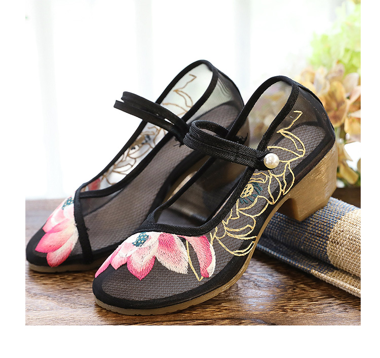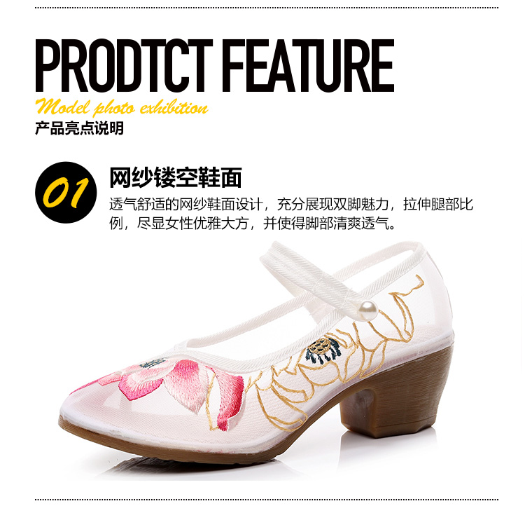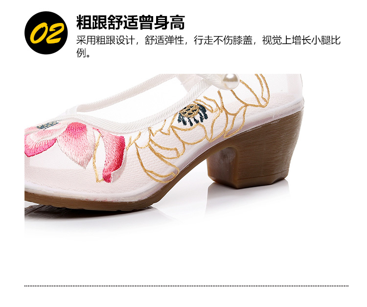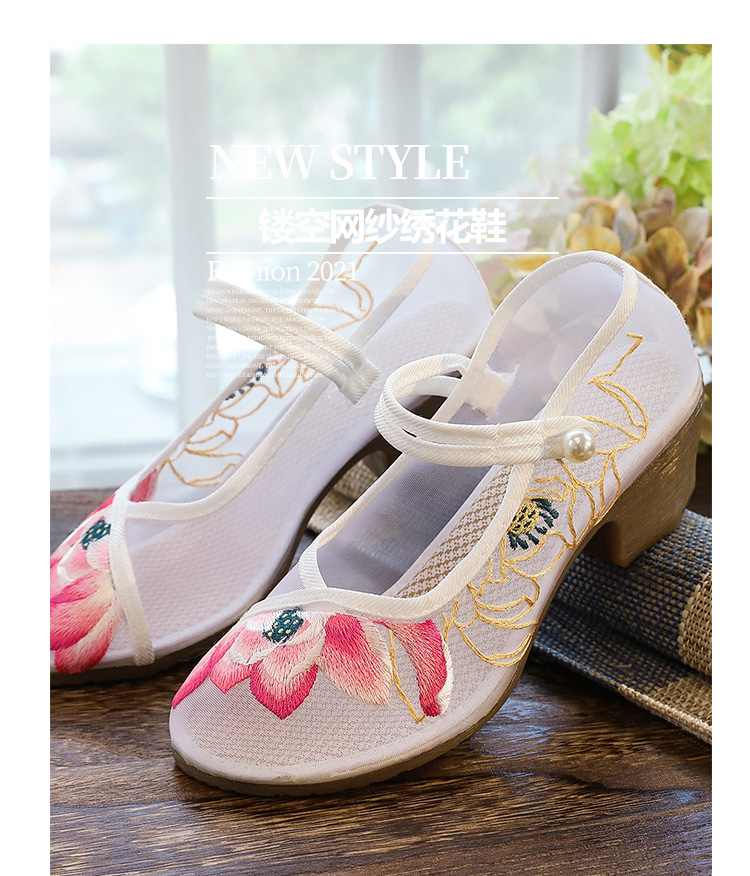 荷花刺绣高跟粗跟夏季古风镂空网纱绣花鞋XQX并蒂莲