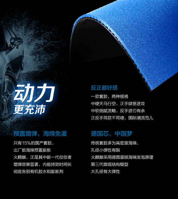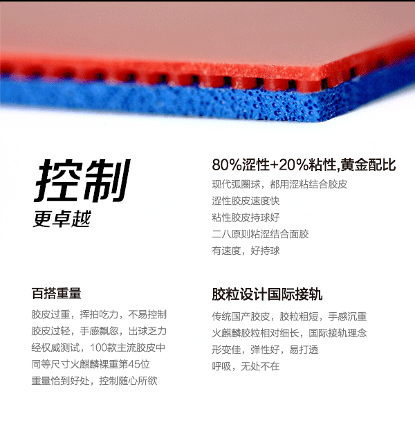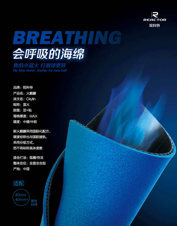 火麒麟,中国人自己的蓝火。进攻流畅,发力线性,手感忠实,全面易用。历时三年自主研发的蛋糕海绵,采用国际先进的发孔结构确保高弹无忧,神奇的蓝色经典海绵,对国人手感习惯的理解让你拉球无虞。优先适配复合纤维板及硬质夹板,让你打新球弧圈更快、弧线更长、更扎实。
