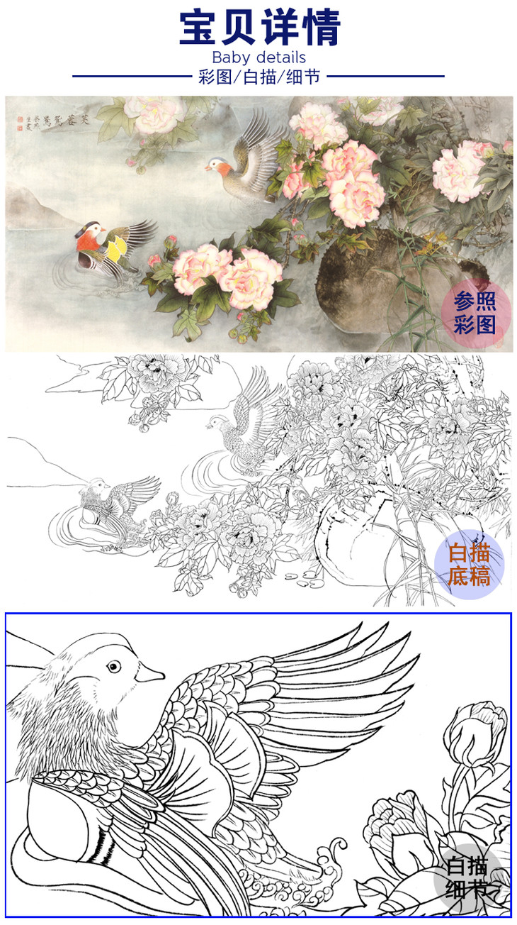 竖幅工笔花鸟白描底稿-周中耀樱花-染香《莺鸣一两啭樱花数重开》-多种白描尺寸可选-FV12