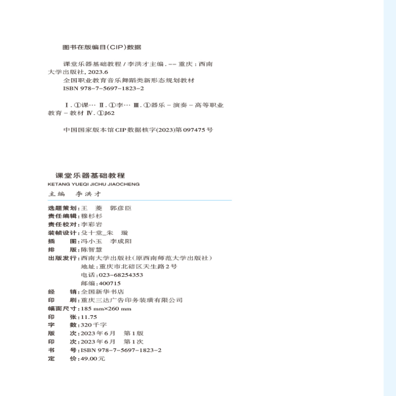 *书名:课堂乐器基础教程(十二孔陶笛、六孔竖笛) | *ISBN:978-7-5697-1823-2 |