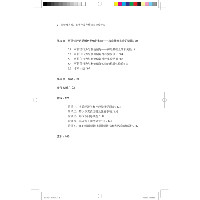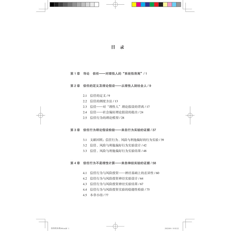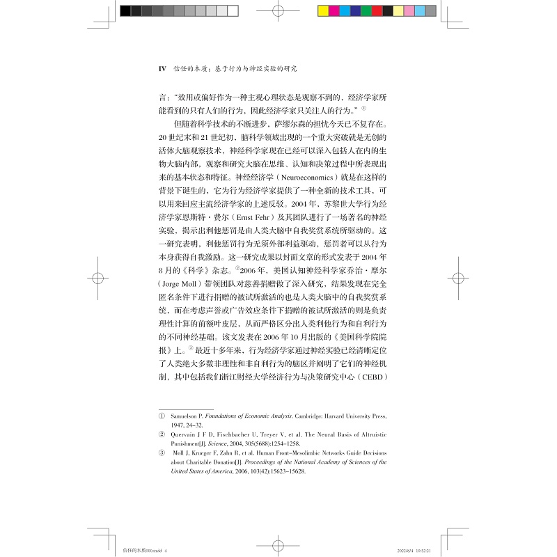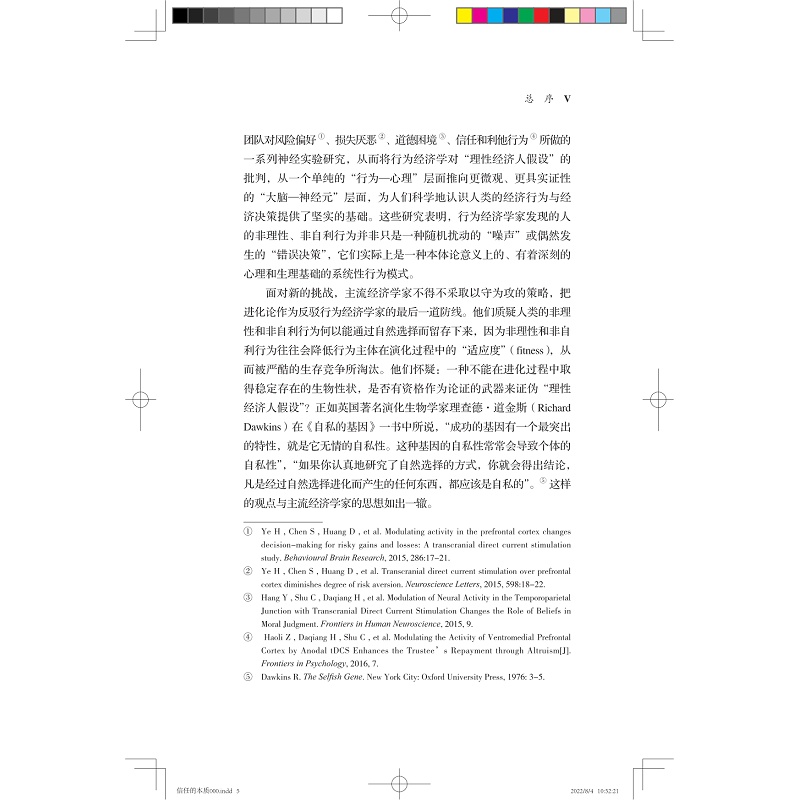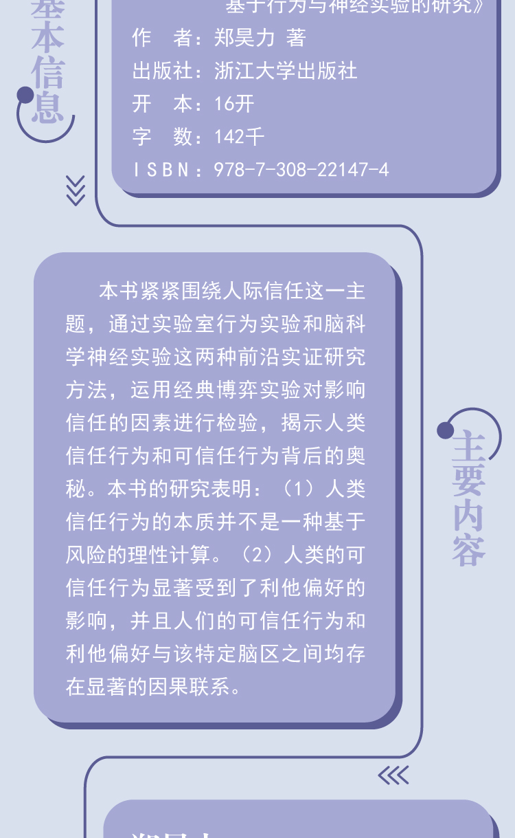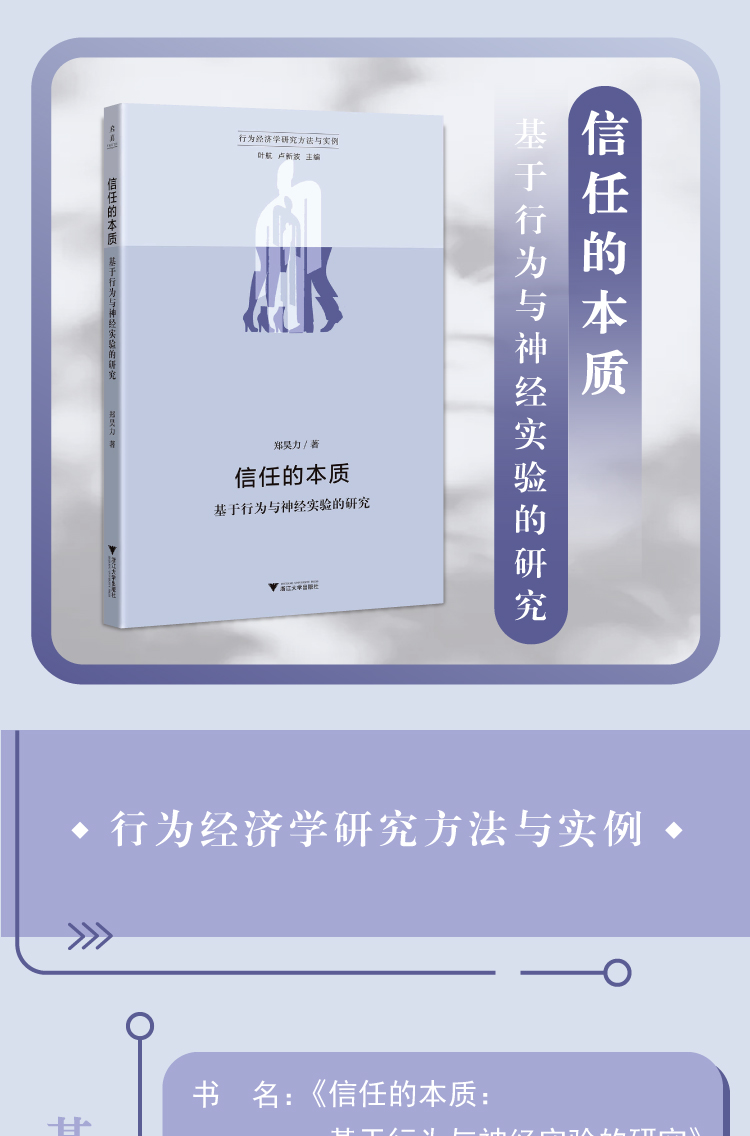 本书紧紧围绕人际信任这一主题,通过实验室行为实验和脑科学神经实验这两种前沿实证研究方法,运用经典博弈实验对影响信任的因素进行检验,揭示人类信任行为和可信任行为背后的奥秘。 本书的研究表明:(1)人类信任行为的本质并不是一种基于风险的理性计算。(2)人类的可信任行为显著受到了利他偏好的影响,并且人们的可信任行为和利他偏好与该特定脑区之间均存在显著的因果联系。
