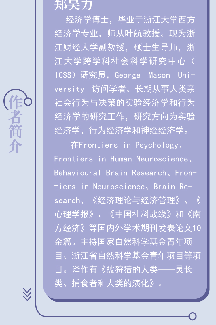 郑昊力,经济学博士,毕业于浙江大学西方经济学专业,师从叶航教授。现为浙江财经大学副教授,硕士生导师,浙江大学跨学科社会科学研究中心(ICSS)研究员,George Mason University 访问学者。长期从事人类亲社会行为与决策的实验经济学和行为经济学的研究工作,研究方向为实验经济学、行为经济学和神经经济学。