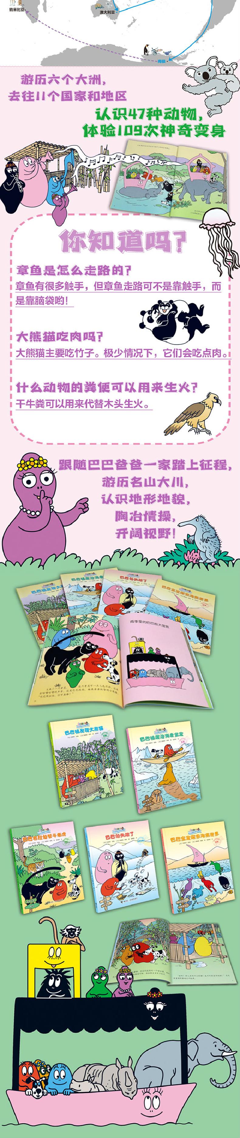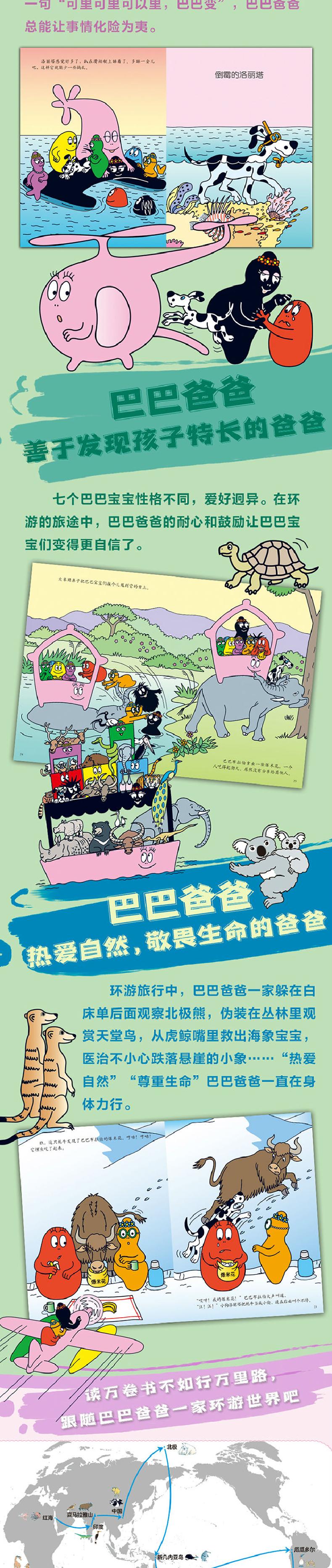 ★跟随巴巴爸爸一家游历亚洲、非洲、大洋洲、南美洲、南极洲和北冰洋,去往11个国家和地区,认识47种动物,体验109次神奇变身!